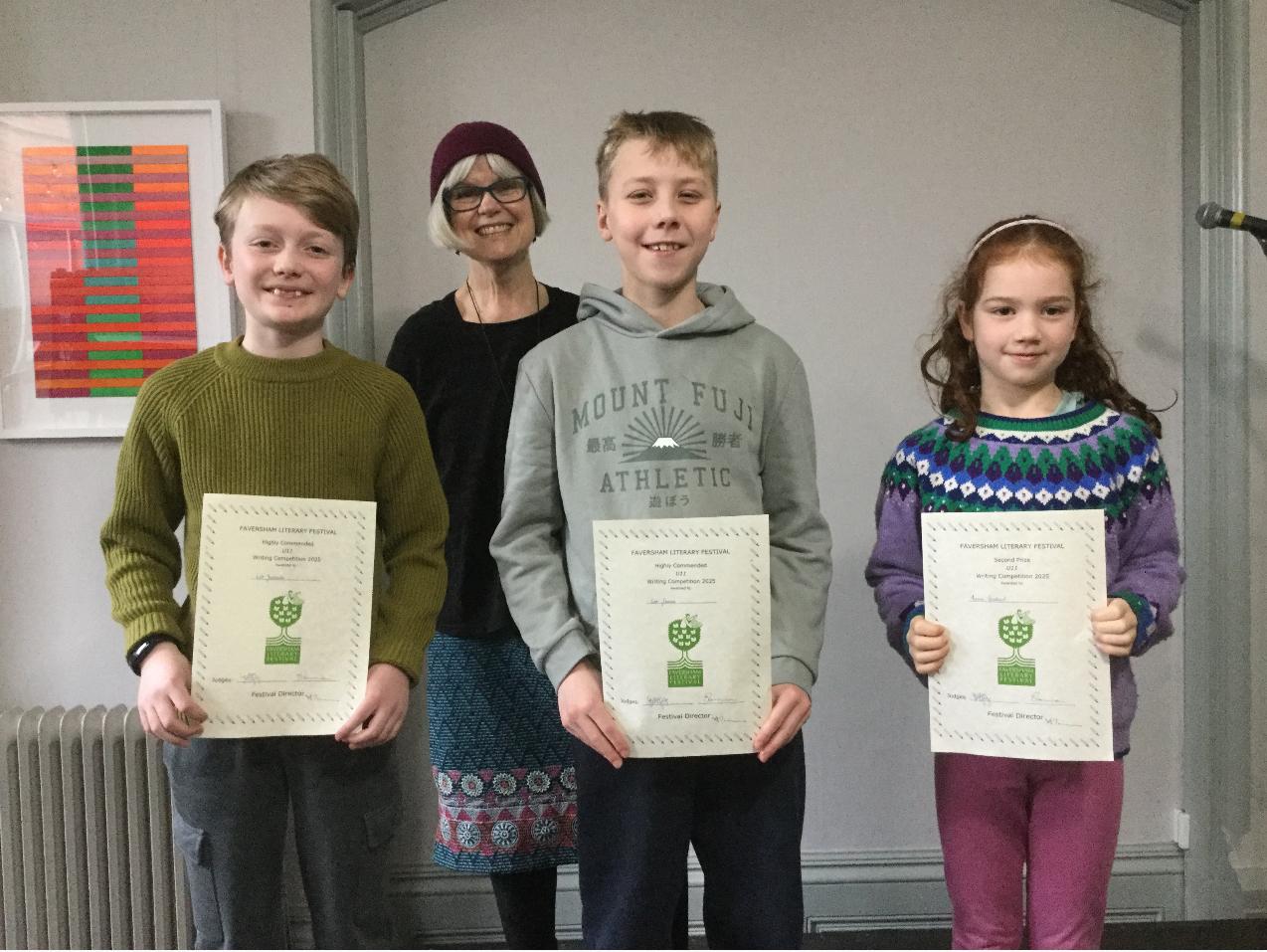 Our children who were successful in the Faversham Literacy Awards attended a presentation event this morning. Anna received the second prize for her entry and both Léo and Leo were 'highly commended'. All children received certificates, book tokens and entry to the Onjali Rauf talk. Congratulations to everyone who entered!