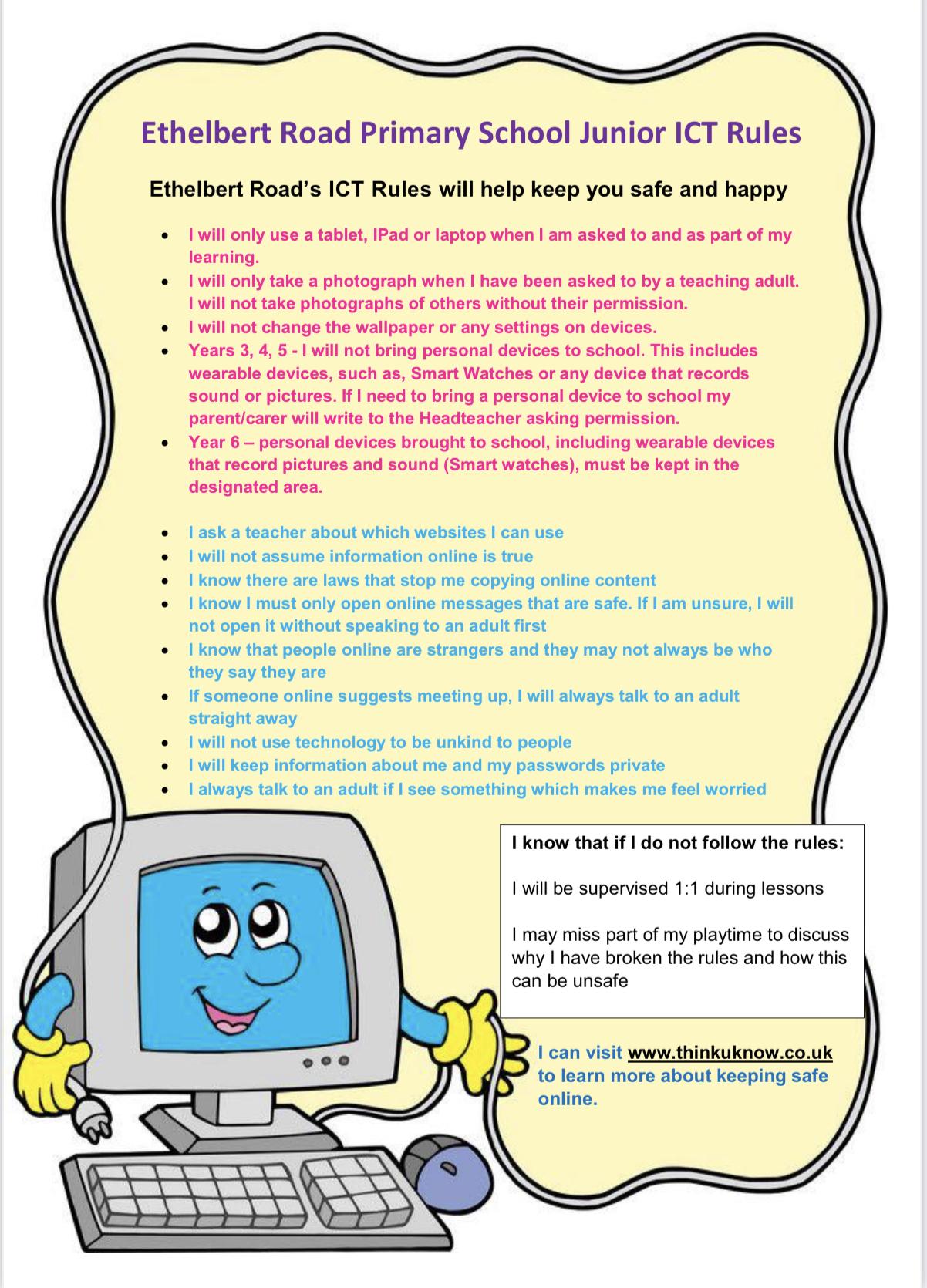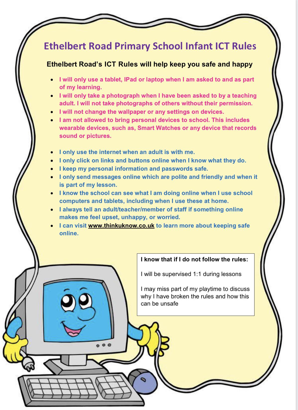 ​Online safety is an important part of keeping children safe at Ethelbert Road Primary School, therefore Online Safety is taught to all pupils. Our curriculum empowers children to understand and be aware how they can to stay safe and behave appropriately online, but we can only be successful in keeping children safe online if we work with you.