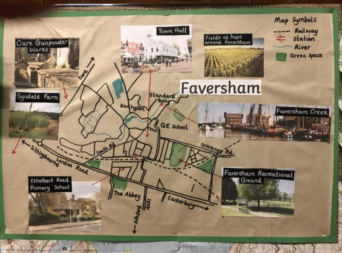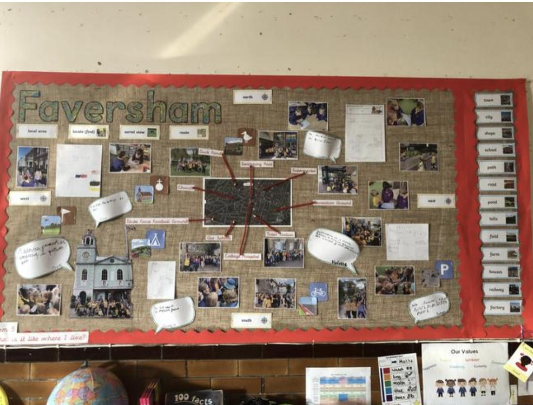 Fieldwork and map skills are further developed in KS1 with a study of our local area, using cardinal points of a compass. Maps are introduced through familiar stories as a way to communicate what the place and space is like. Pupils retrieve and apply knowledge about human and physical features in their local context. Simple keys and features are identified and mapped locally to help begin to understand place, distance and scale. Pupils study a variety of places including Faversham Town (Year 1) and a local farm (Year 2); this helps them to connect different geographical concepts and gives them perspectives and opportunities to compare and contrast locations.