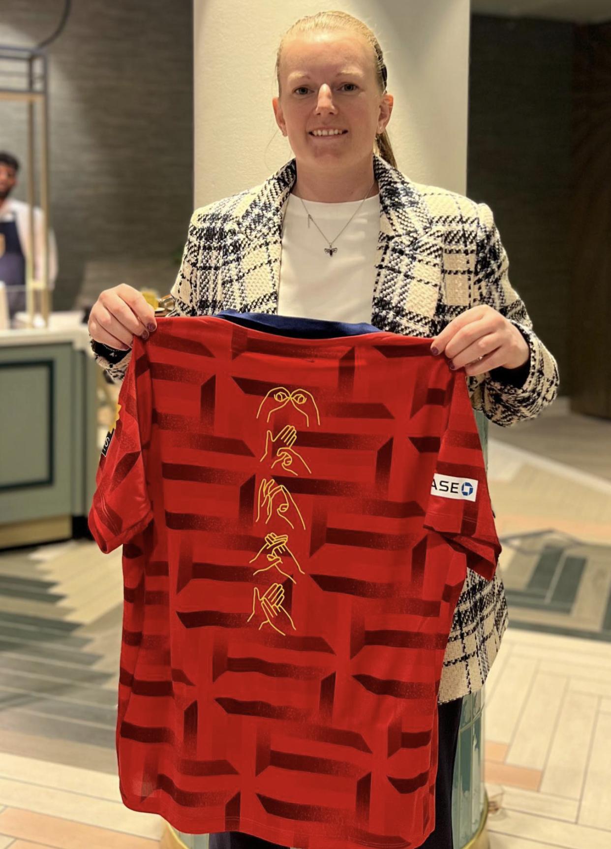 Miss Brown and the England deaf futsal team were invited to watch the England women’s team in the Royal Box. They were presented with the warm up tops the women’s team wore which had their names on in sign language.