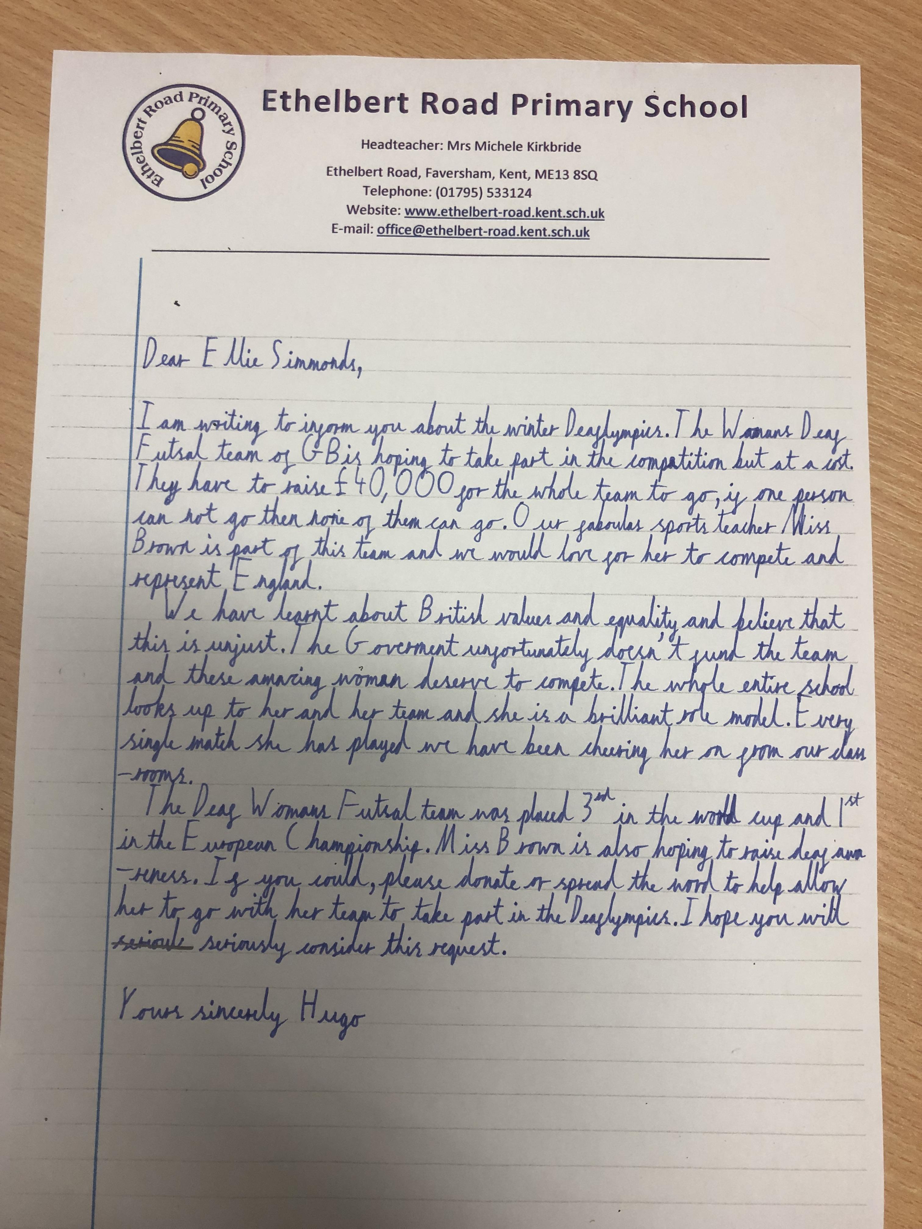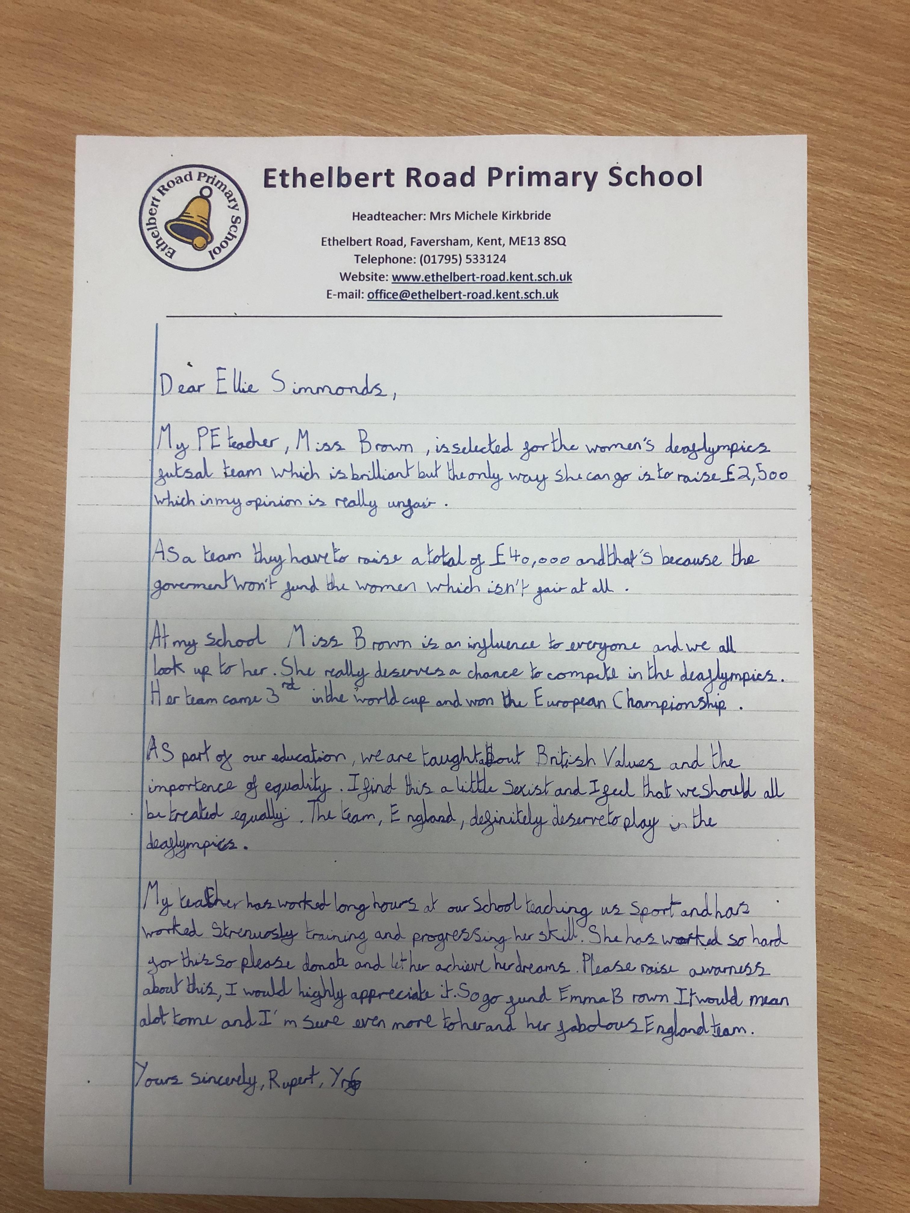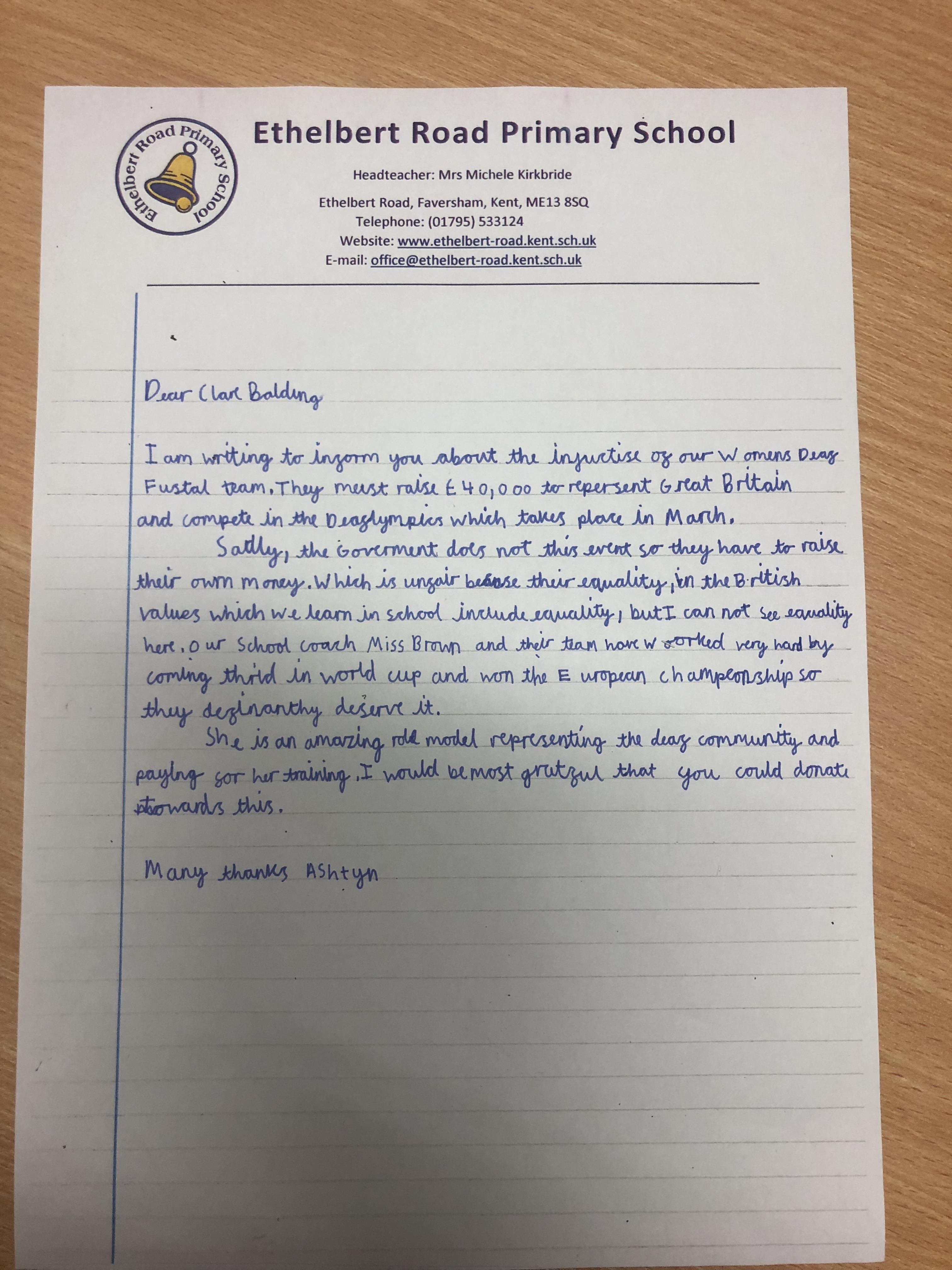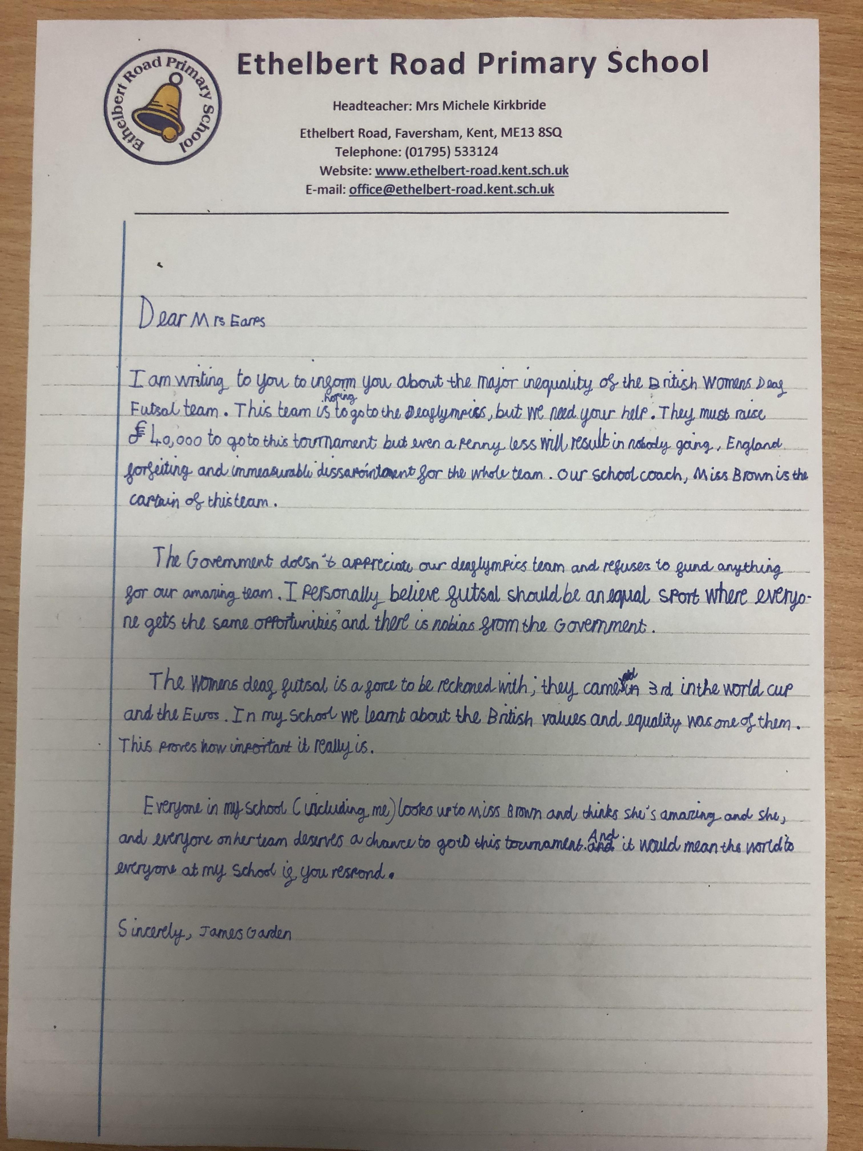 Our amazing Year 6 children have written to sporting heroes to inform them of Miss Brown and the GB Futsal teams fight to get to the Deafolympics. They were shocked to find out that the team players must raise the funds needed to go to this event, even though they are representing Great Britain! The children linked this to the British Value of Equality and felt this value was not being used by the government in this case. Here are some of their powerful letters.