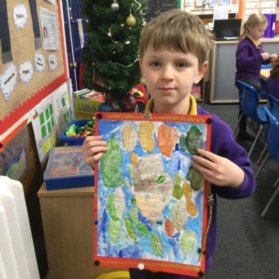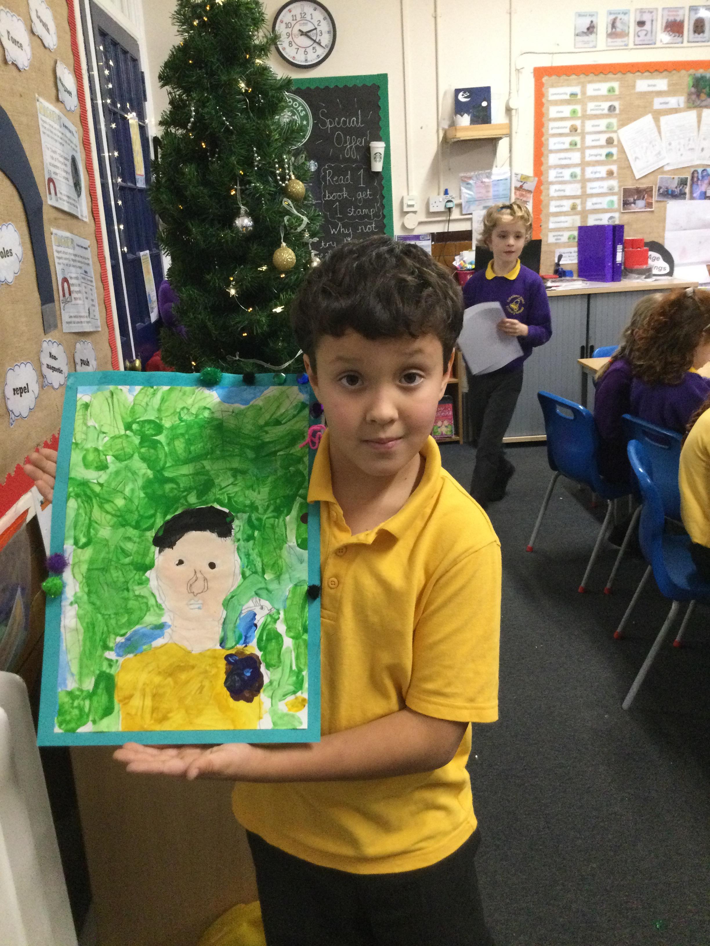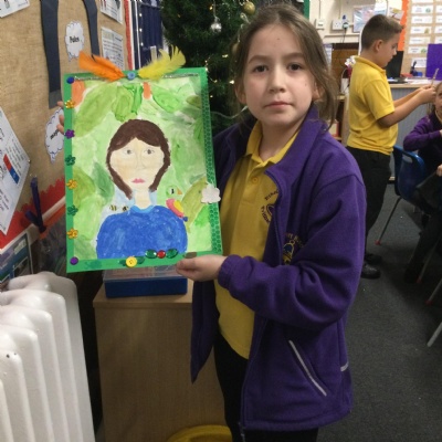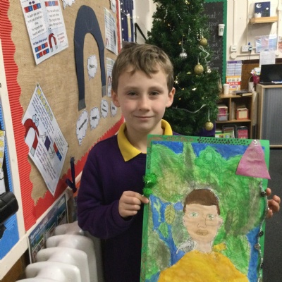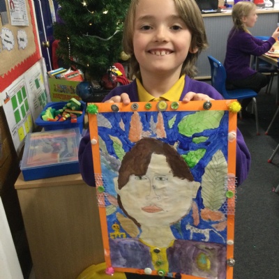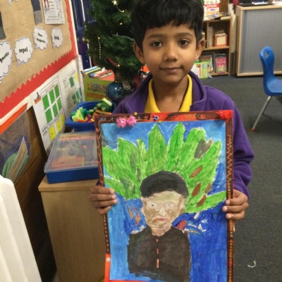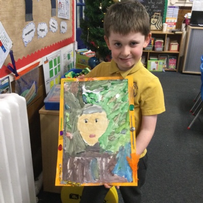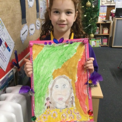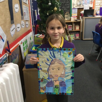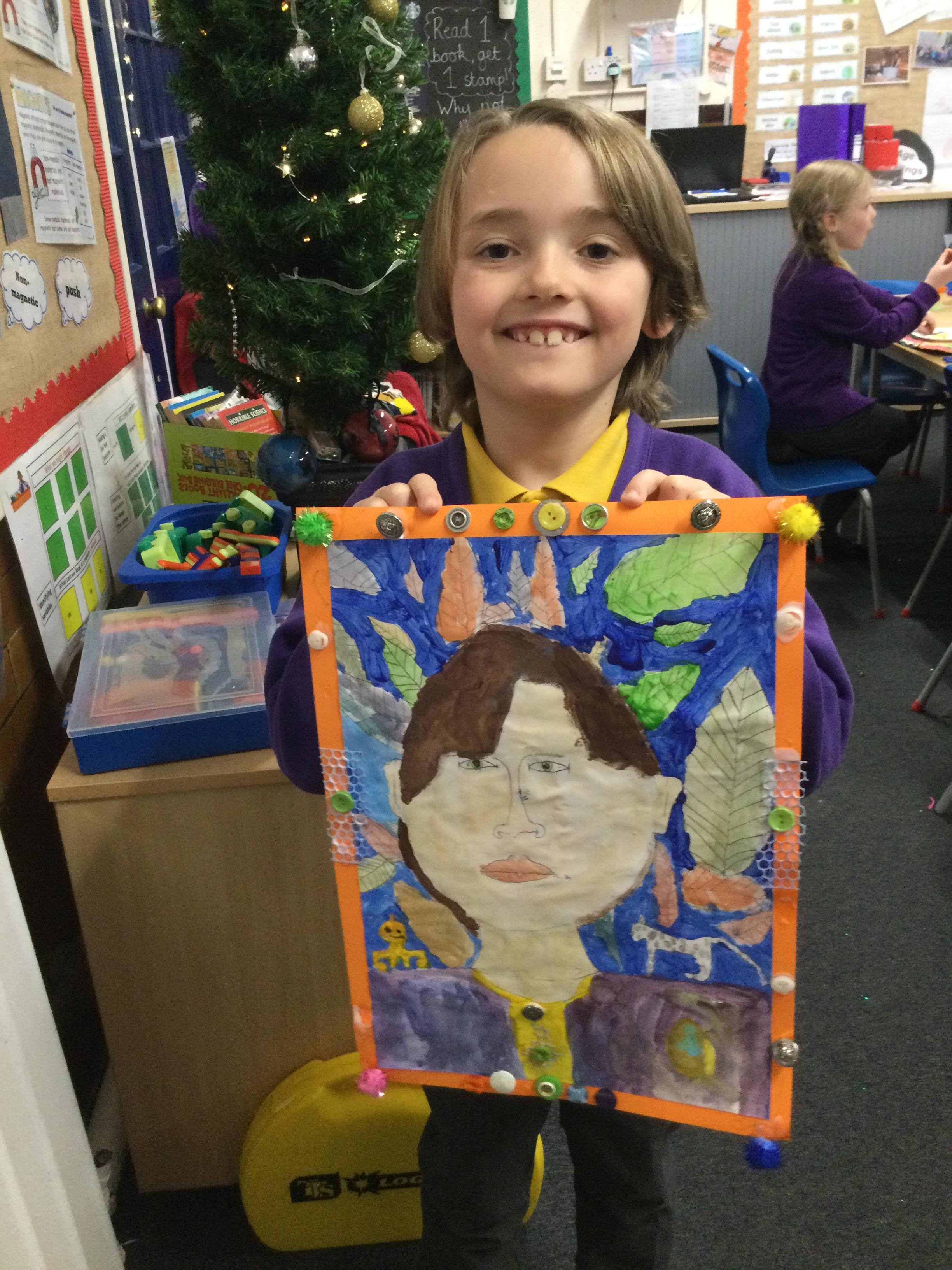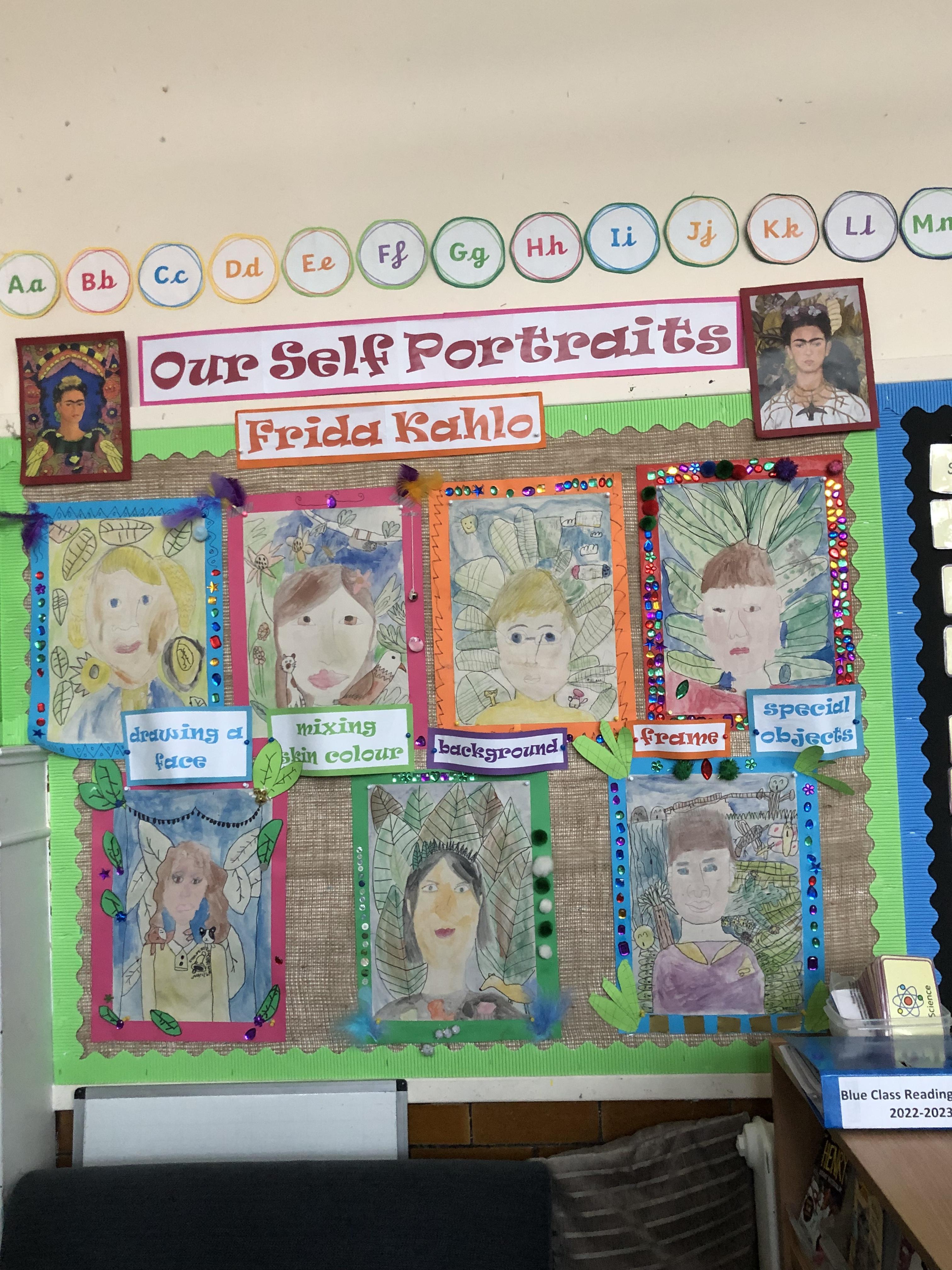 Year 3 have been learning how to draw a self-portrait. They looked at the work of Frida Kahlo and took inspiration from her self-portraits, in particular her Self Portait with Thorn Necklace and Hummingbird. They learned how to draw a face to include the correct proportions and positions of eyes, nose, mouth ears and hair. They included a leafy background and " special objects" on their shoulders - just like Frida! They then learned how to mix colours to create a realistic skin tone before painting their self-portrait. A decorative frame completed their amazing work.