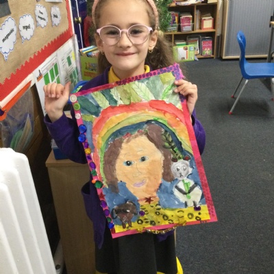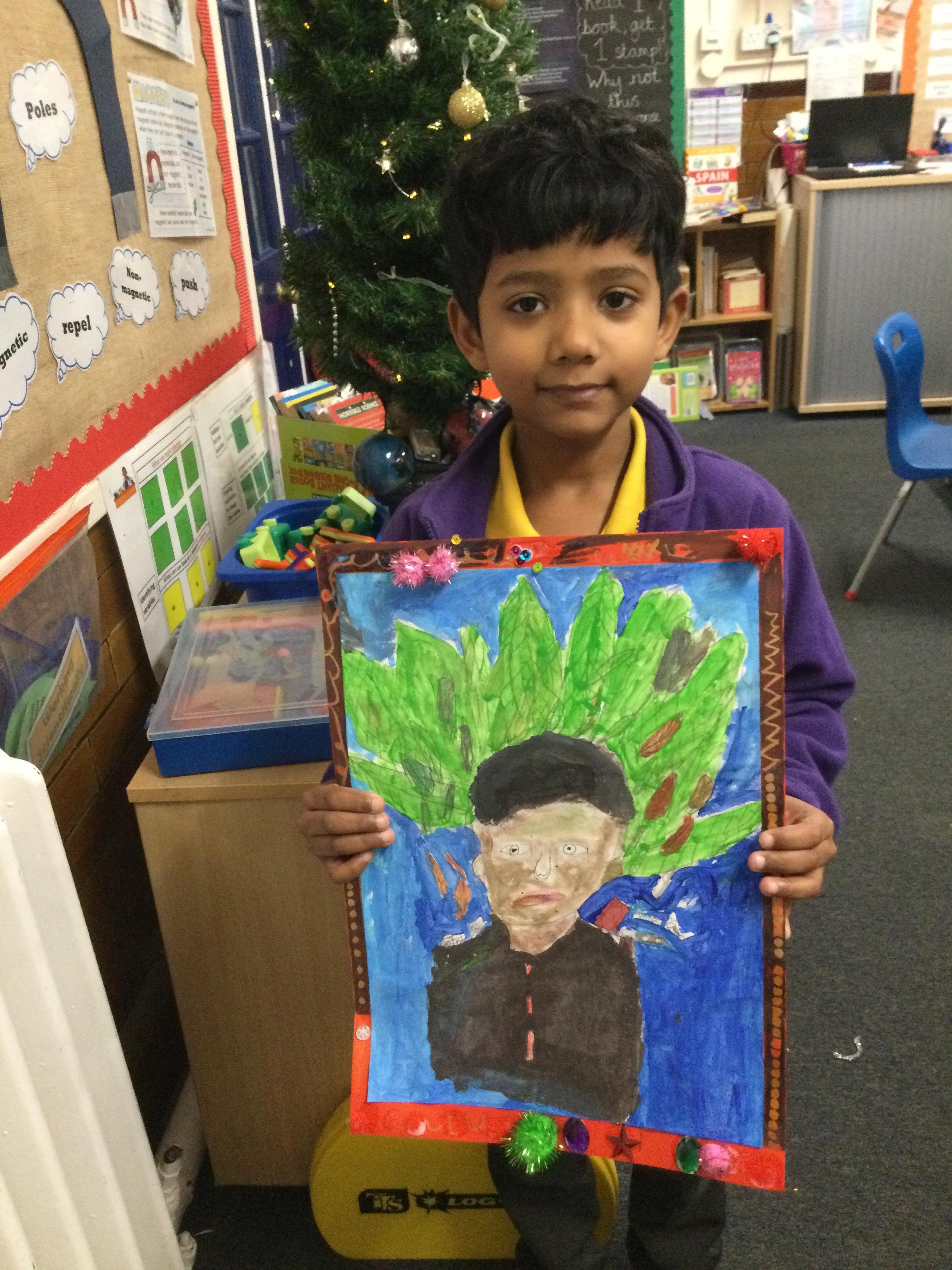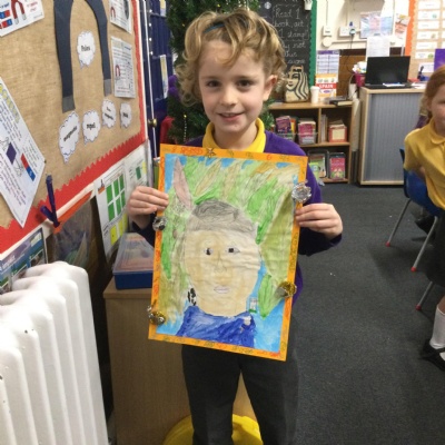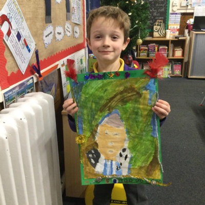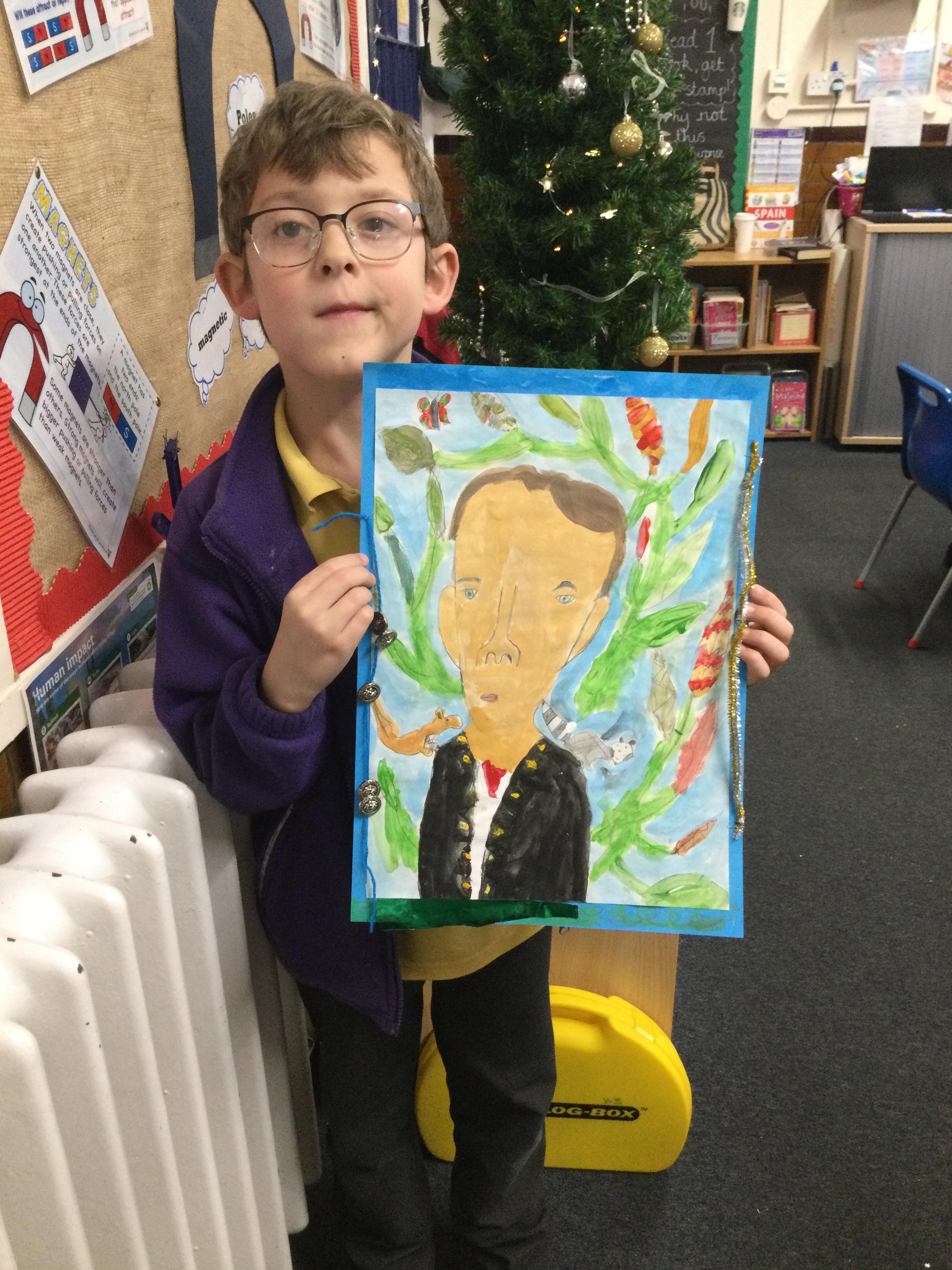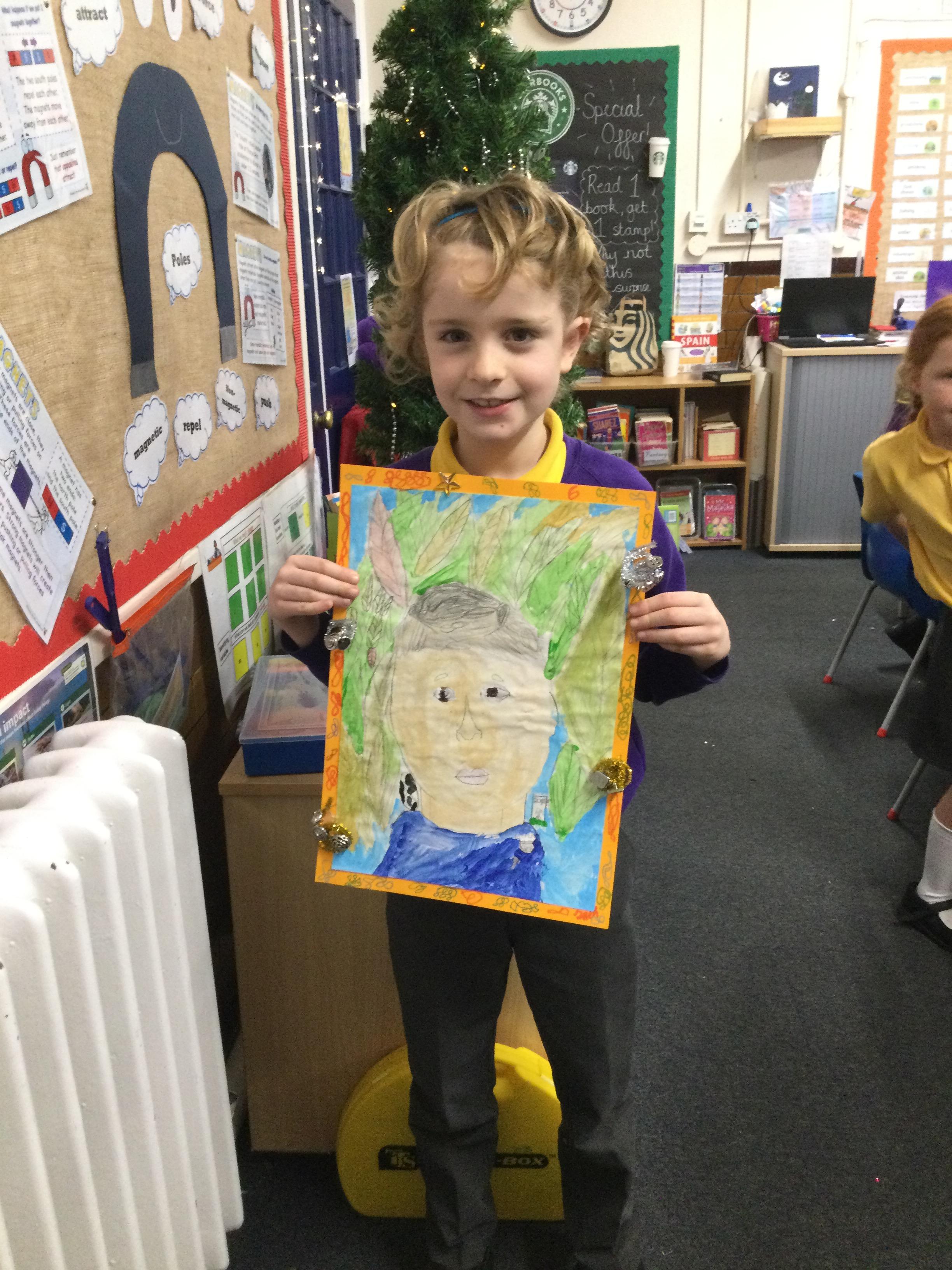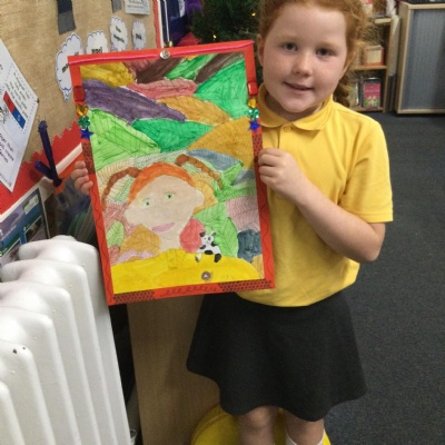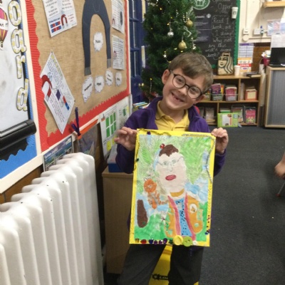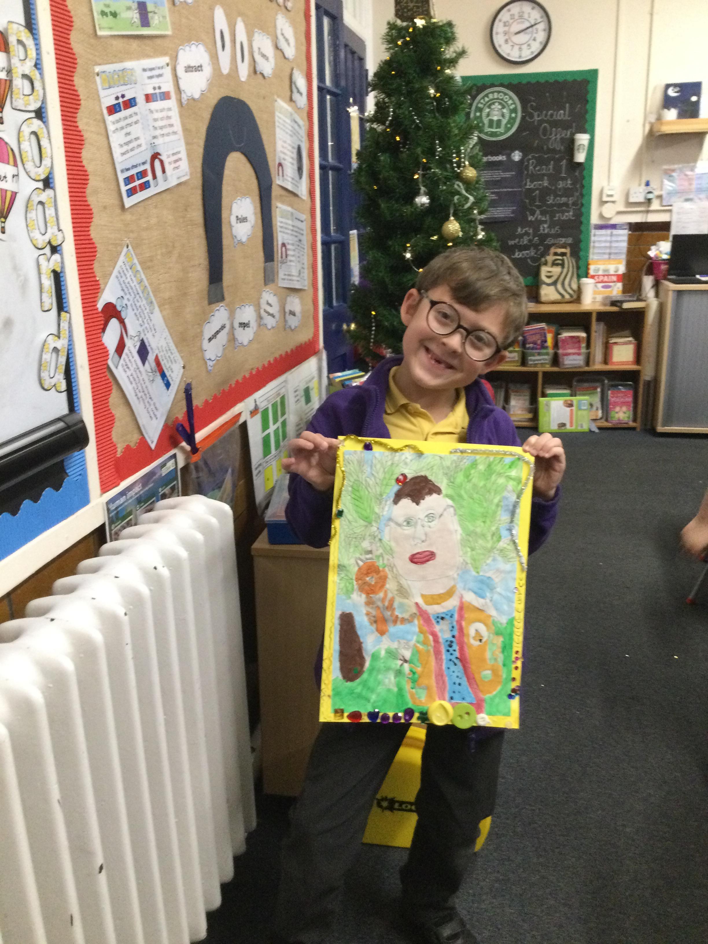 Year 3 have been learning how to draw a self-portrait. They looked at the work of Frida Kahlo and took inspiration from her self-portraits, in particular her Self Portait with Thorn Necklace and Hummingbird. They learned how to draw a face to include the correct proportions and positions of eyes, nose, mouth ears and hair. They included a leafy background and " special objects" on their shoulders - just like Frida! They then learned how to mix colours to create a realistic skin tone before painting their self-portrait. A decorative frame completed their amazing work.