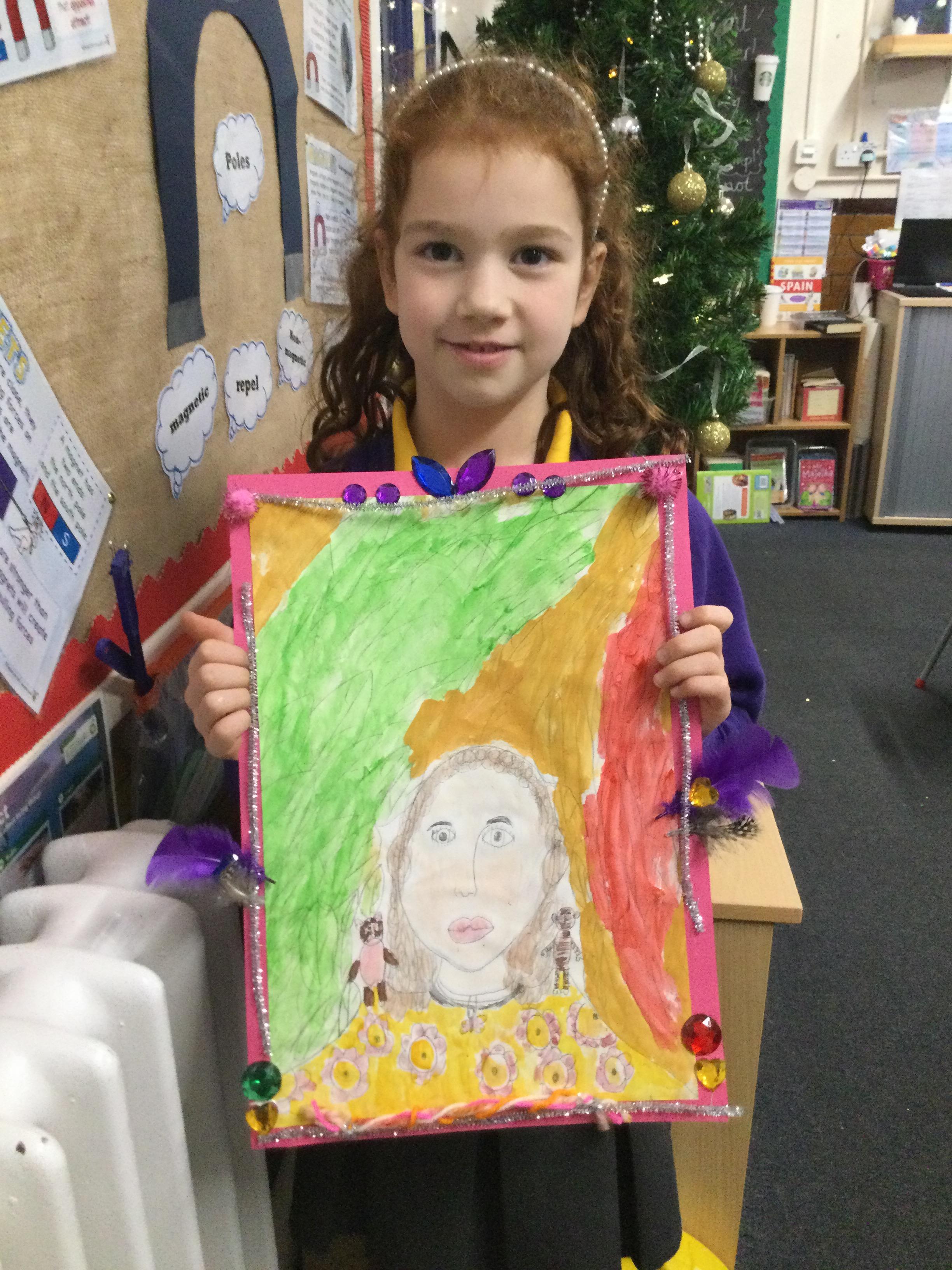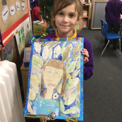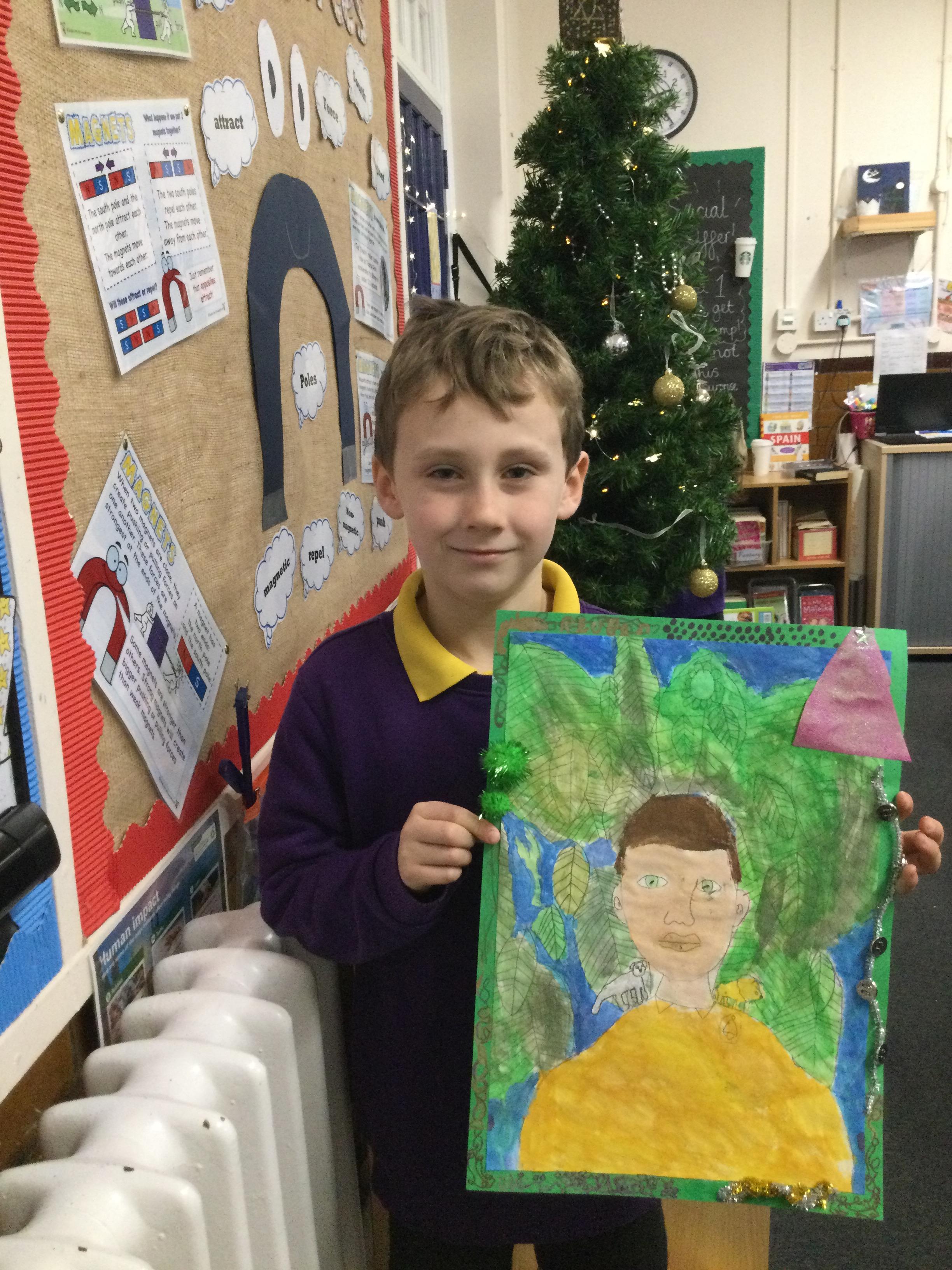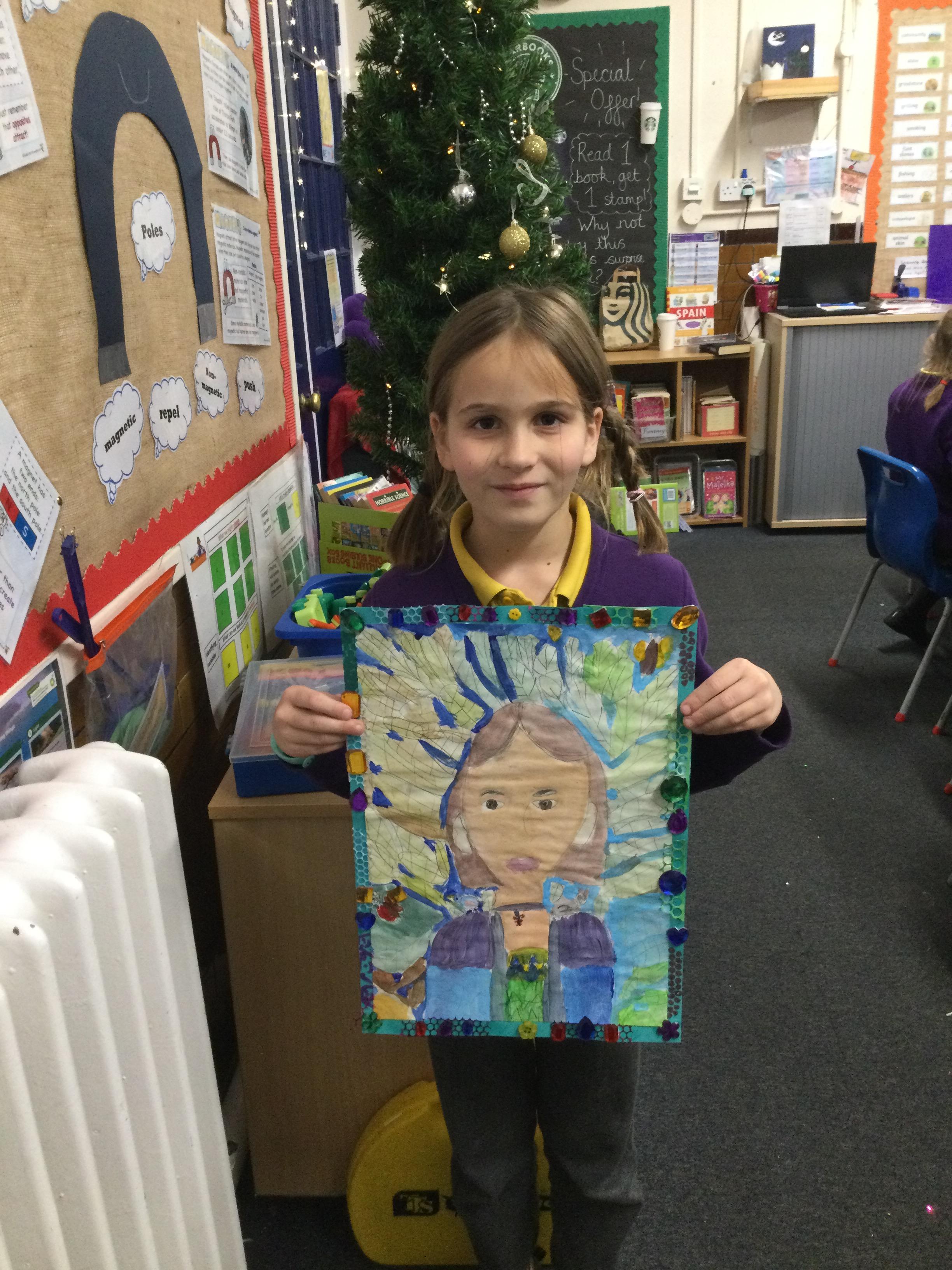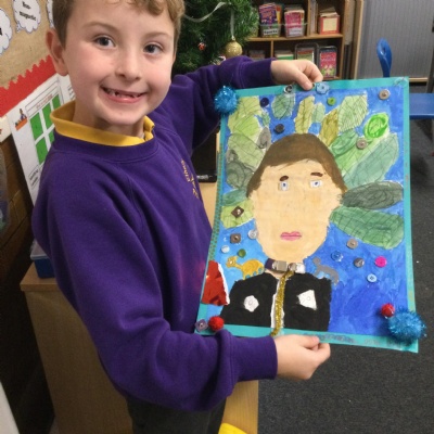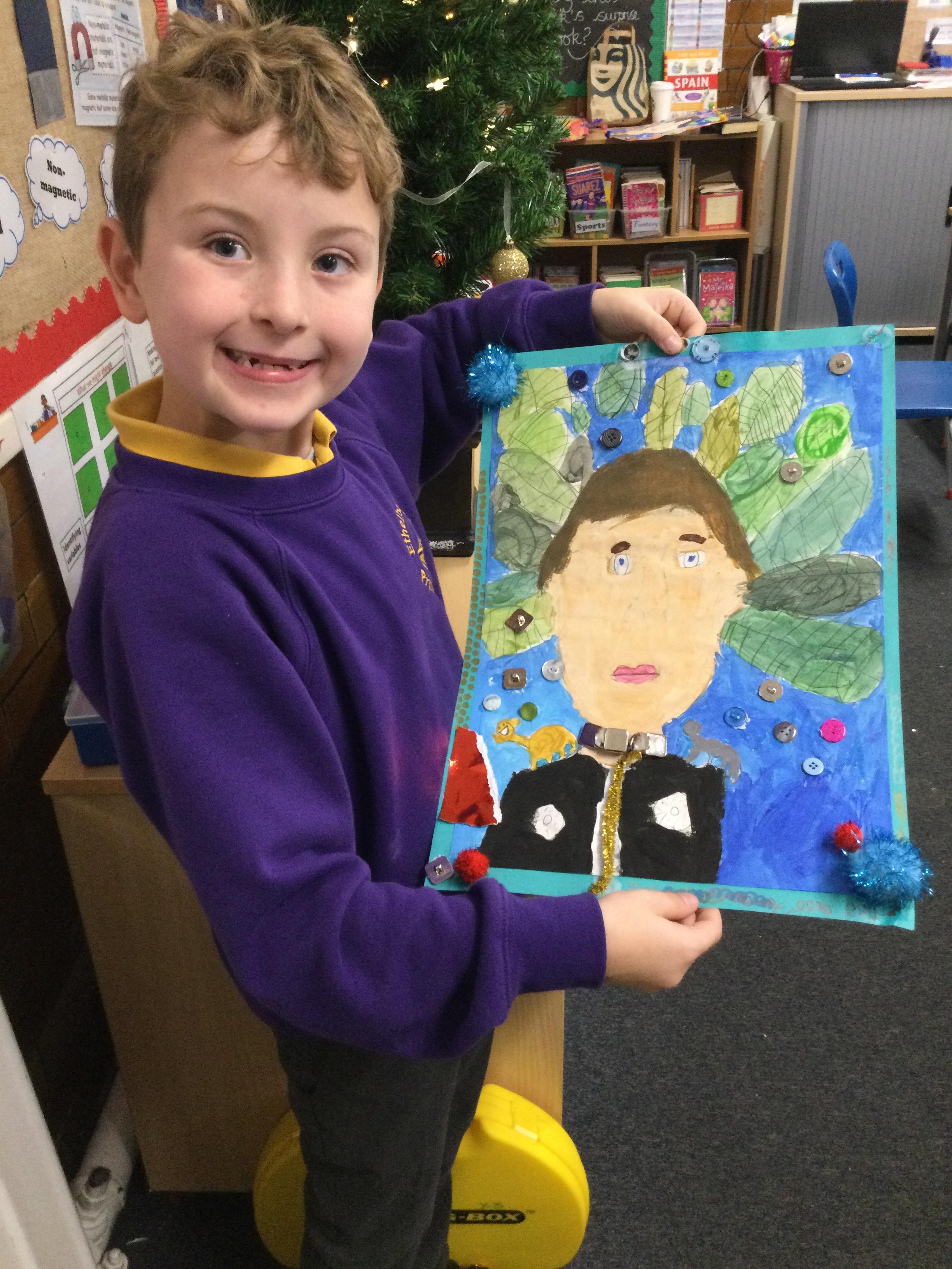 Year 3 have been learning how to draw a self-portrait. They looked at the work of Frida Kahlo and took inspiration from her self-portraits, in particular her Self Portait with Thorn Necklace and Hummingbird. They learned how to draw a face to include the correct proportions and positions of eyes, nose, mouth ears and hair. They included a leafy background and " special objects" on their shoulders - just like Frida! They then learned how to mix colours to create a realistic skin tone before painting their self-portrait. A decorative frame completed their amazing work.
