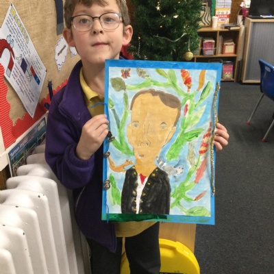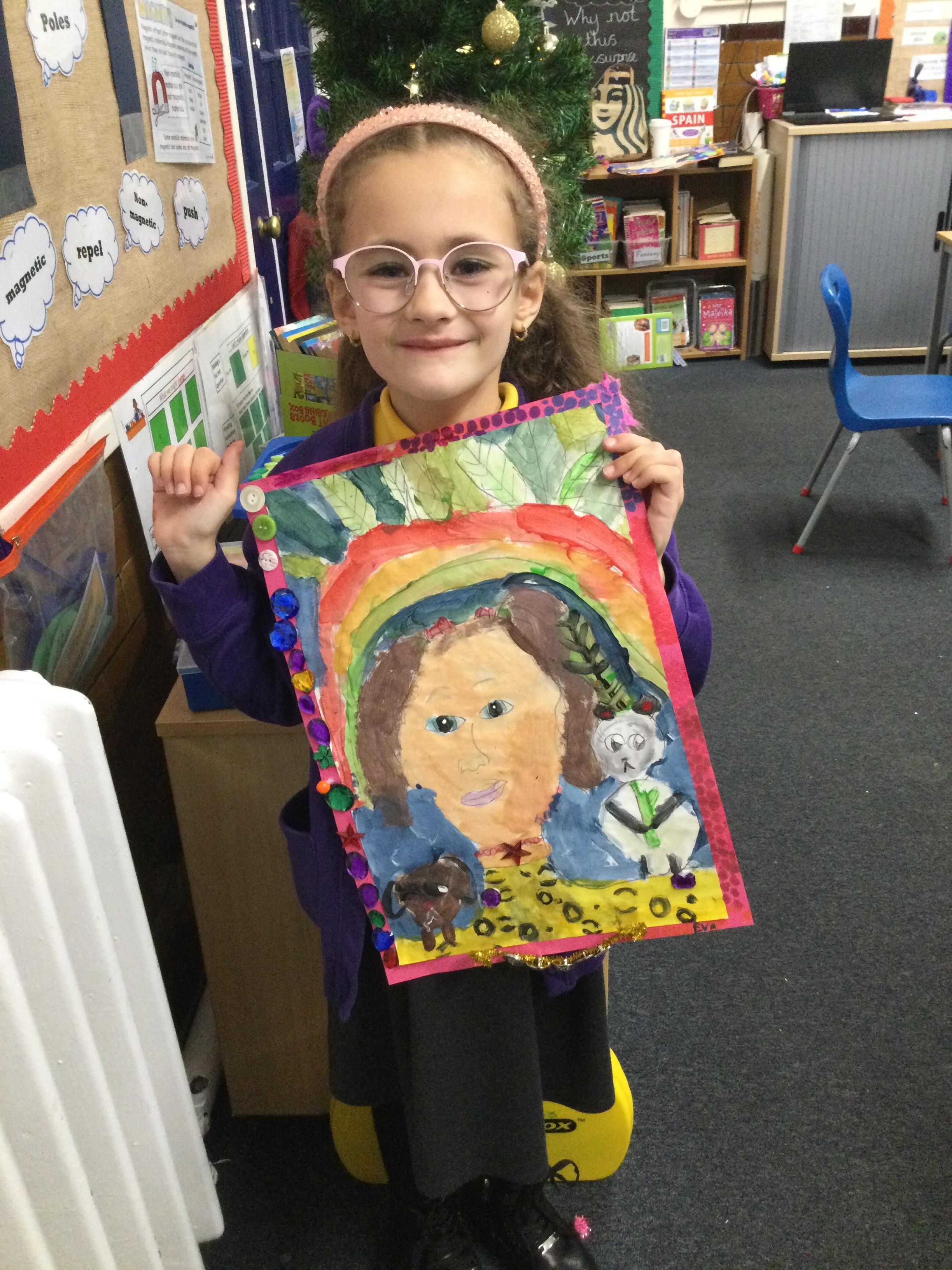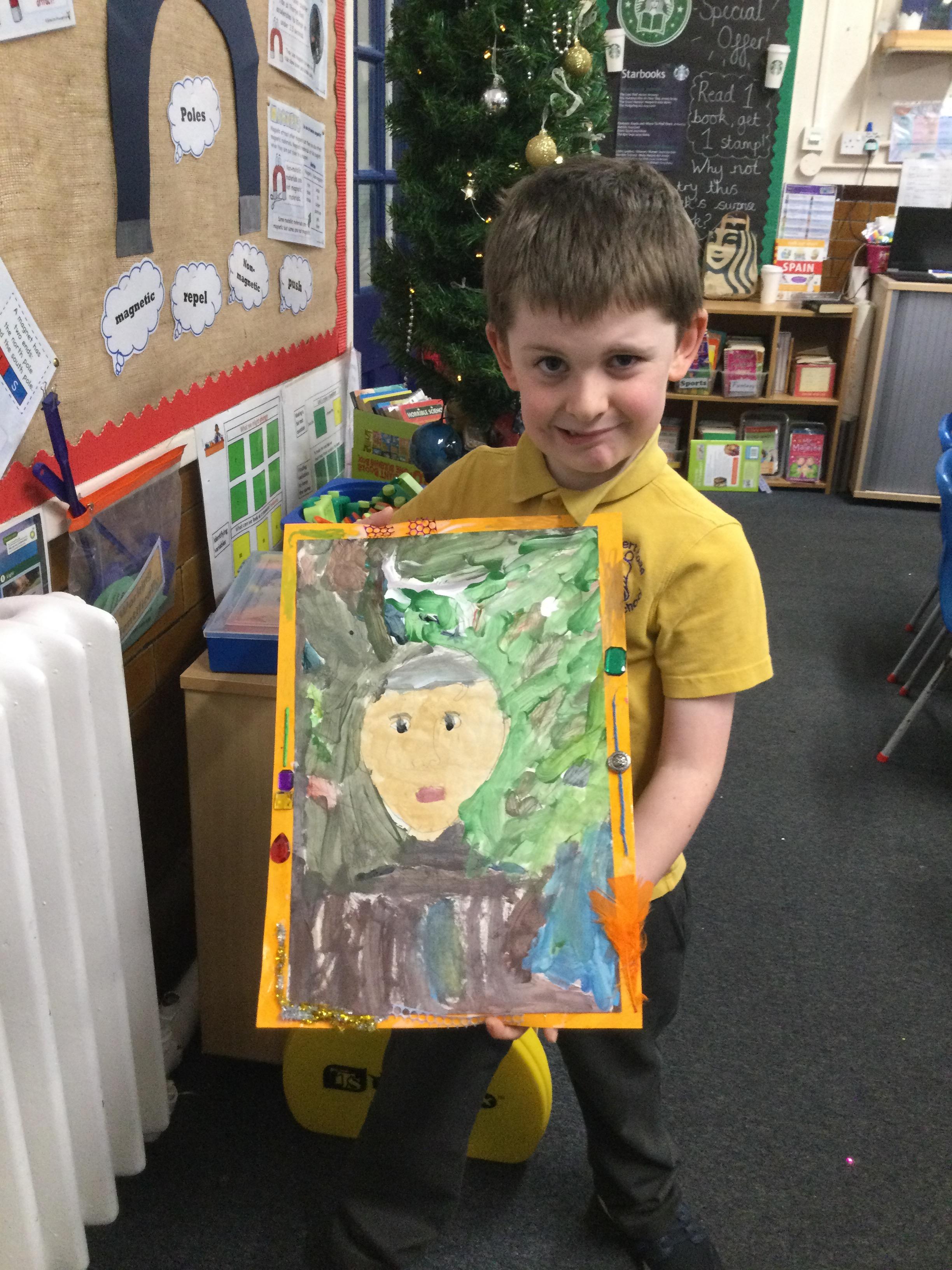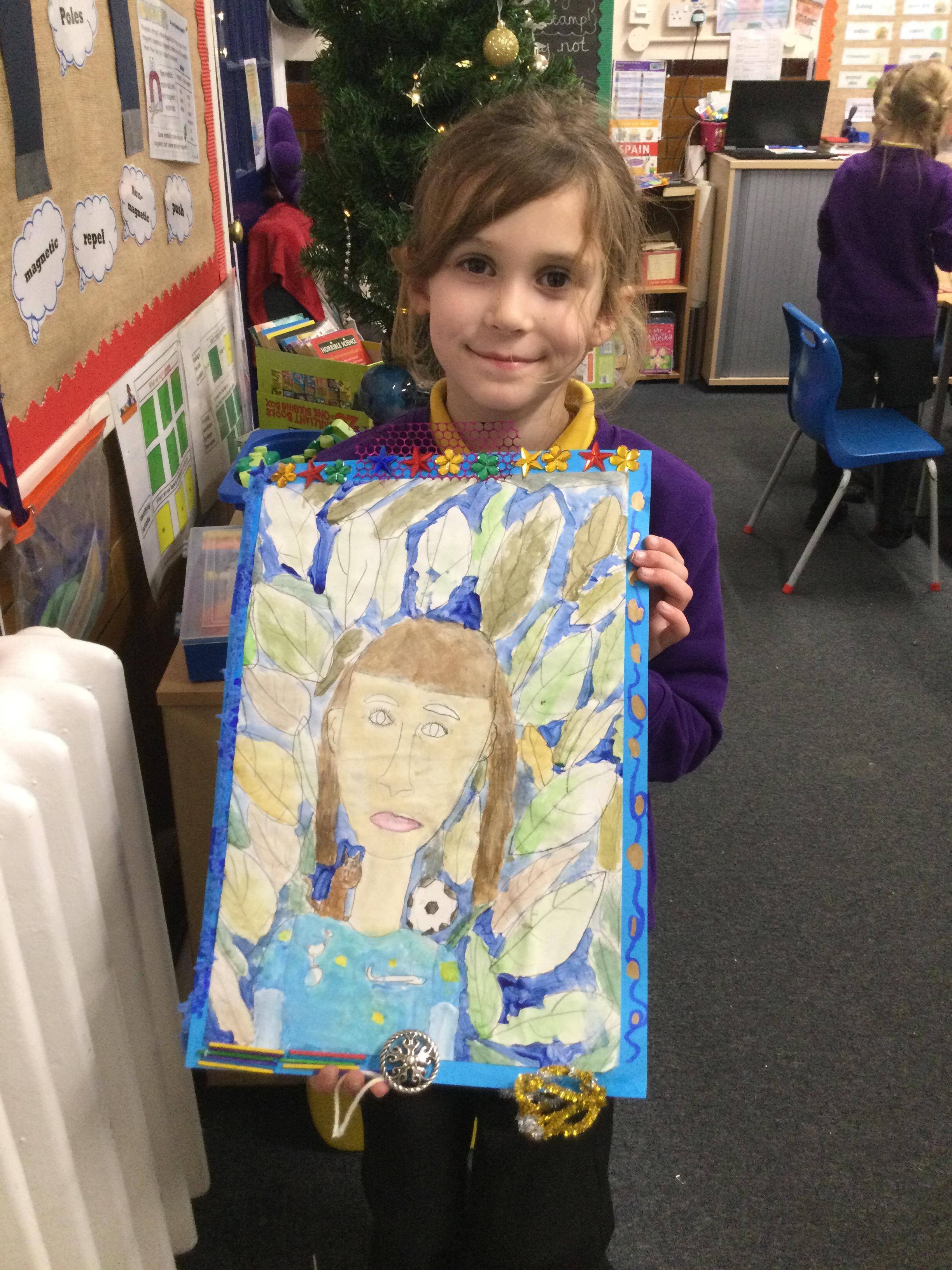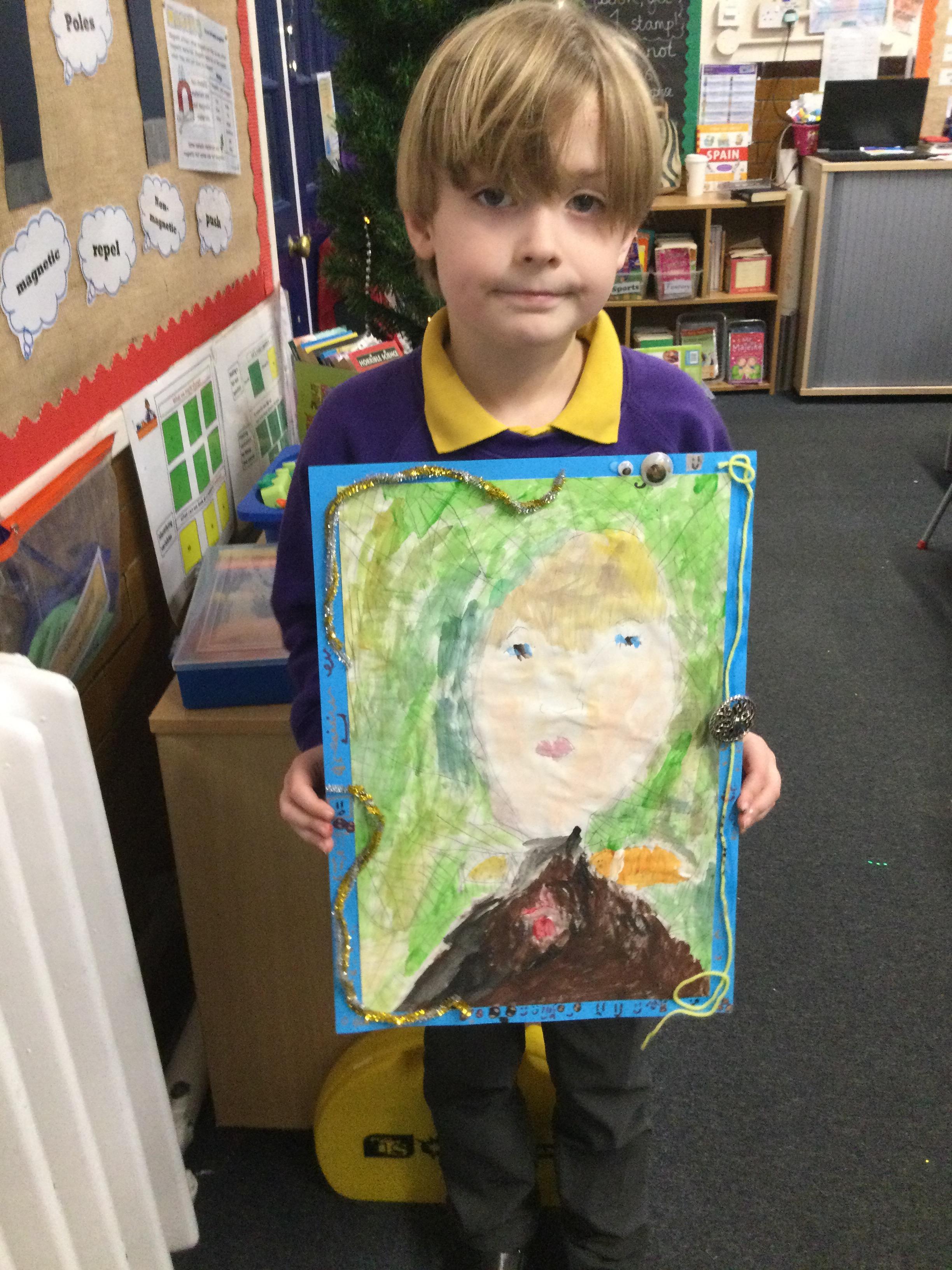 Year 3 have been learning how to draw a self-portrait. They looked at the work of Frida Kahlo and took inspiration from her self-portraits, in particular her Self Portait with Thorn Necklace and Hummingbird. They learned how to draw a face to include the correct proportions and positions of eyes, nose, mouth ears and hair. They included a leafy background and " special objects" on their shoulders - just like Frida! They then learned how to mix colours to create a realistic skin tone before painting their self-portrait. A decorative frame completed their amazing work.