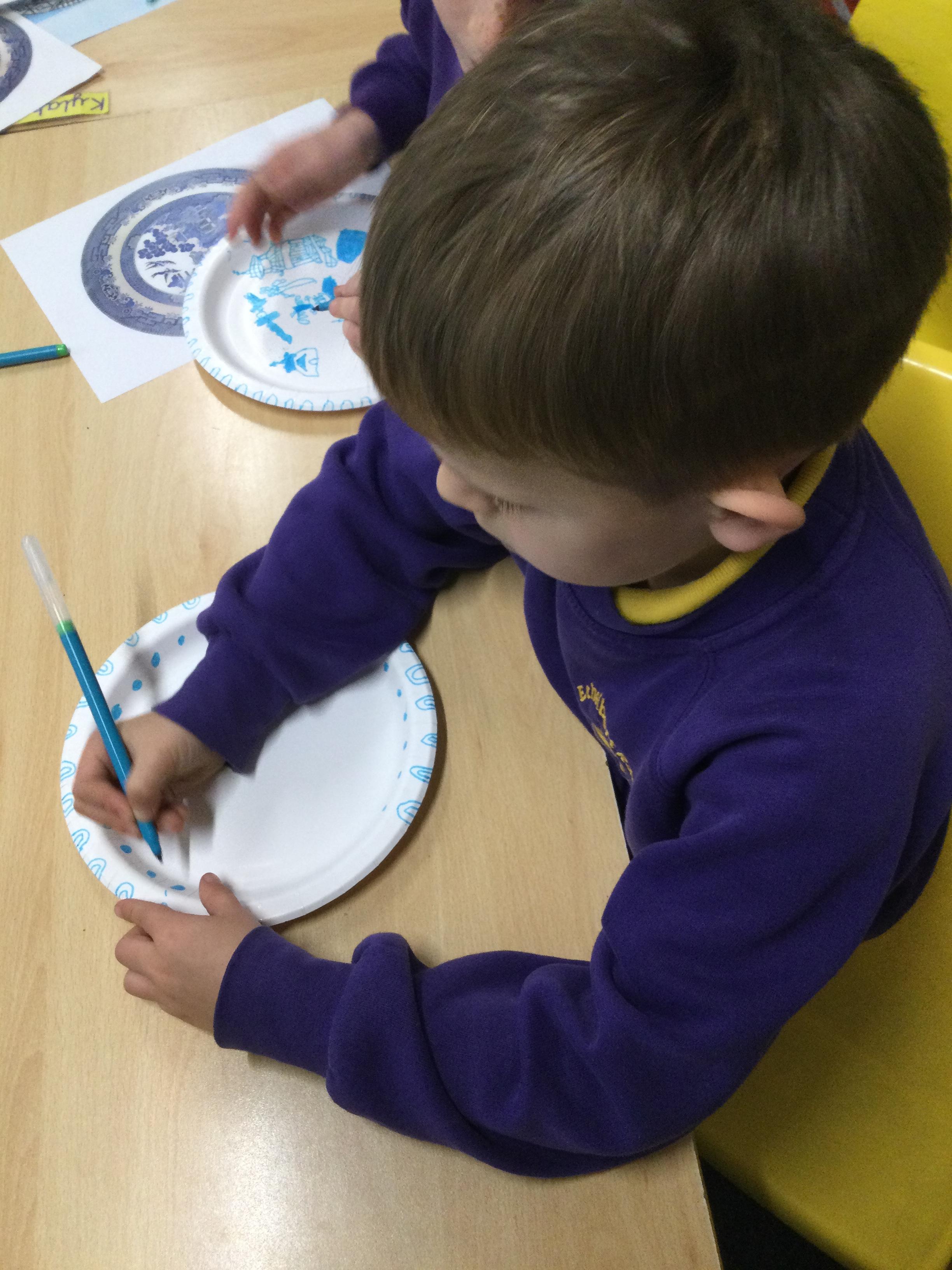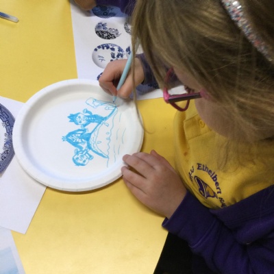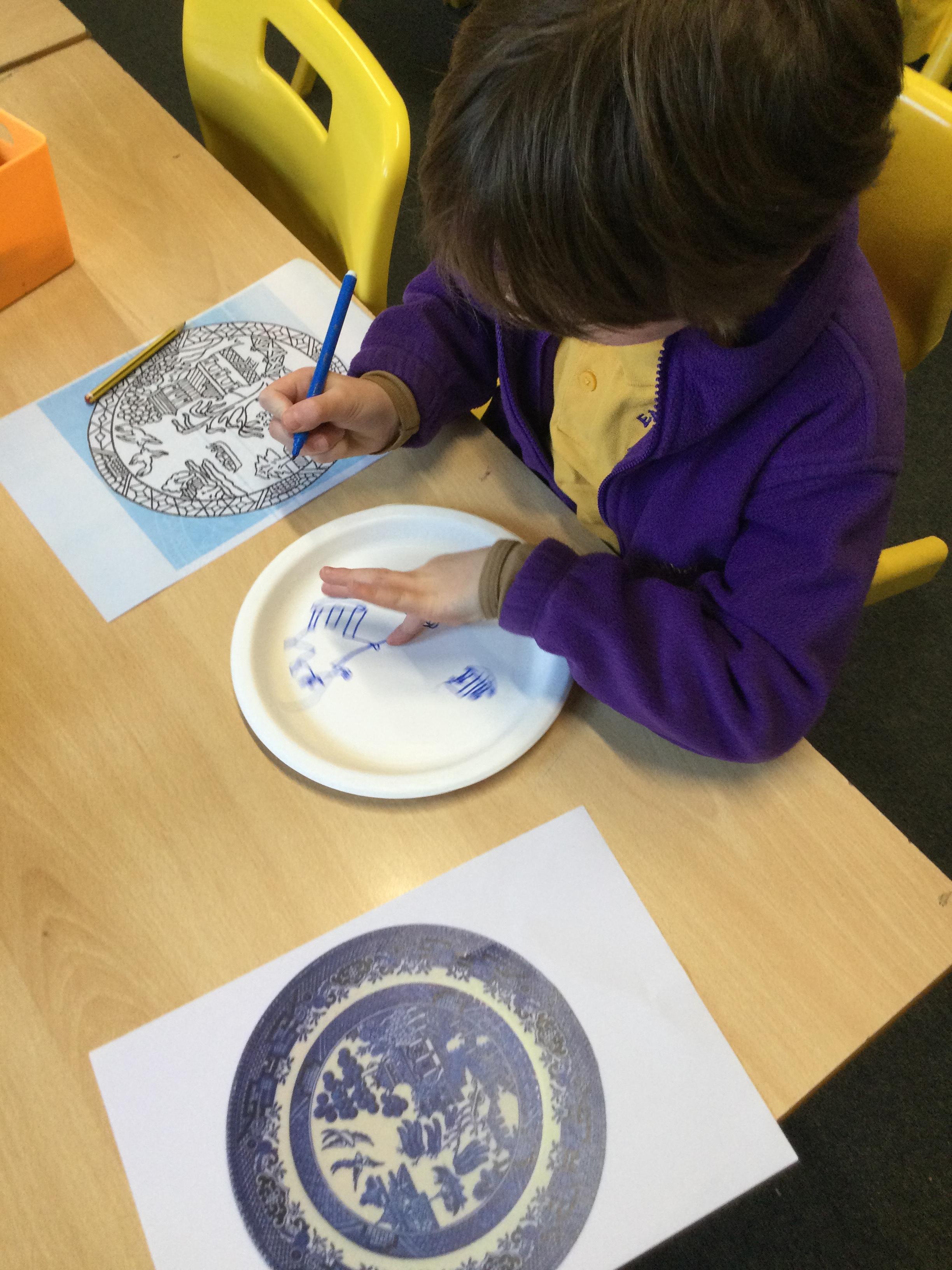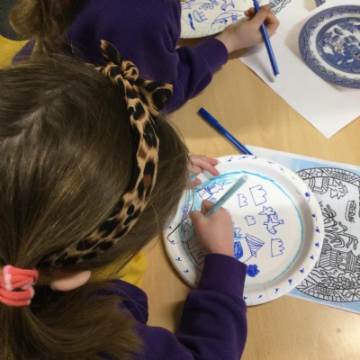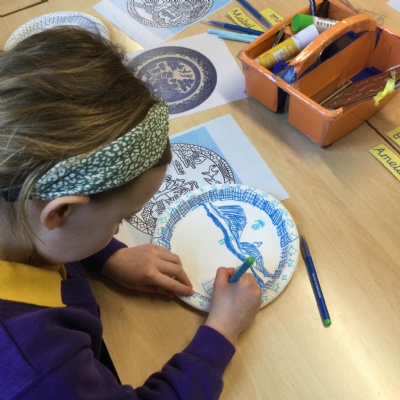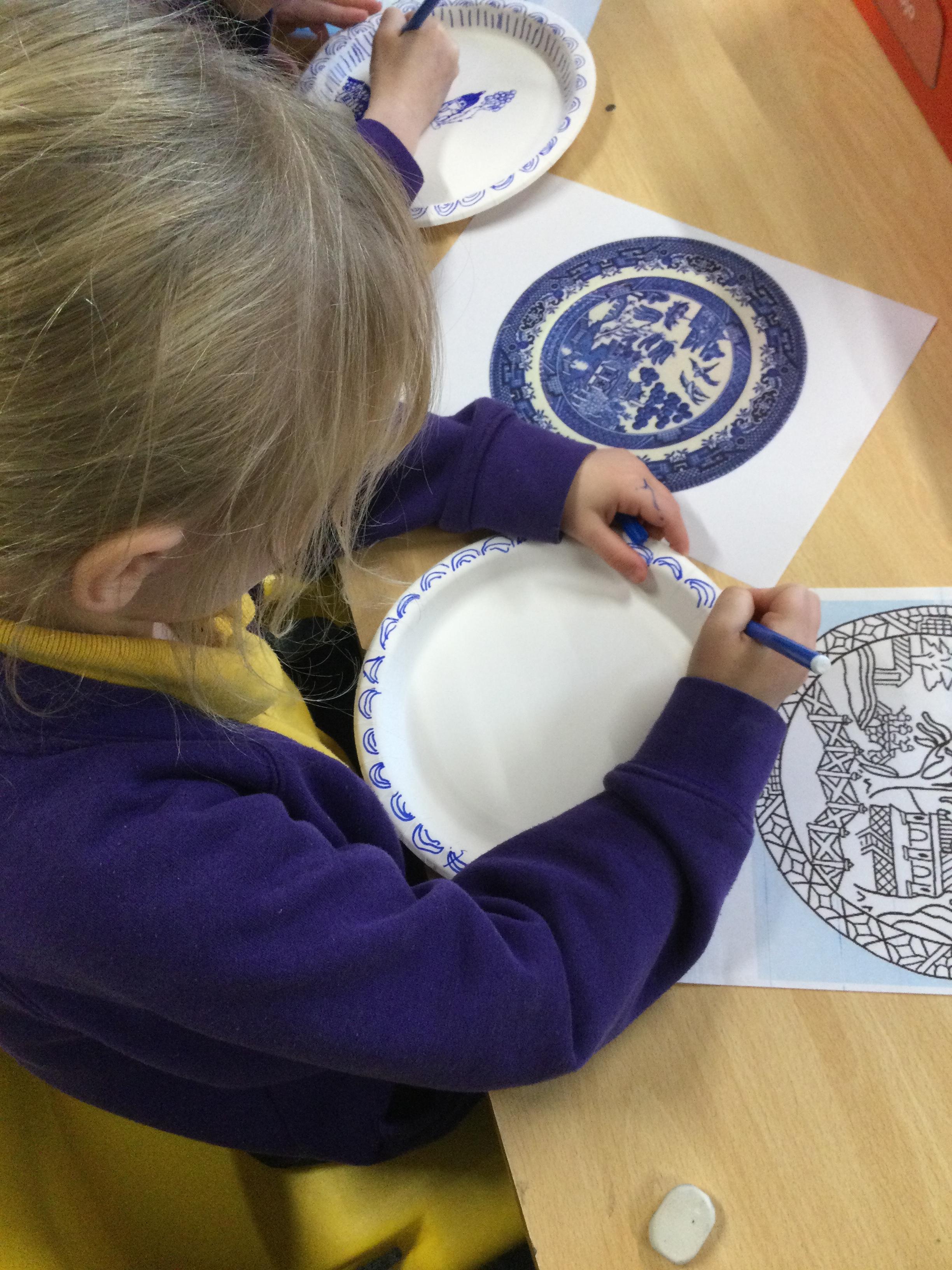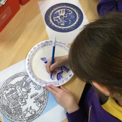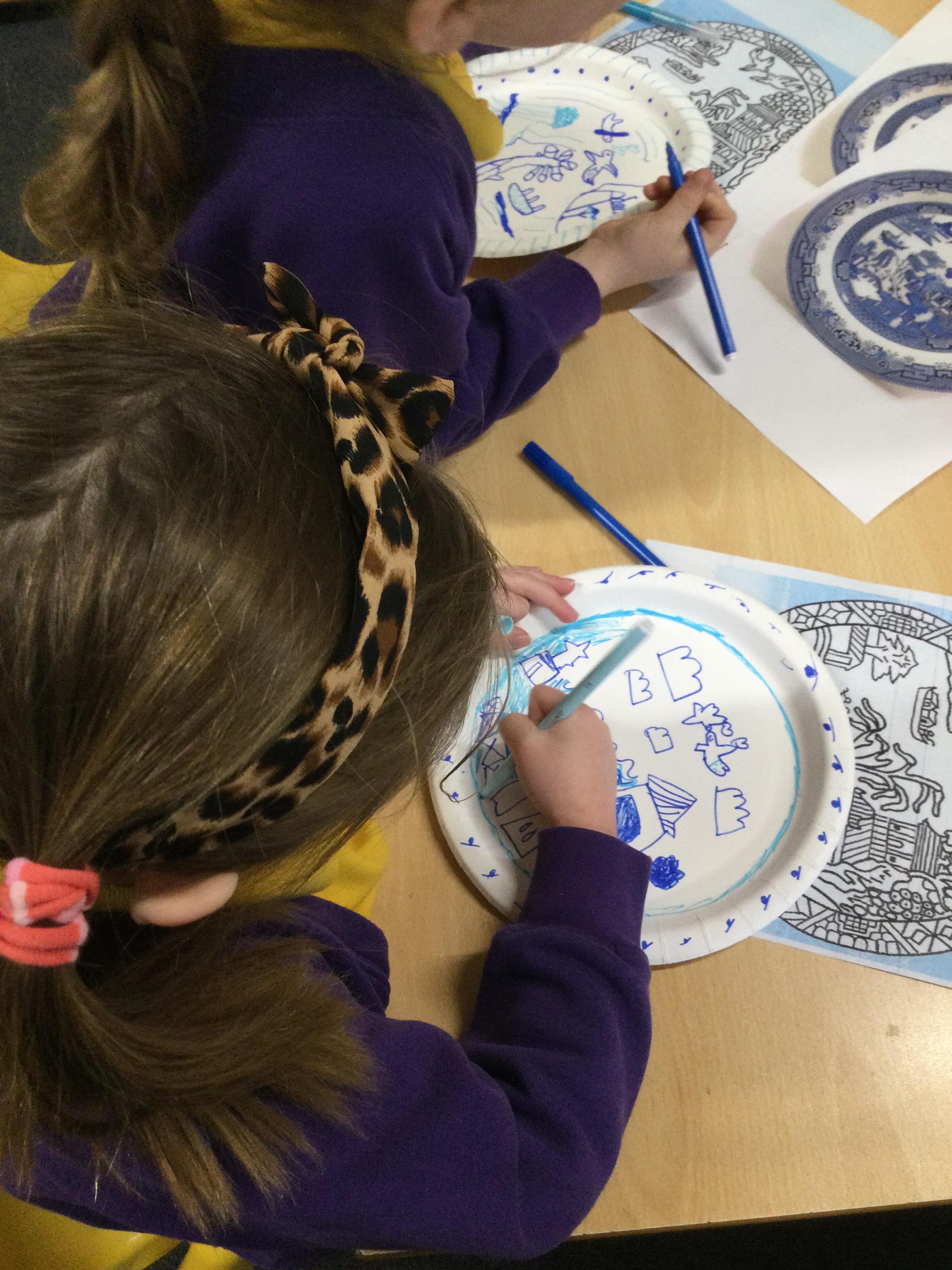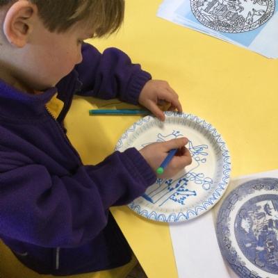 This term year 2's art has been inspired by their topic, China. They painted bamboo, made willow pattern plates, used clay to sculpt dragon eggs, made shadow puppets to tell the story of the willow pattern plate and created Ming vase pictures!
