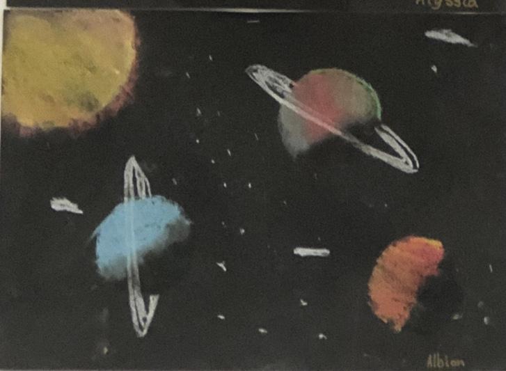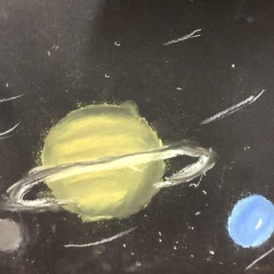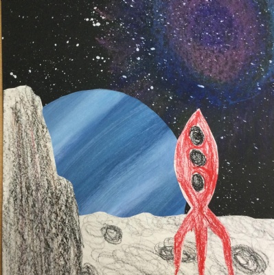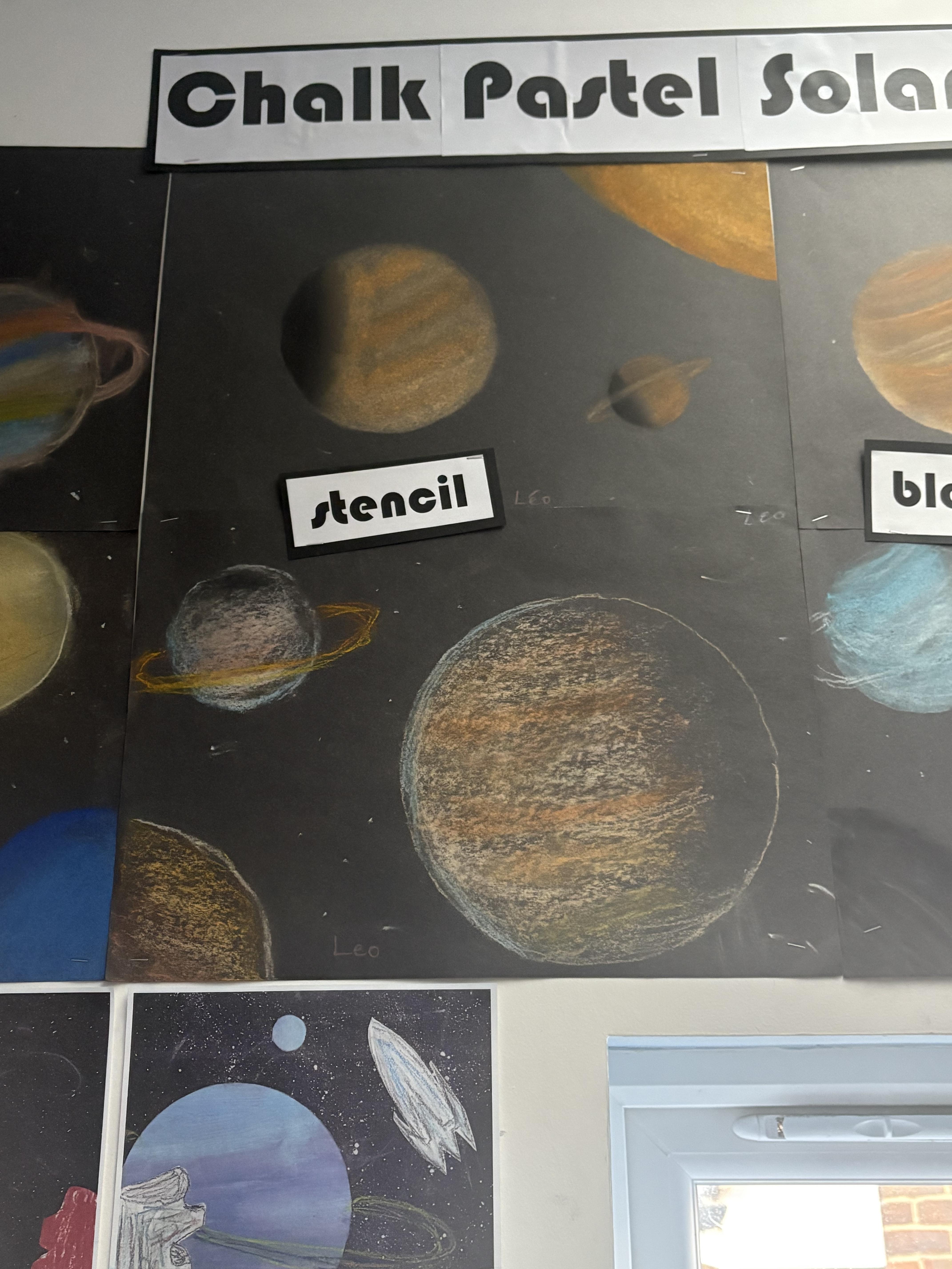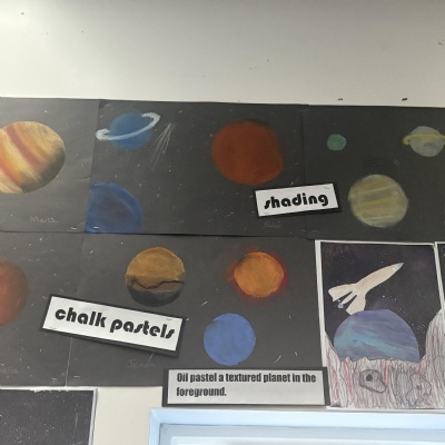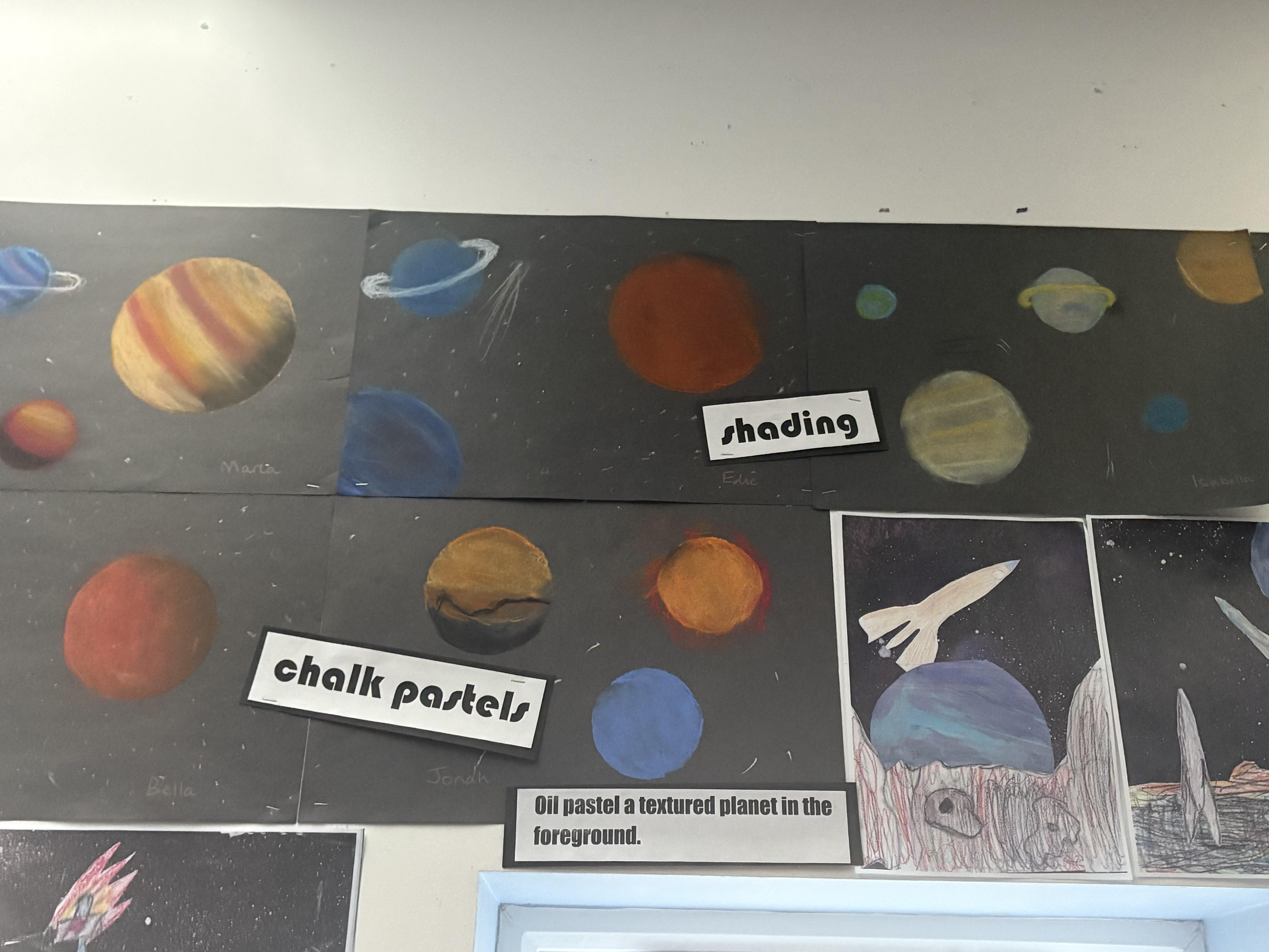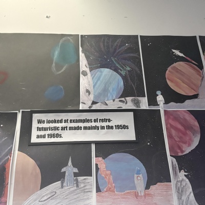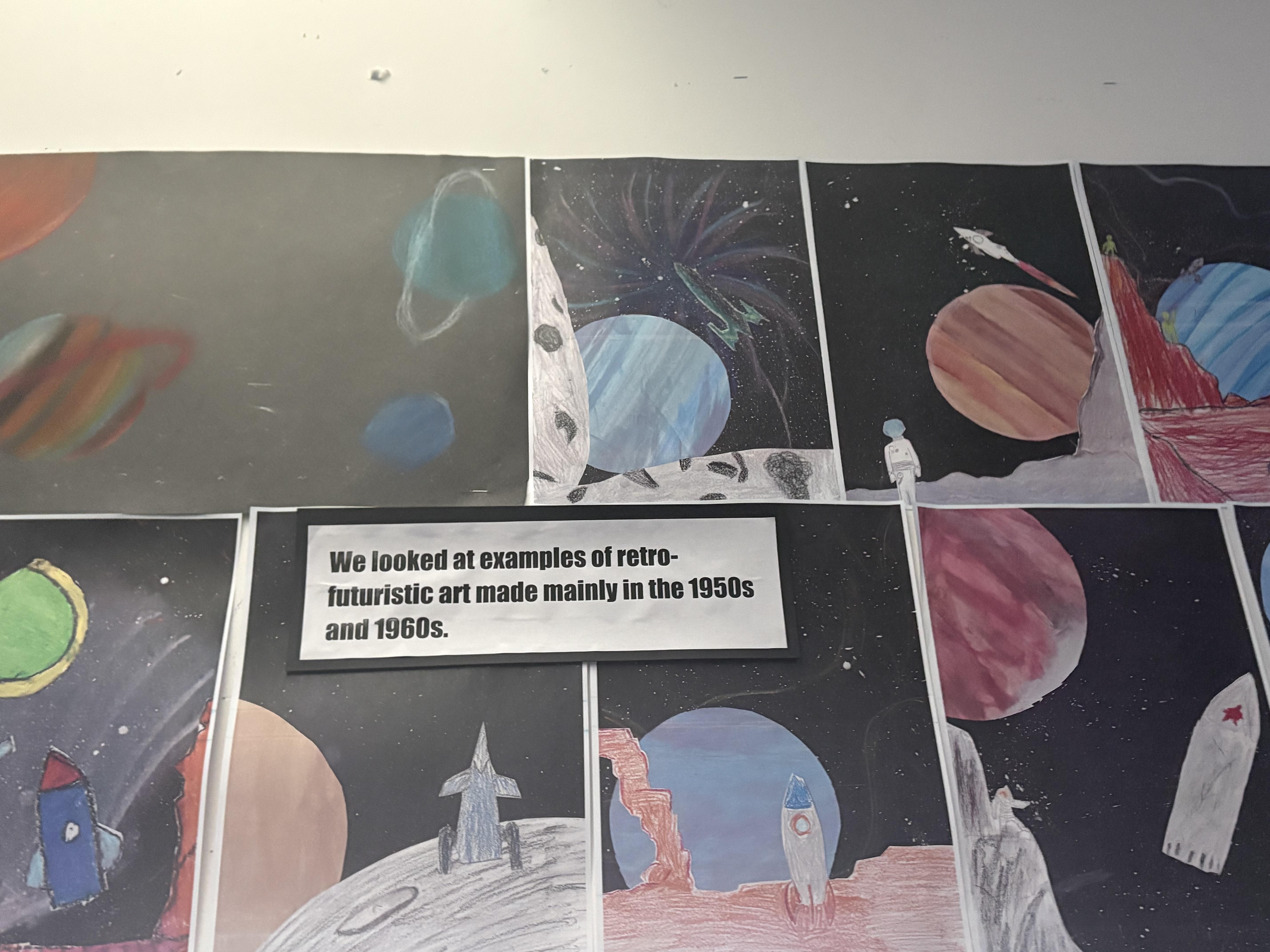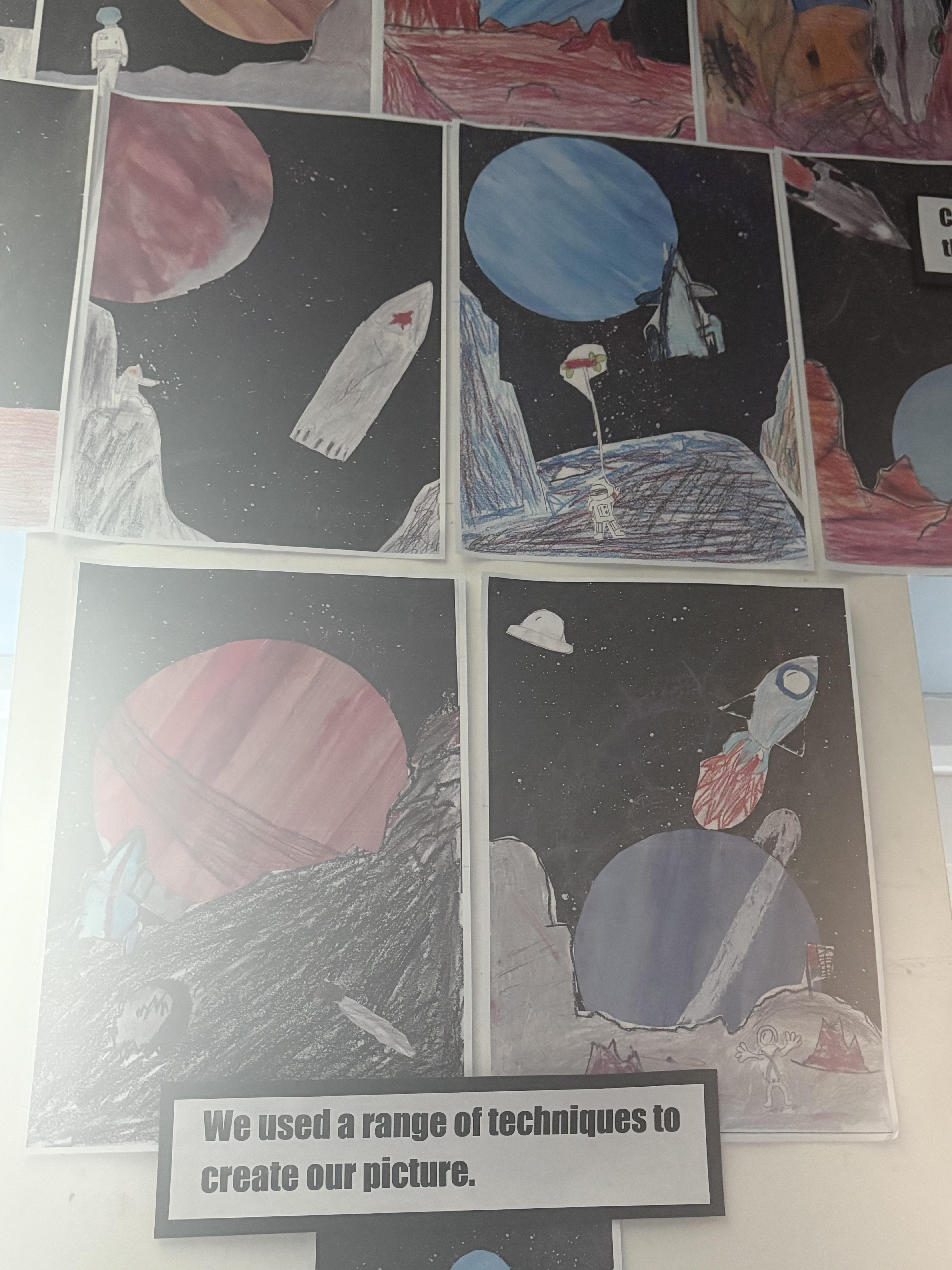 Years 5 & 6 explored examples of Retro-Futuristic art from the 1950s and 60s. They used a range of techniques to create their own space art inspired by artwork of that period. They colour mixed and matched a middle ground planet, used chalk pastels and spatter painting techniques to create a nebula and galaxy background and then used oil pastels to create a textured planet foreground. The final composition was then planned and assembled.