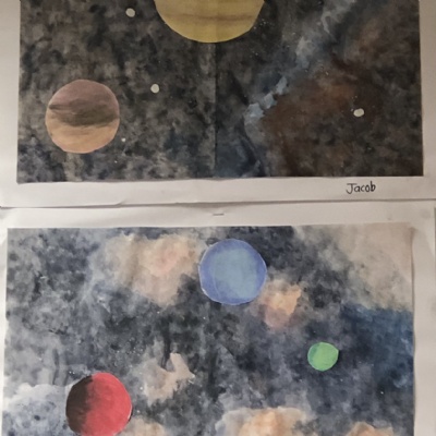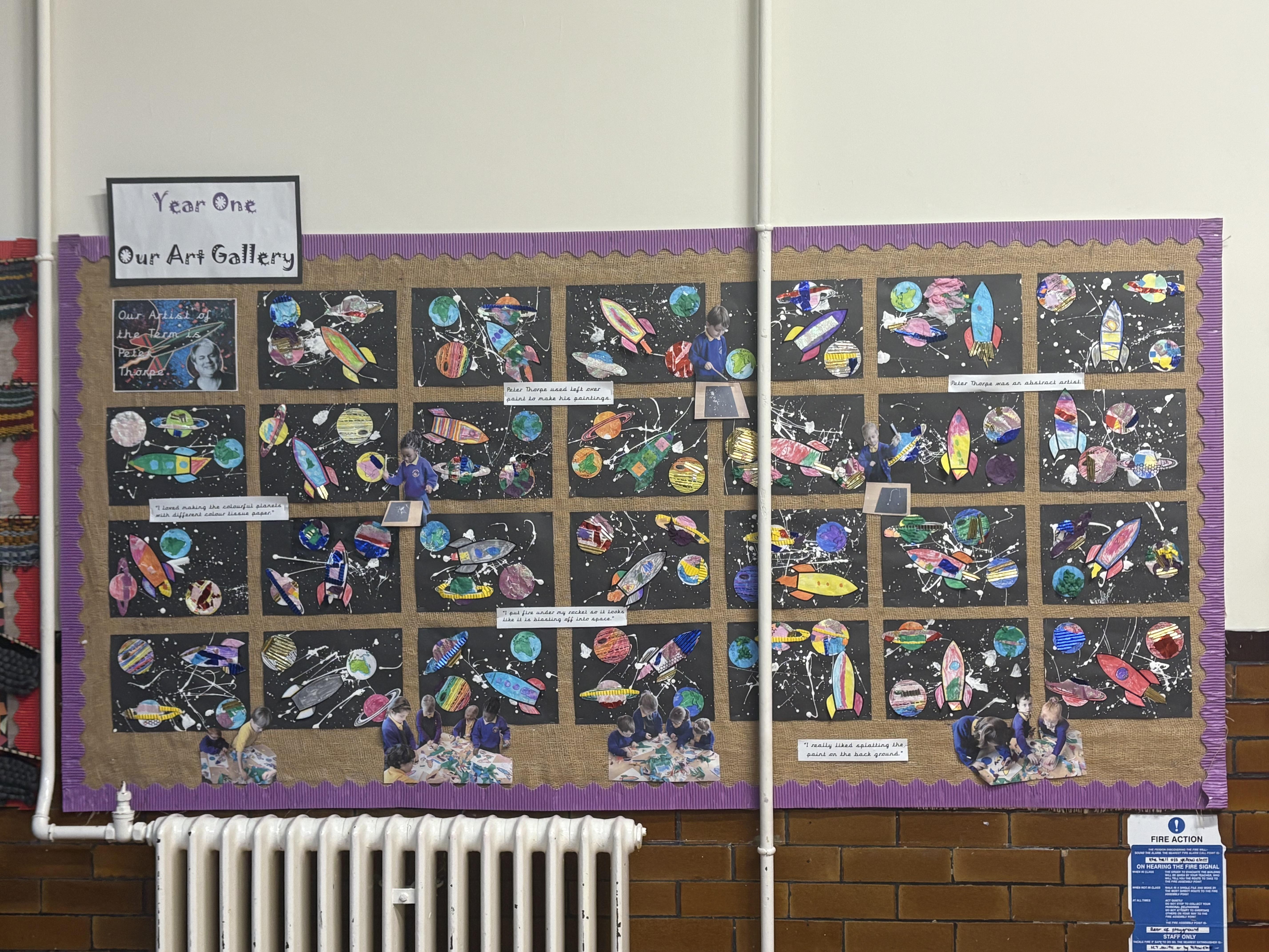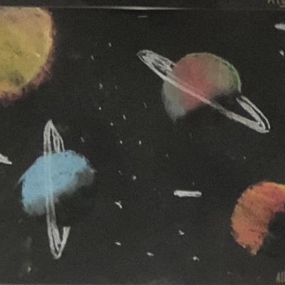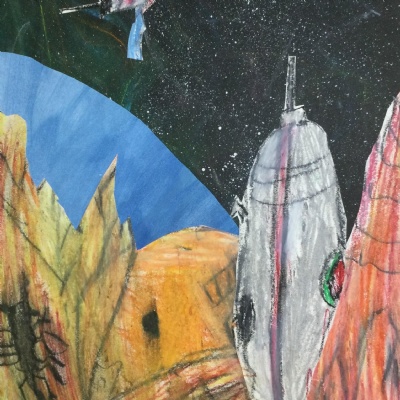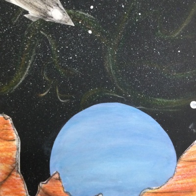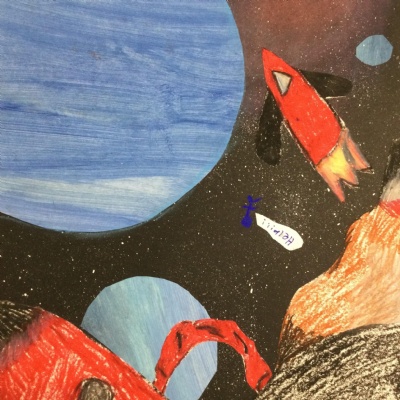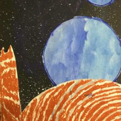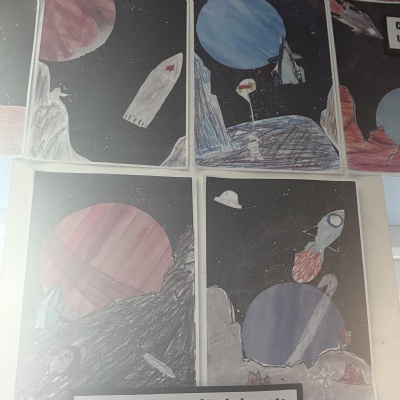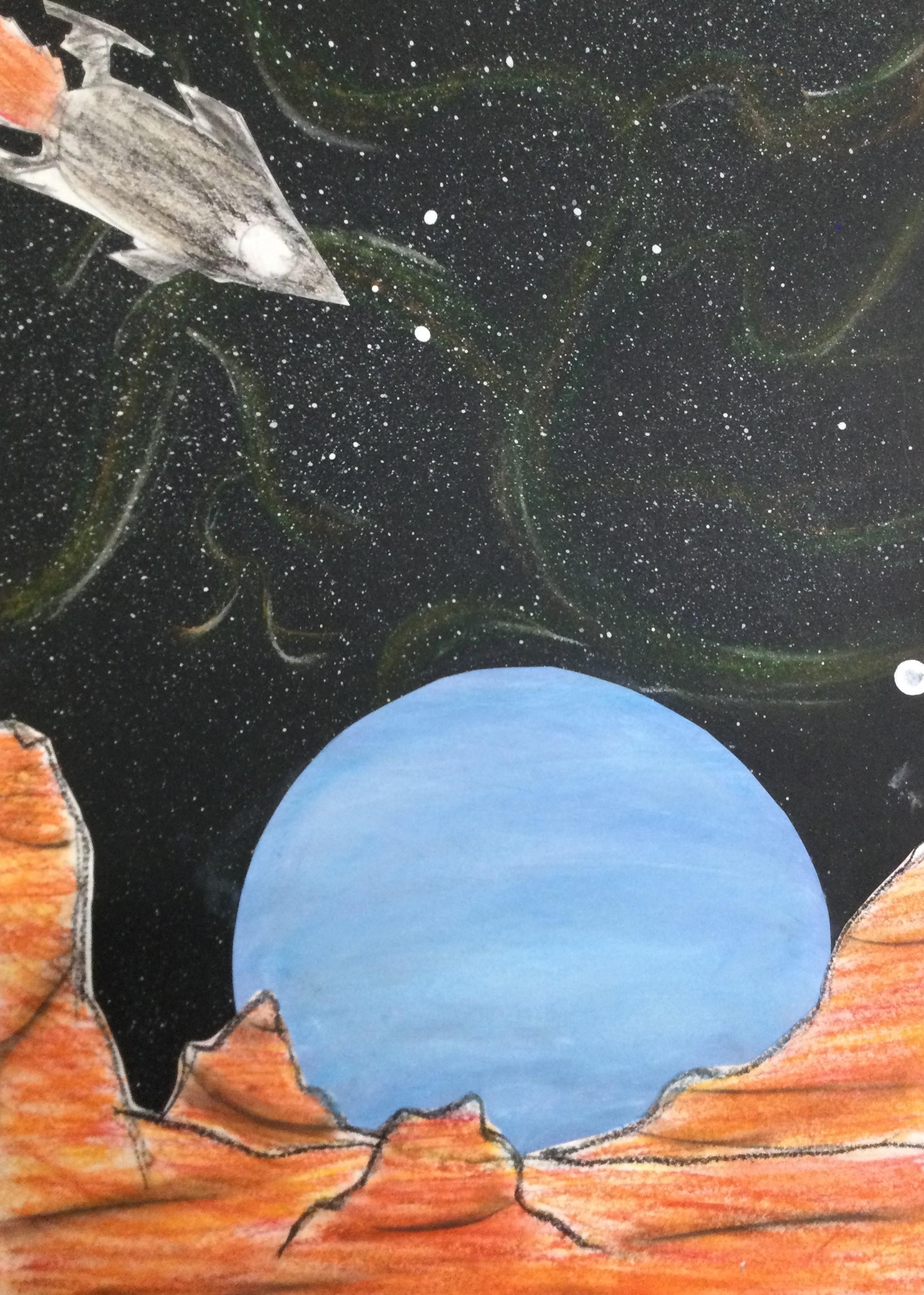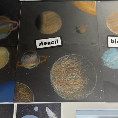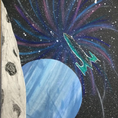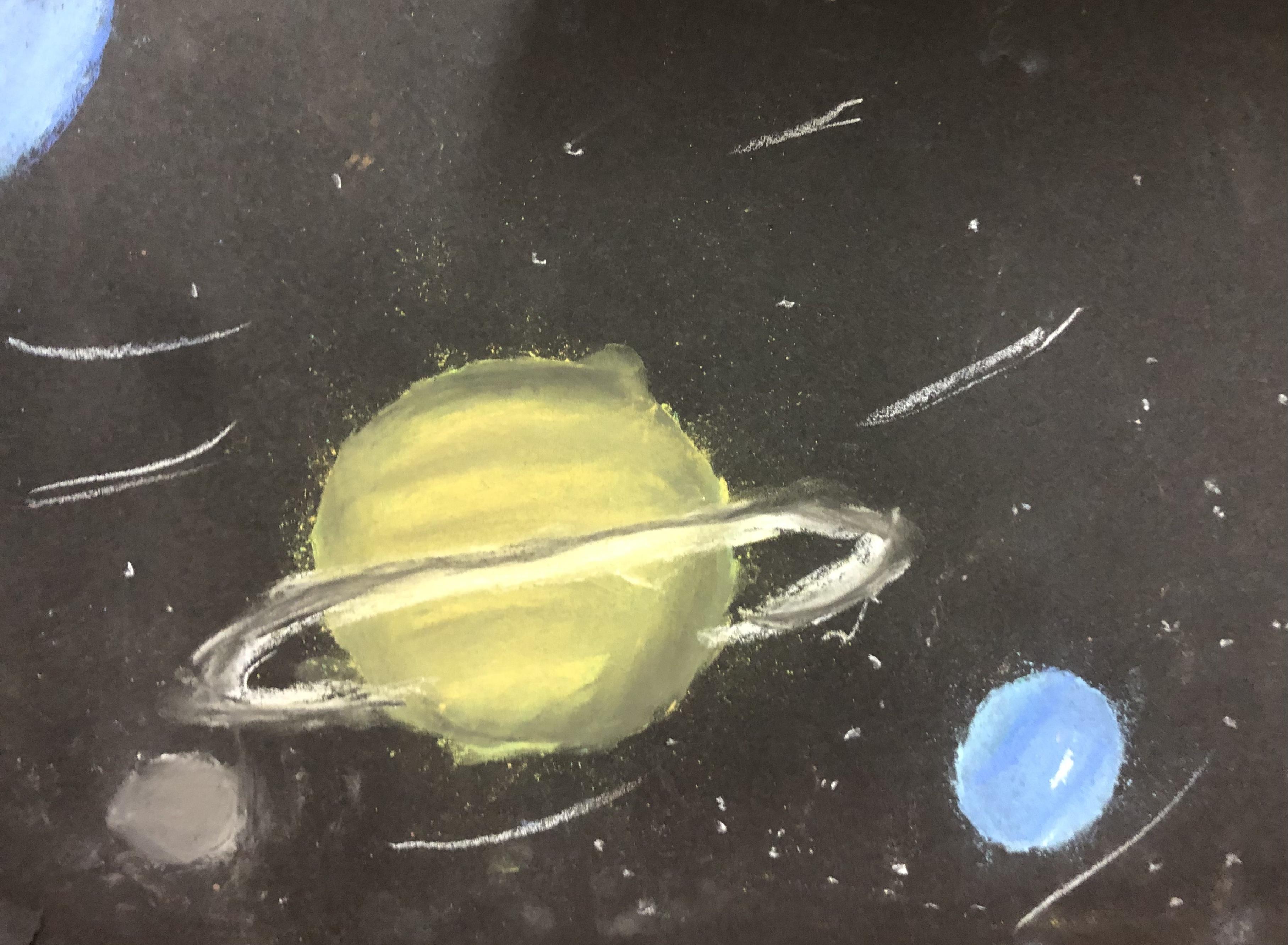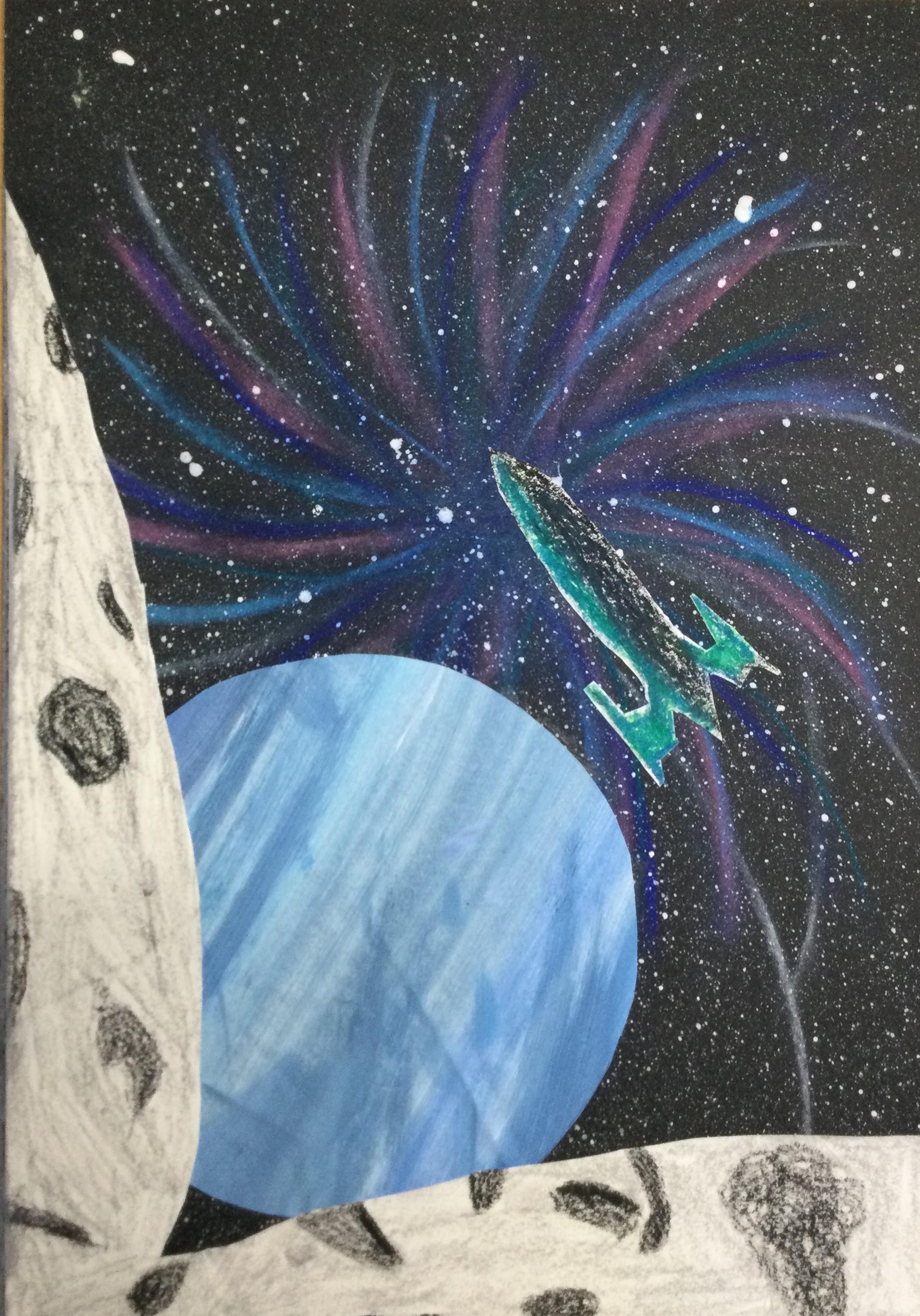 Years 5 & 6 explored examples of Retro-Futuristic art from the 1950s and 60s. They used a range of techniques to create their own space art inspired by artwork of that period. They colour mixed and matched a middle ground planet, used chalk pastels and spatter painting techniques to create a nebula and galaxy background and then used oil pastels to create a textured planet foreground. The final composition was then planned and assembled.