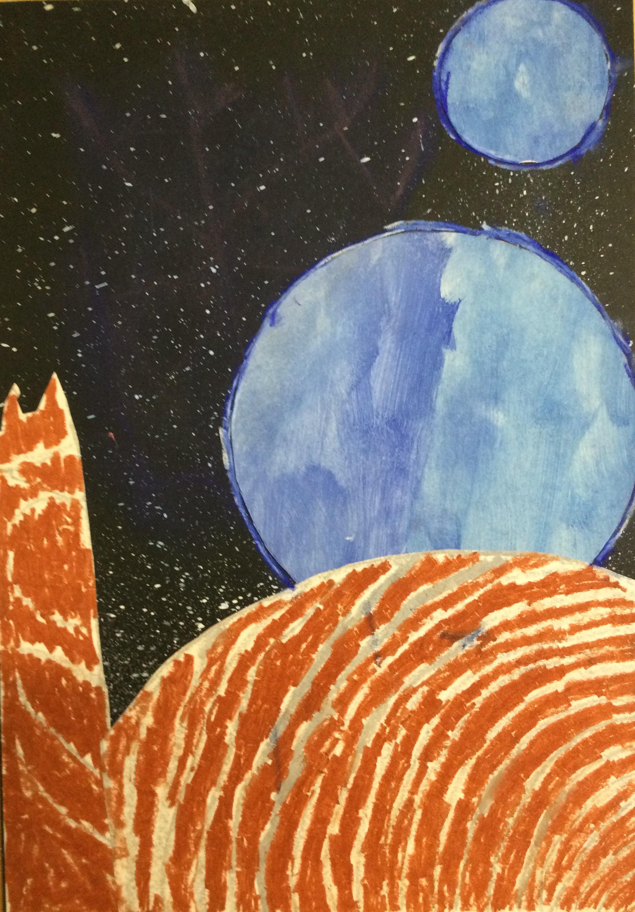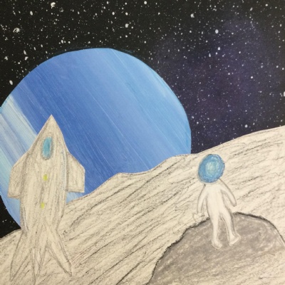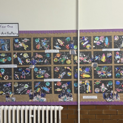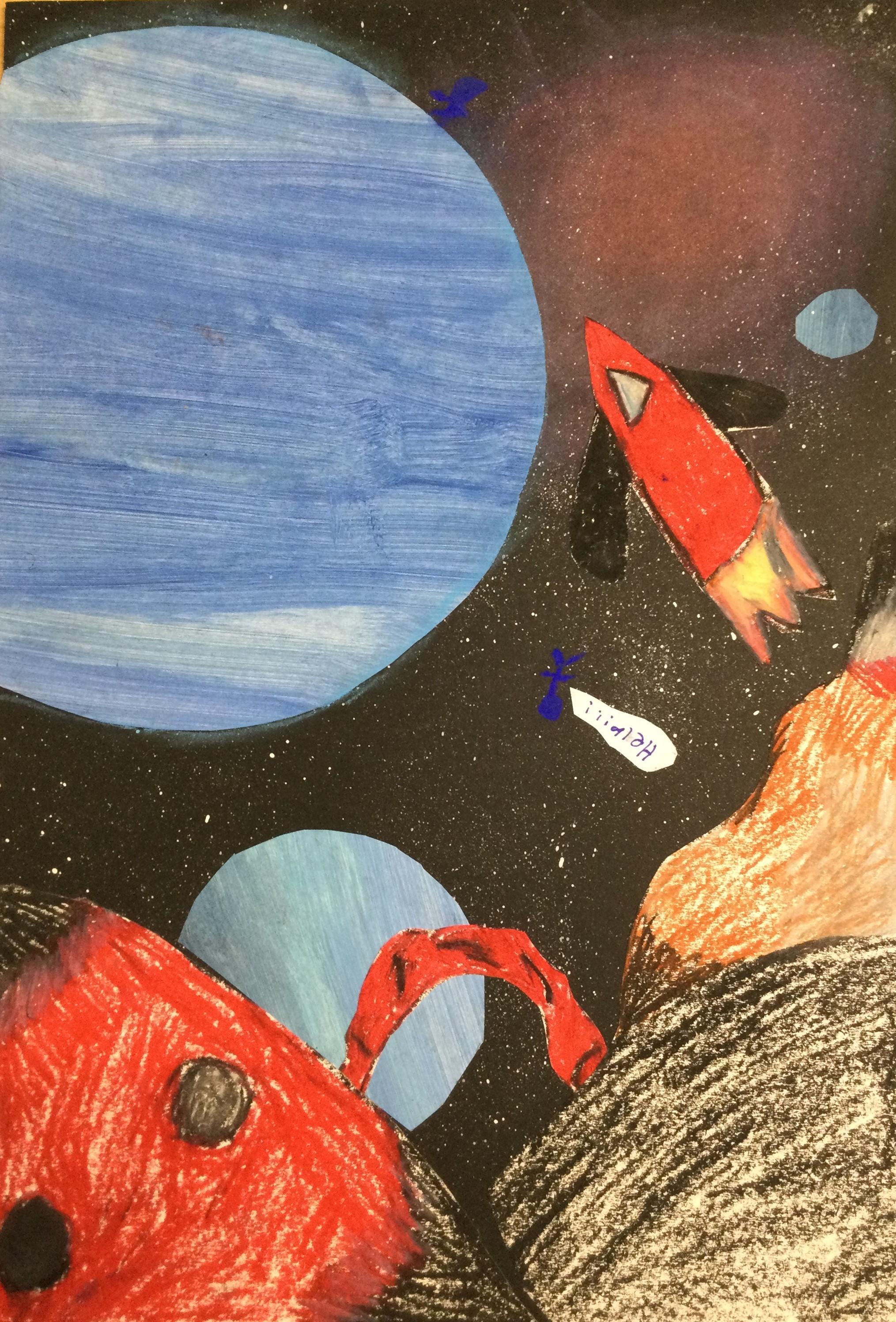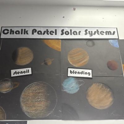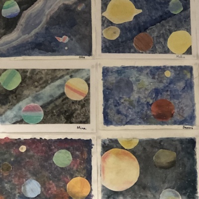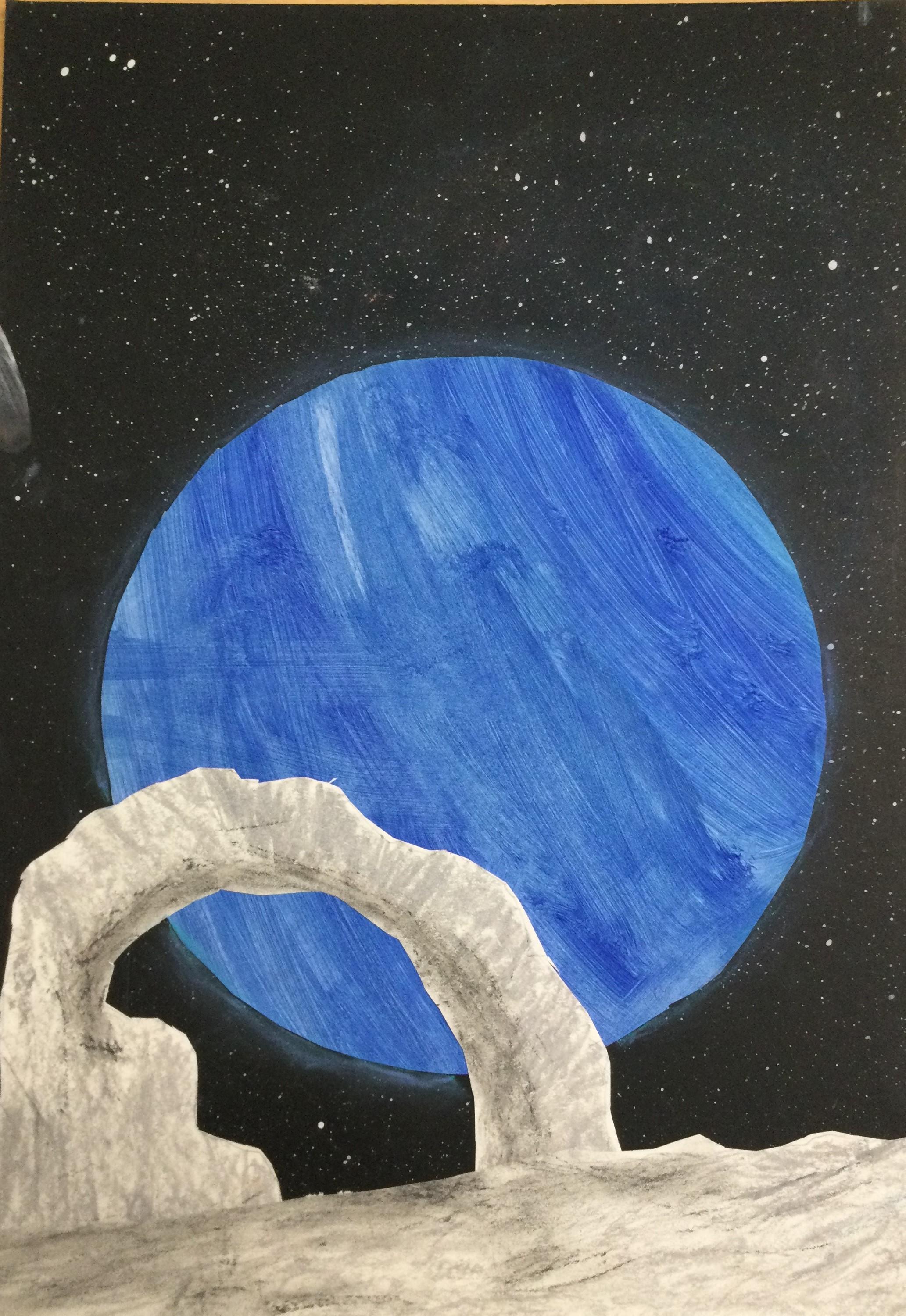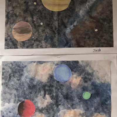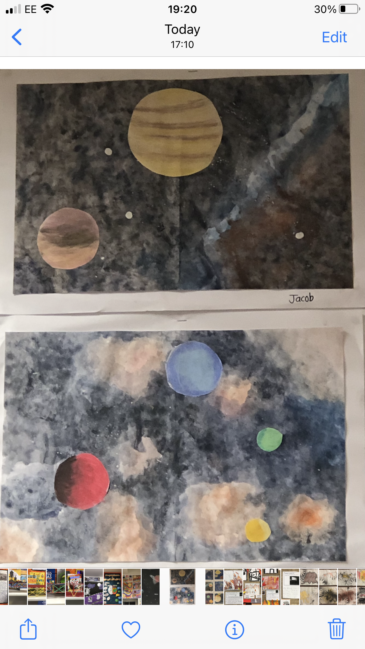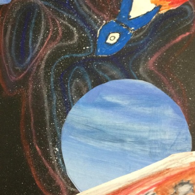 Years 5 & 6 explored examples of Retro-Futuristic art from the 1950s and 60s. They used a range of techniques to create their own space art inspired by artwork of that period. They colour mixed and matched a middle ground planet, used chalk pastels and spatter painting techniques to create a nebula and galaxy background and then used oil pastels to create a textured planet foreground. The final composition was then planned and assembled.