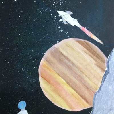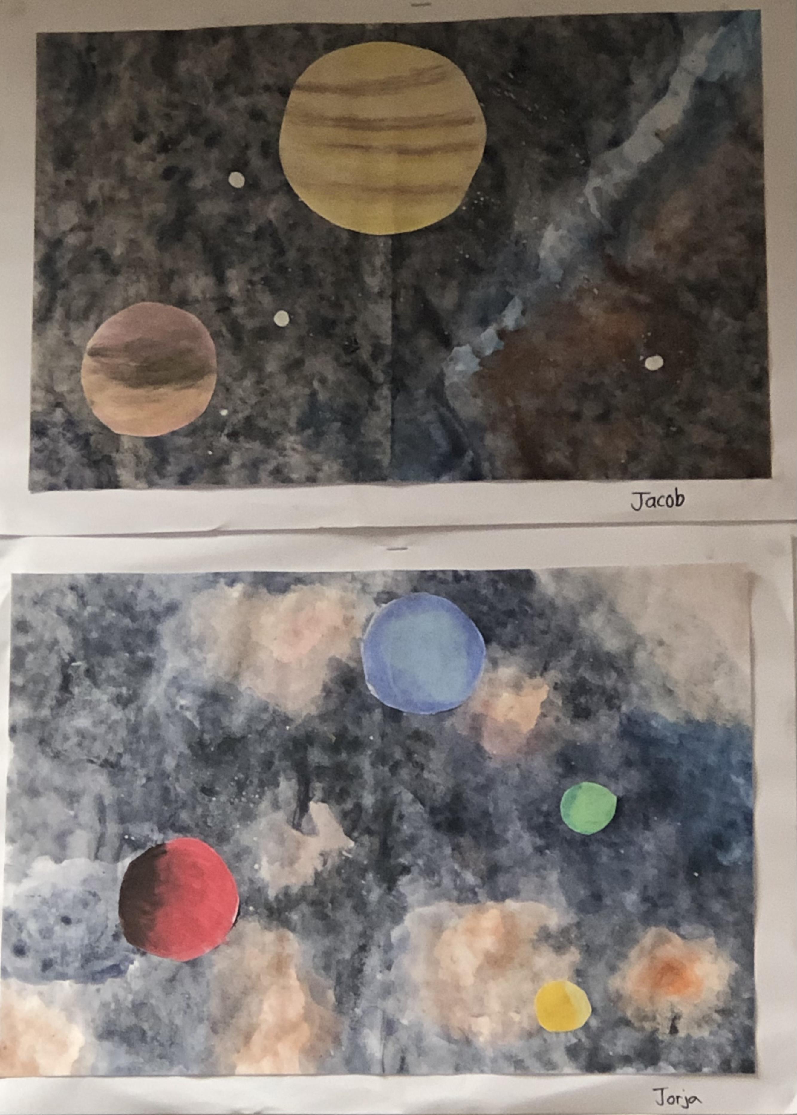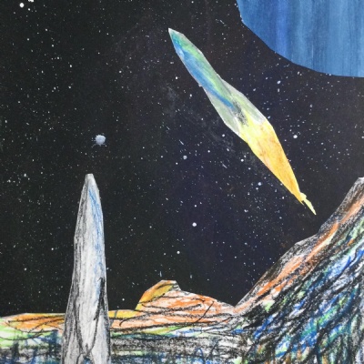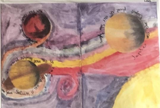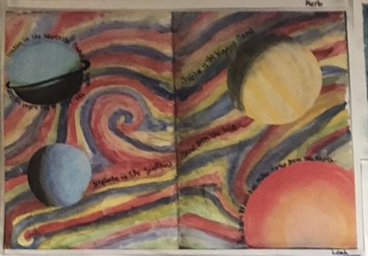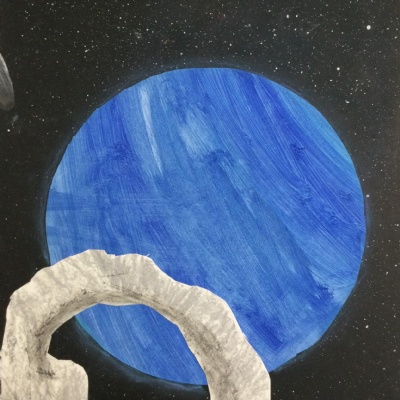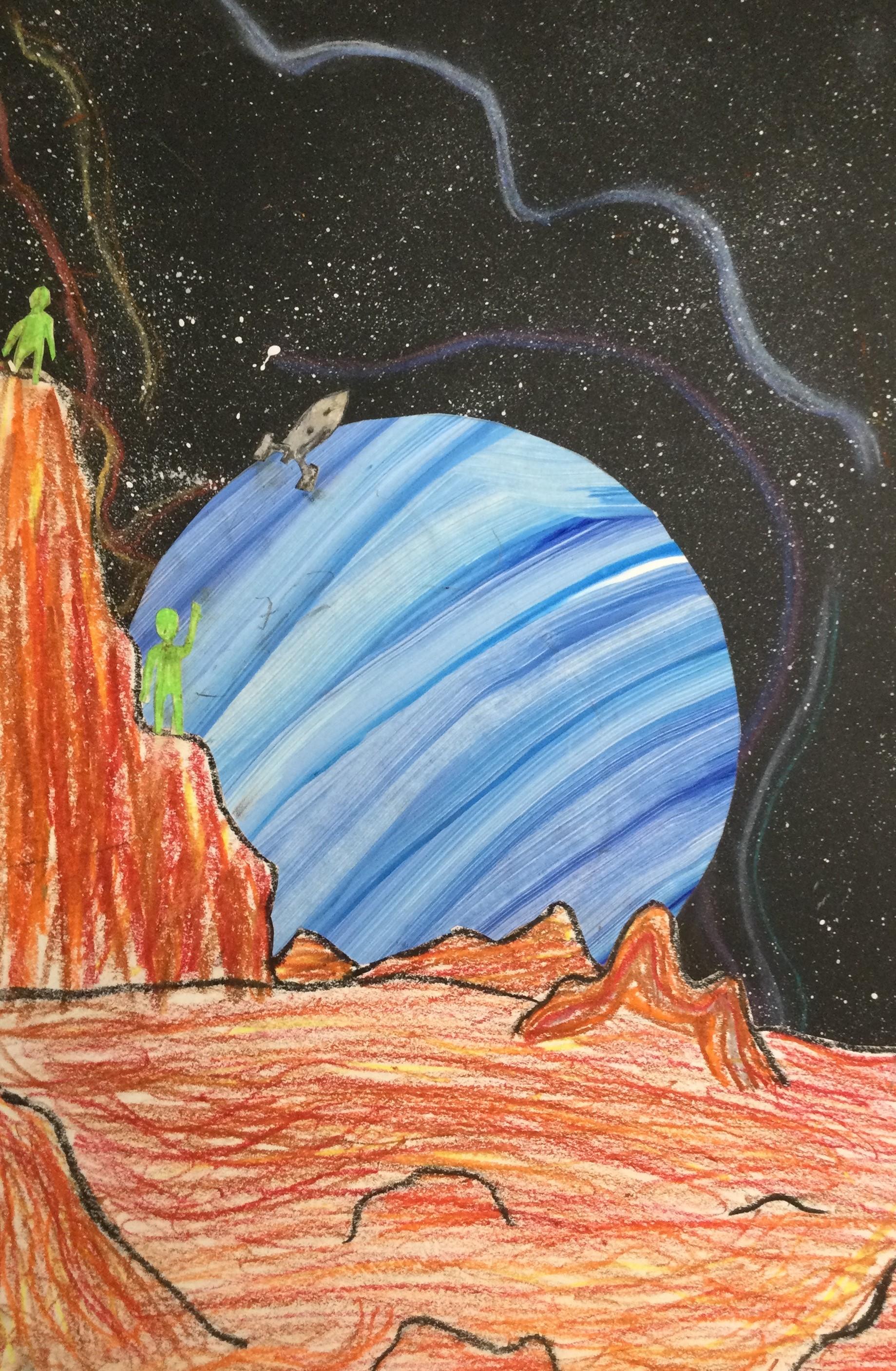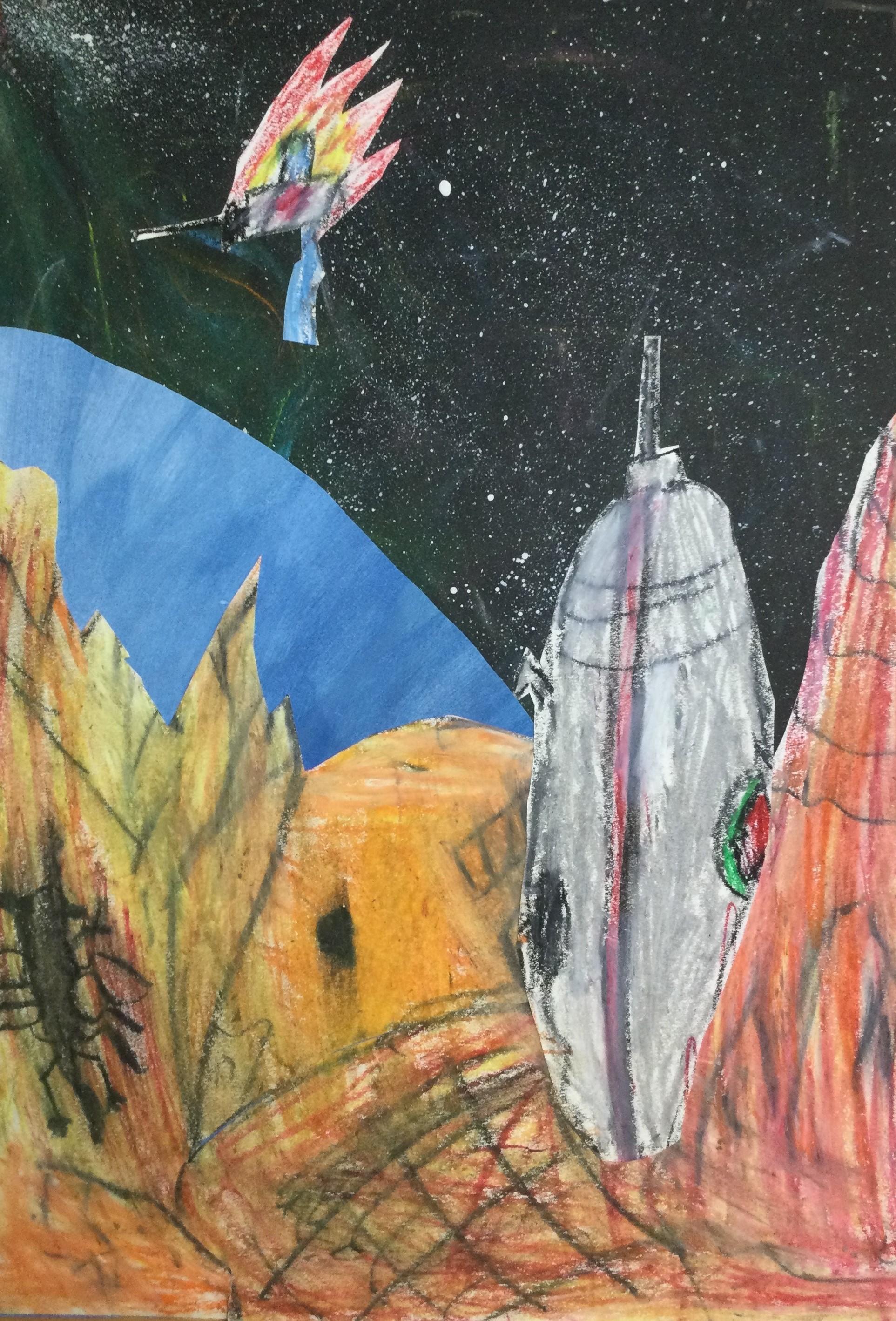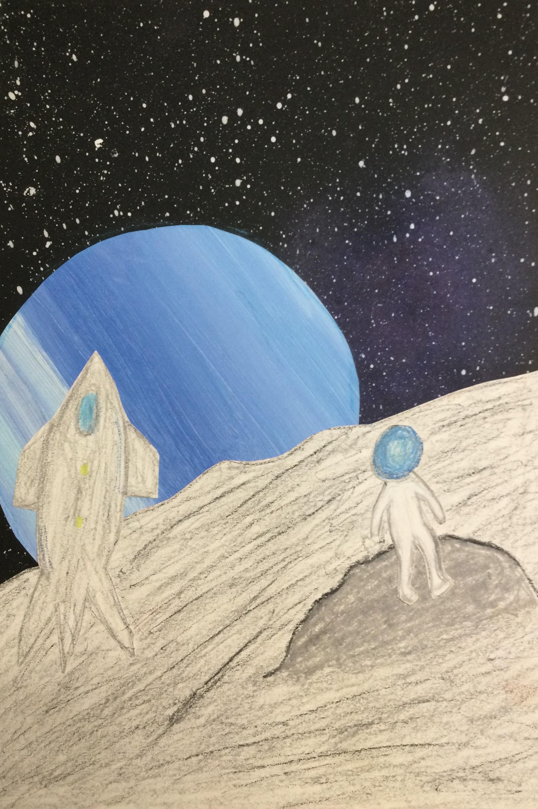 Years 5 & 6 explored examples of Retro-Futuristic art from the 1950s and 60s. They used a range of techniques to create their own space art inspired by artwork of that period. They colour mixed and matched a middle ground planet, used chalk pastels and spatter painting techniques to create a nebula and galaxy background and then used oil pastels to create a textured planet foreground. The final composition was then planned and assembled.