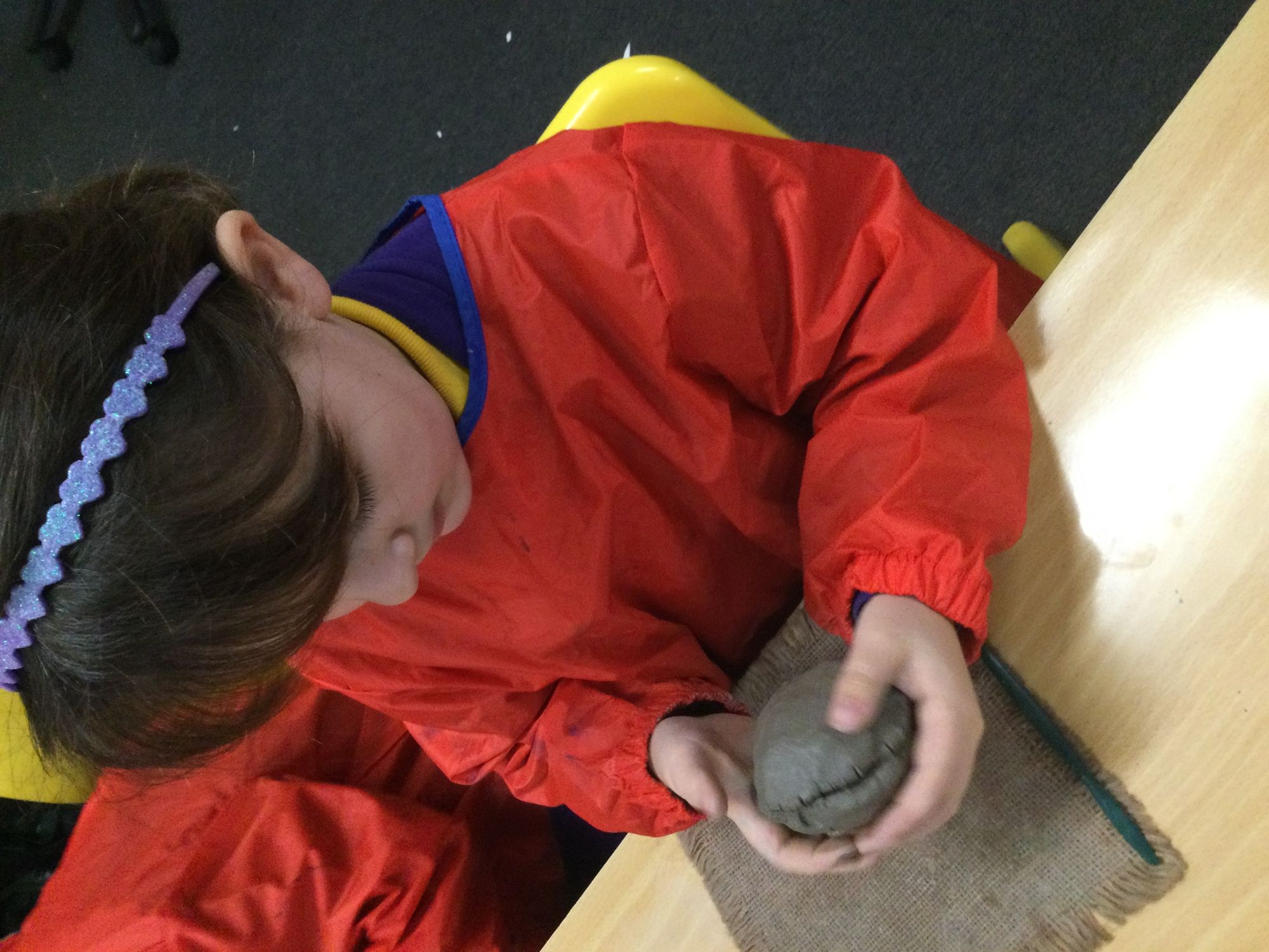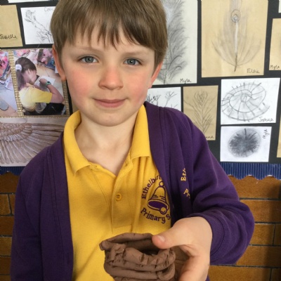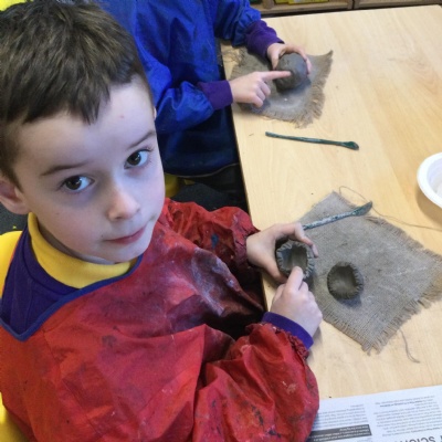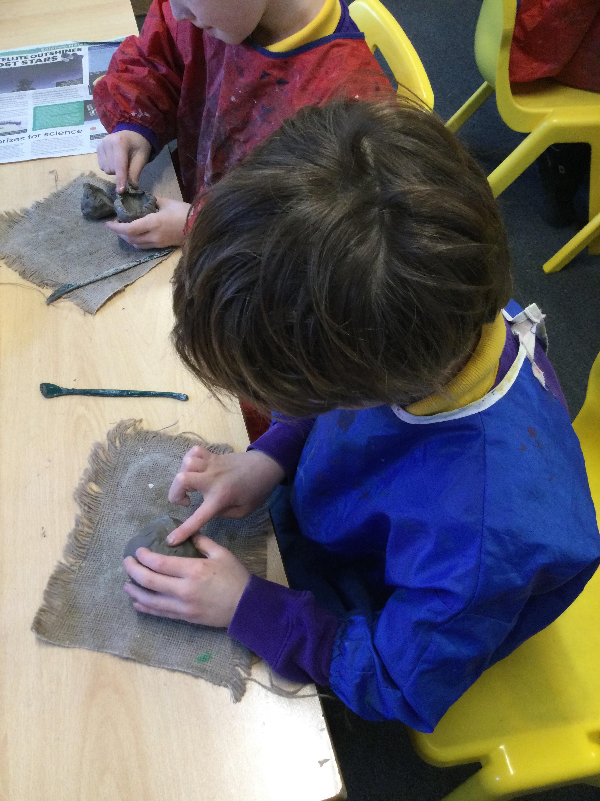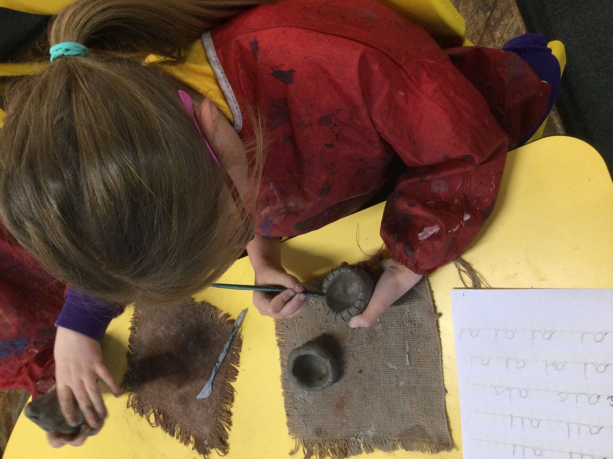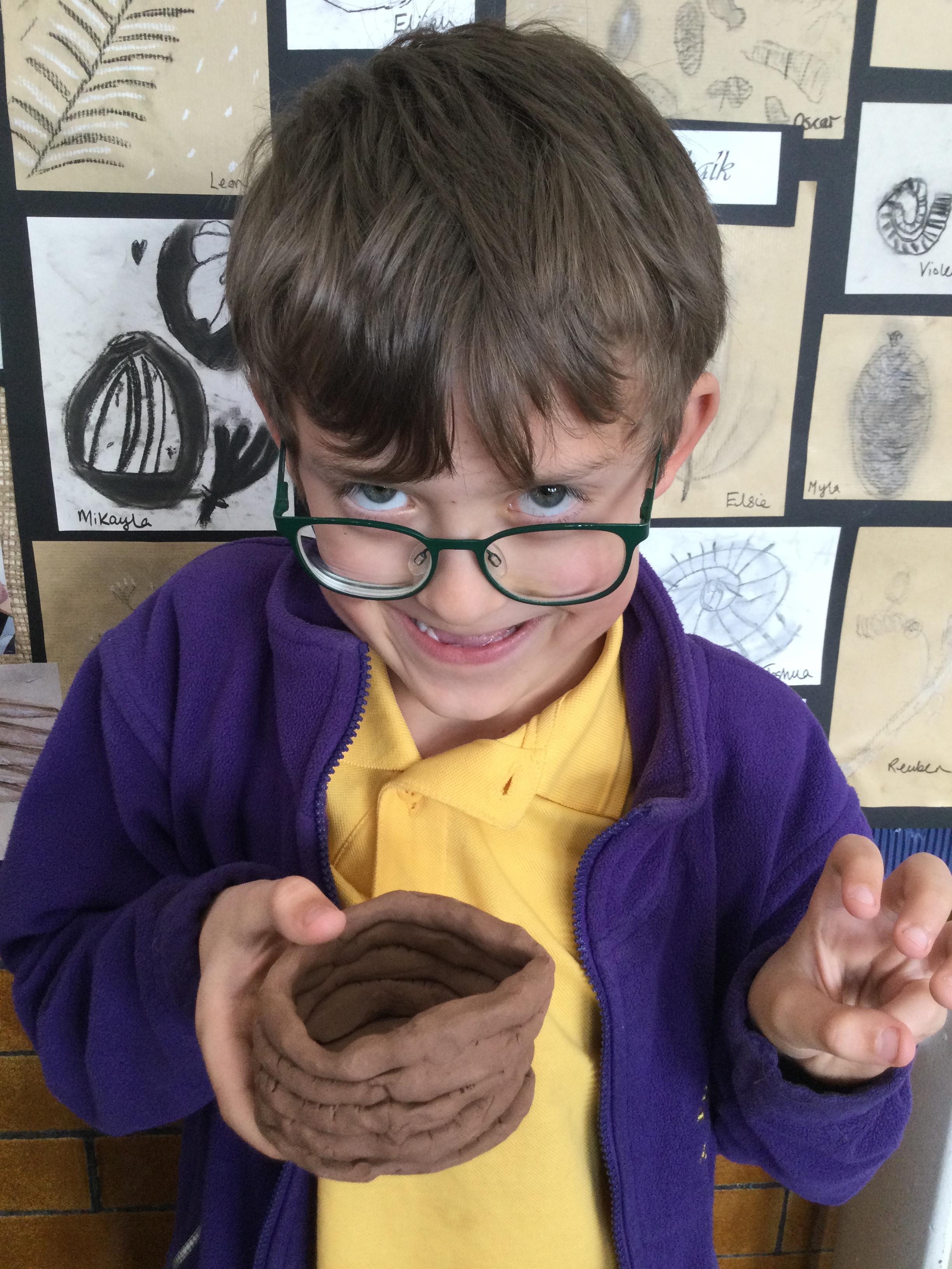 2025 is the Lunar New Year of the Snake. Year 2 made snake eggs by joining two clay pinch pots together. They used clay tools to inscribe patterns on their eggs.