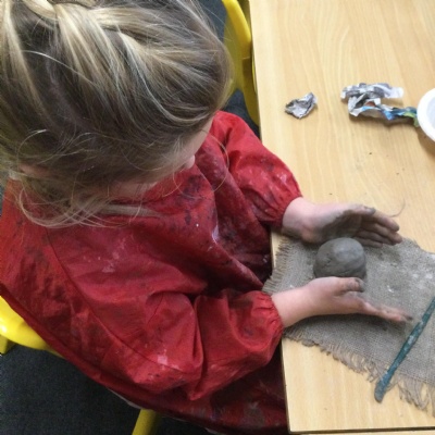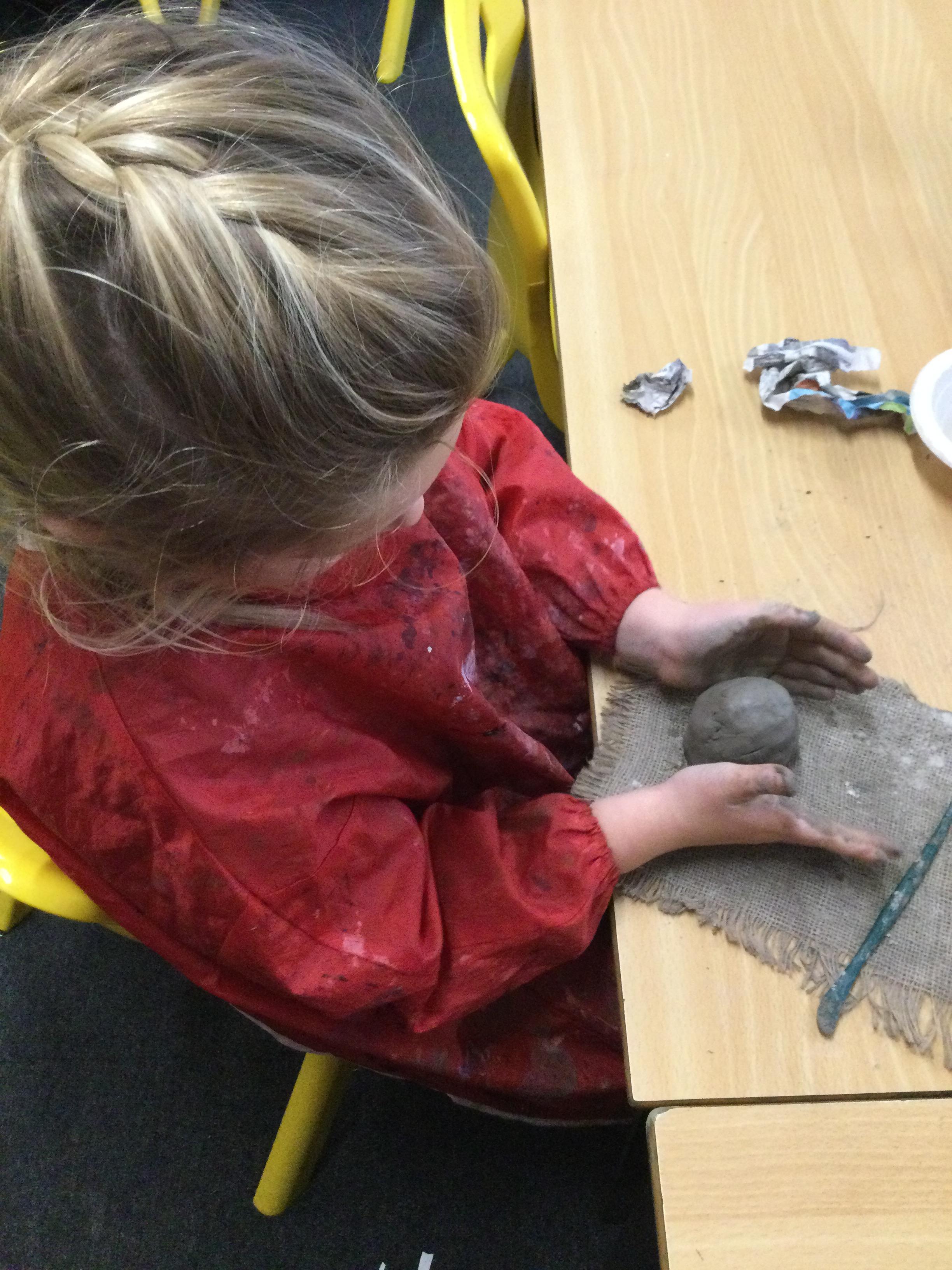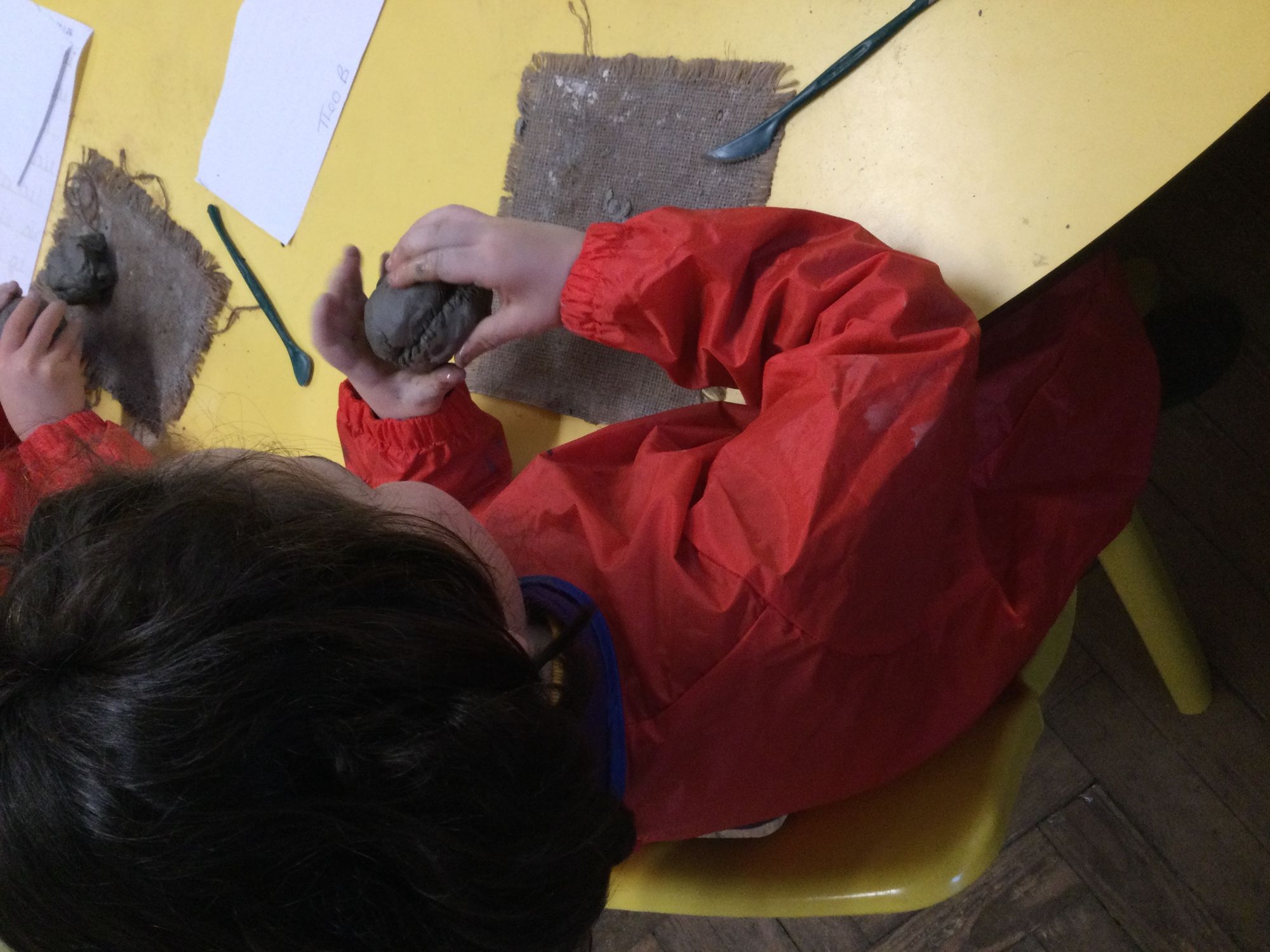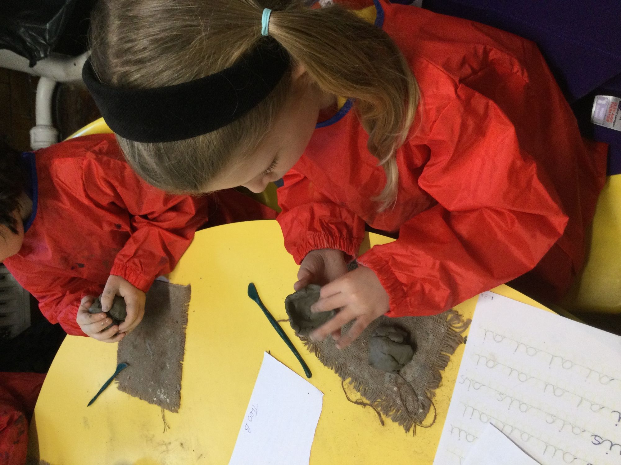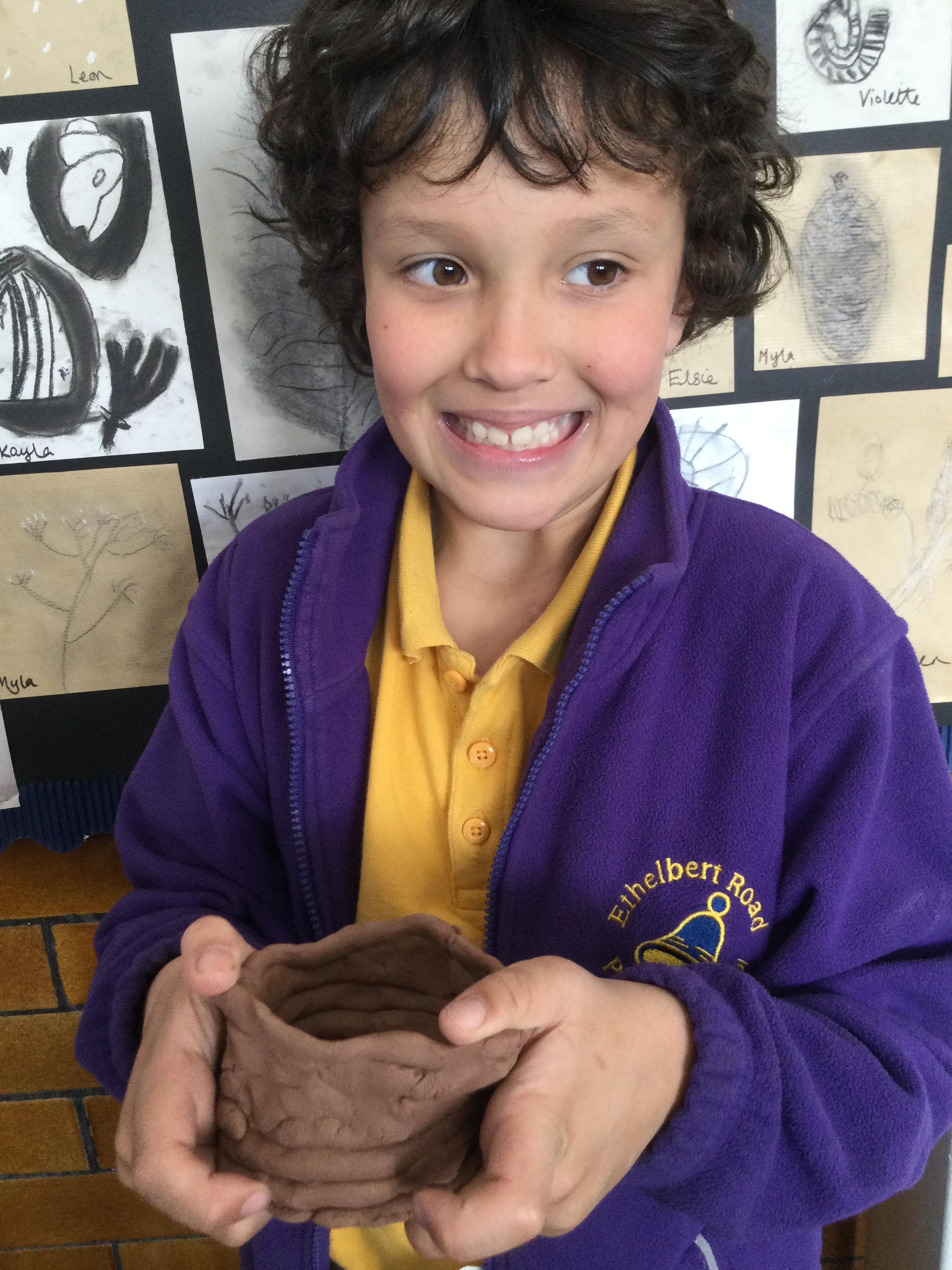 2025 is the Lunar New Year of the Snake. Year 2 made snake eggs by joining two clay pinch pots together. They used clay tools to inscribe patterns on their eggs.