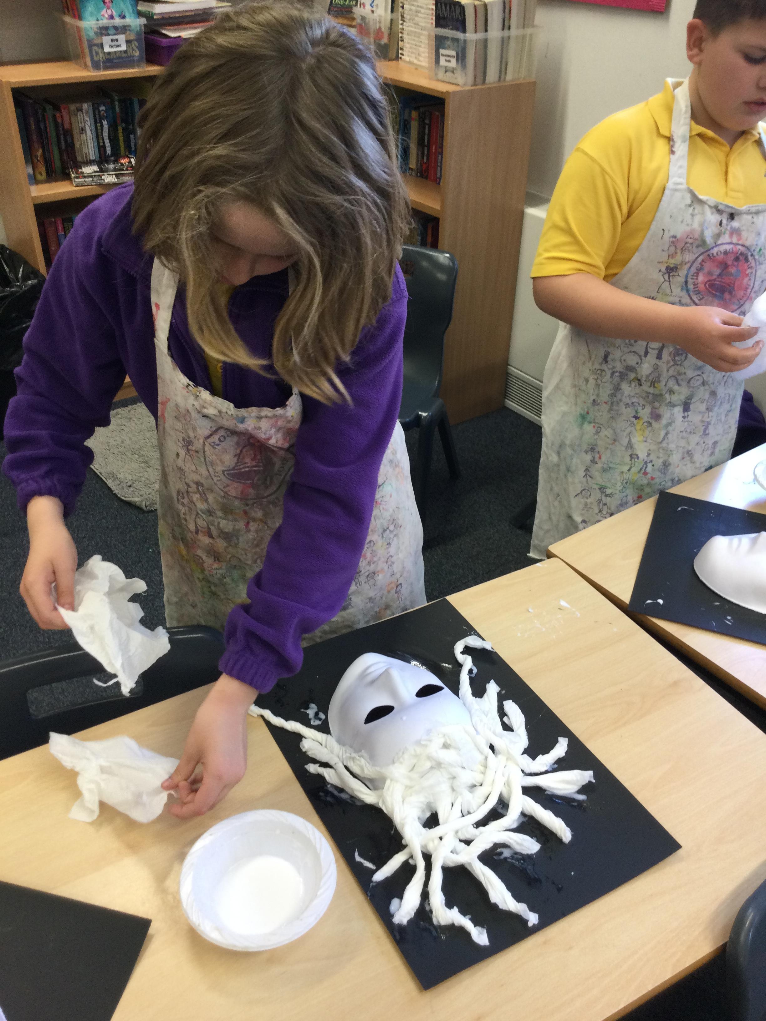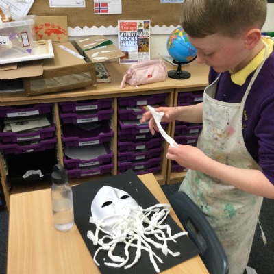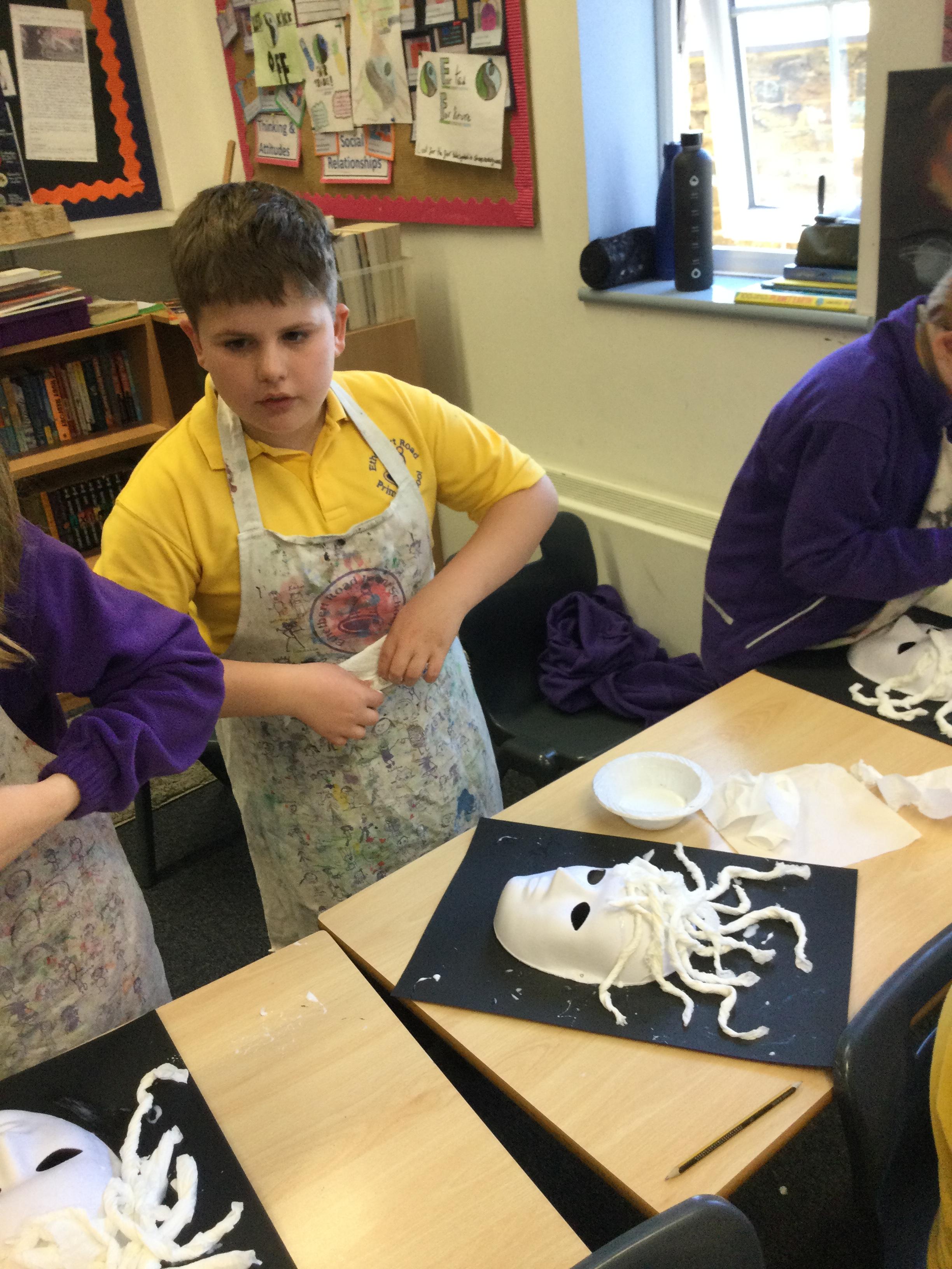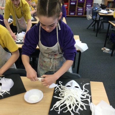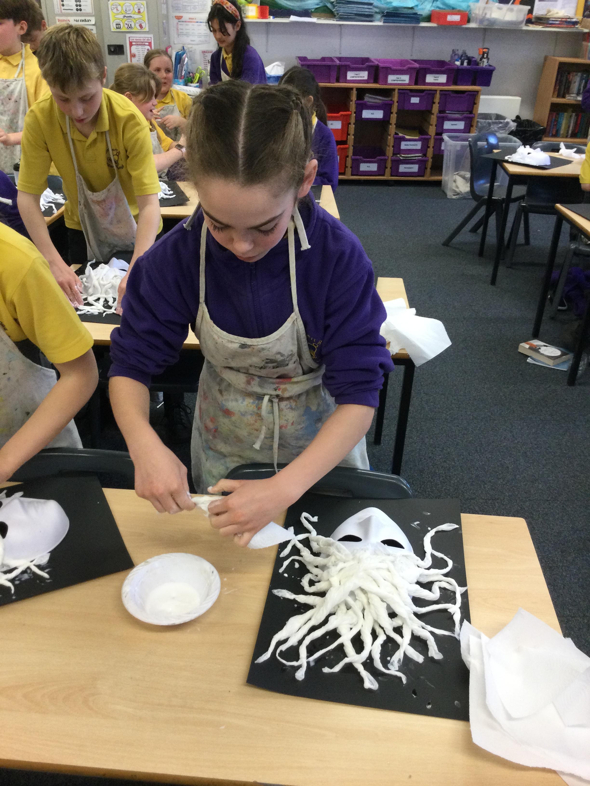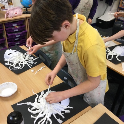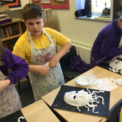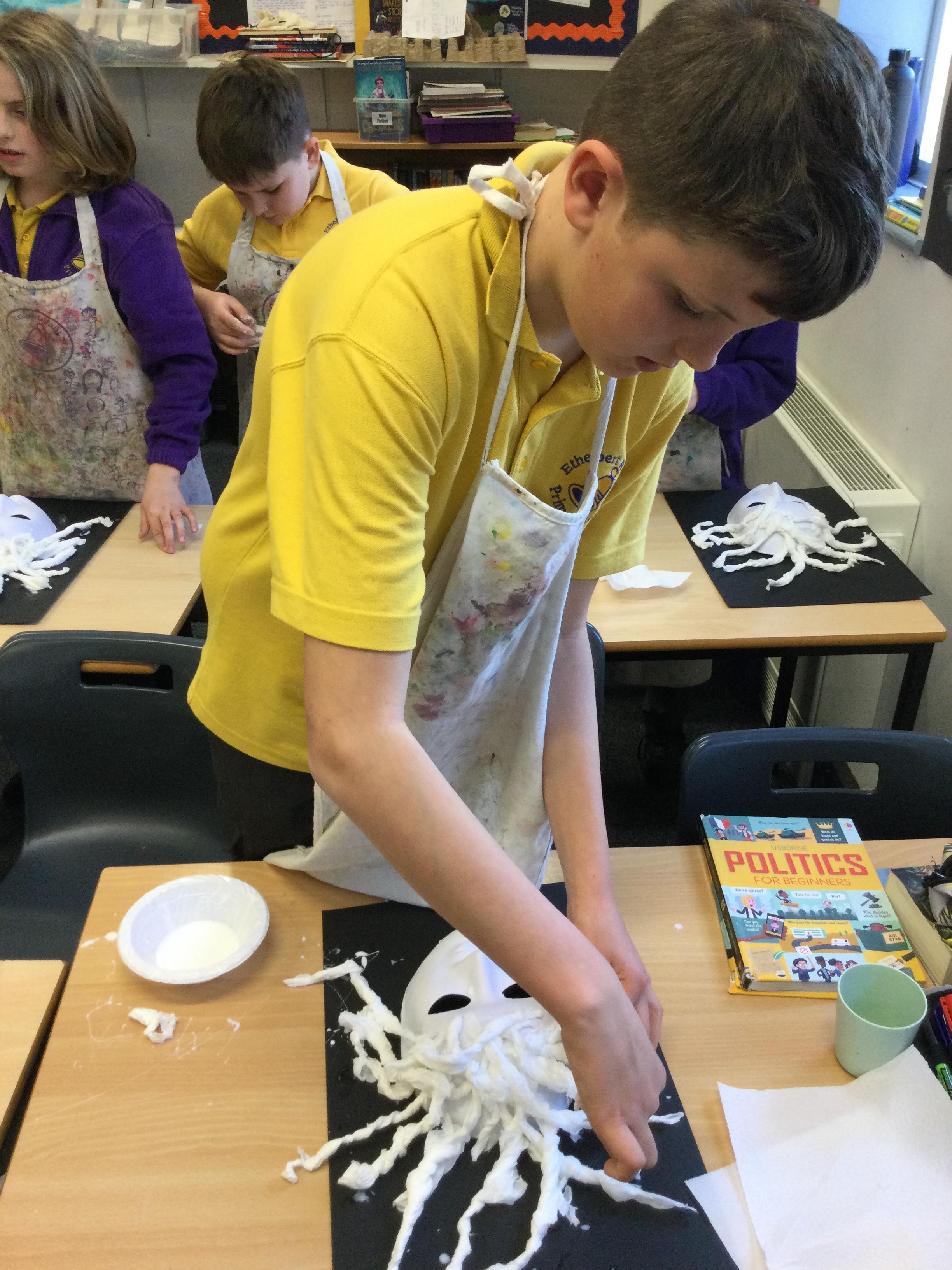 Year 6 are learning about ancient Greece. In art they used kitchen roll and pva glue to sculpt heads of Medusa; messy but fun!