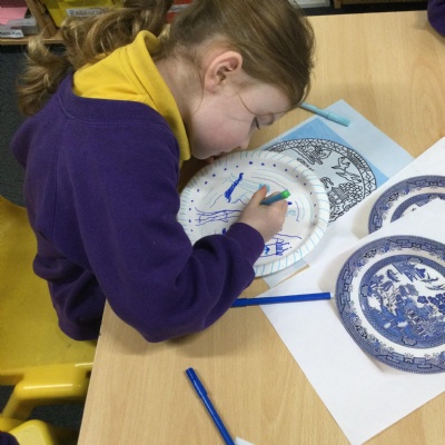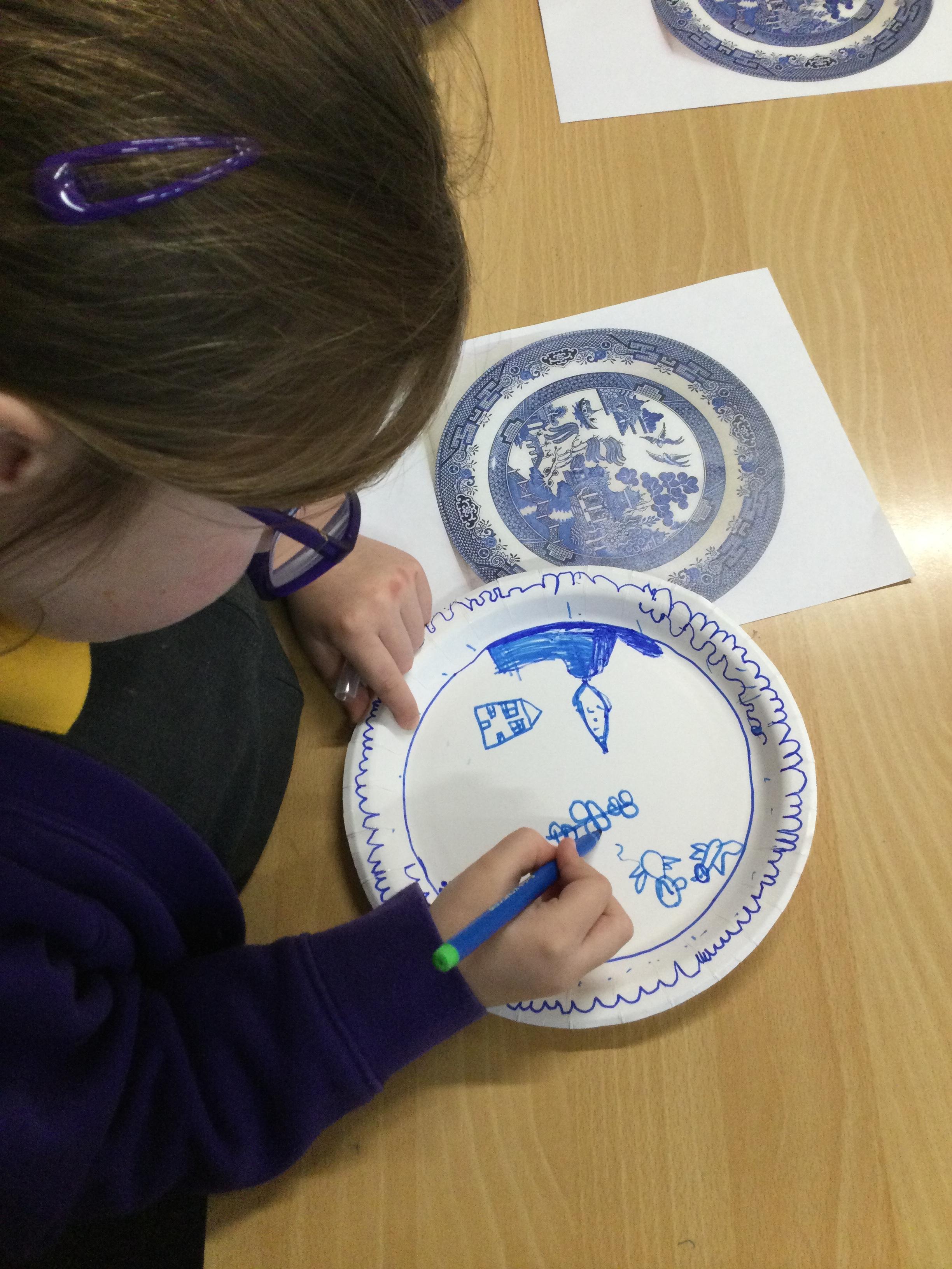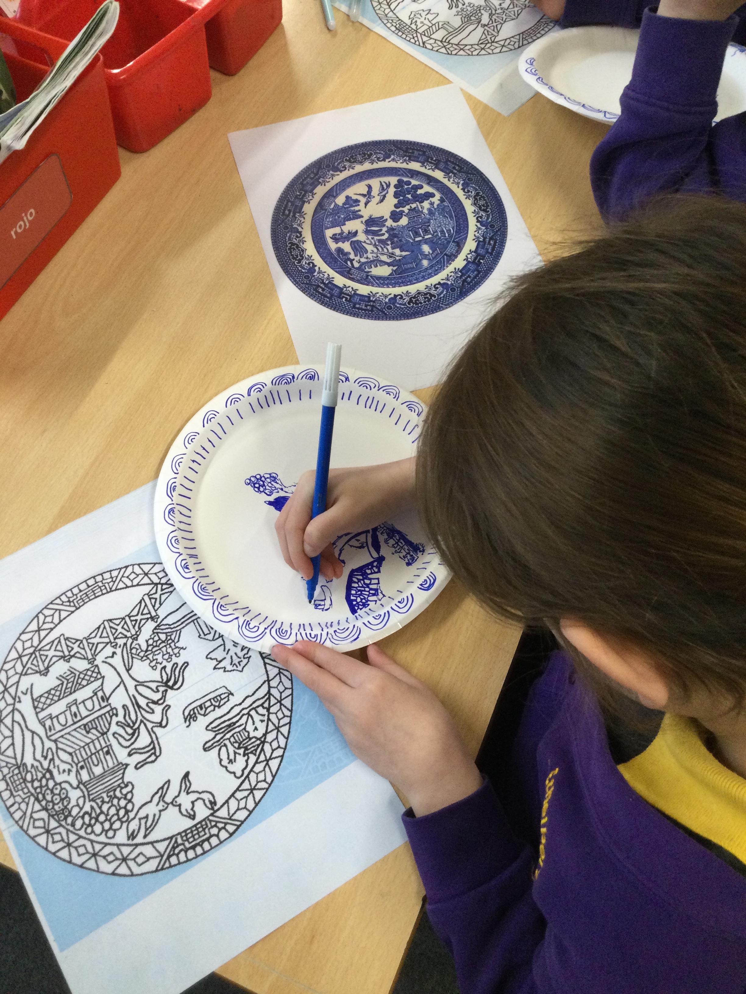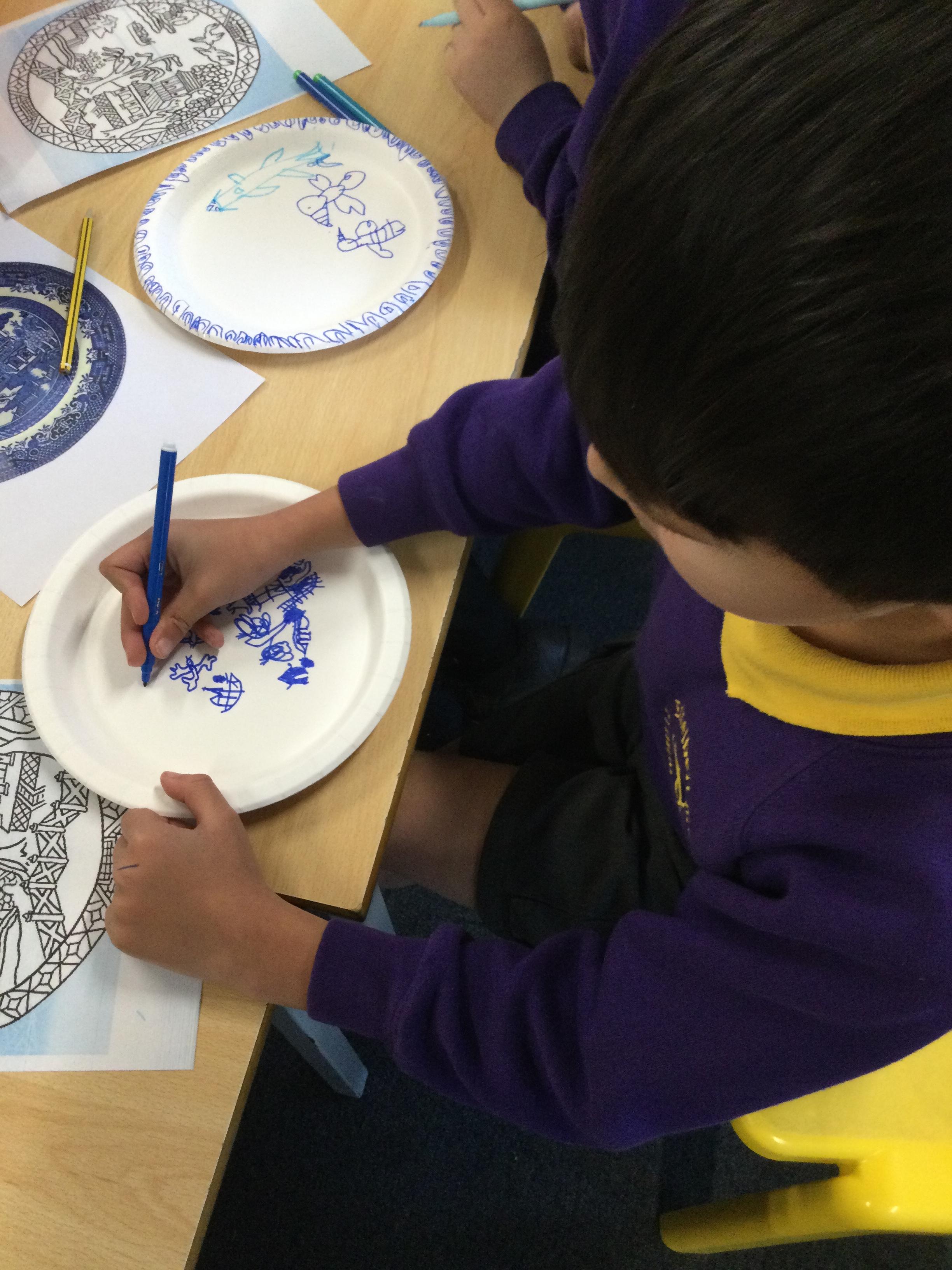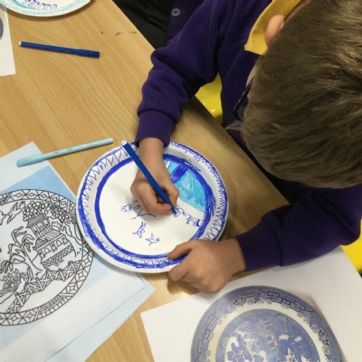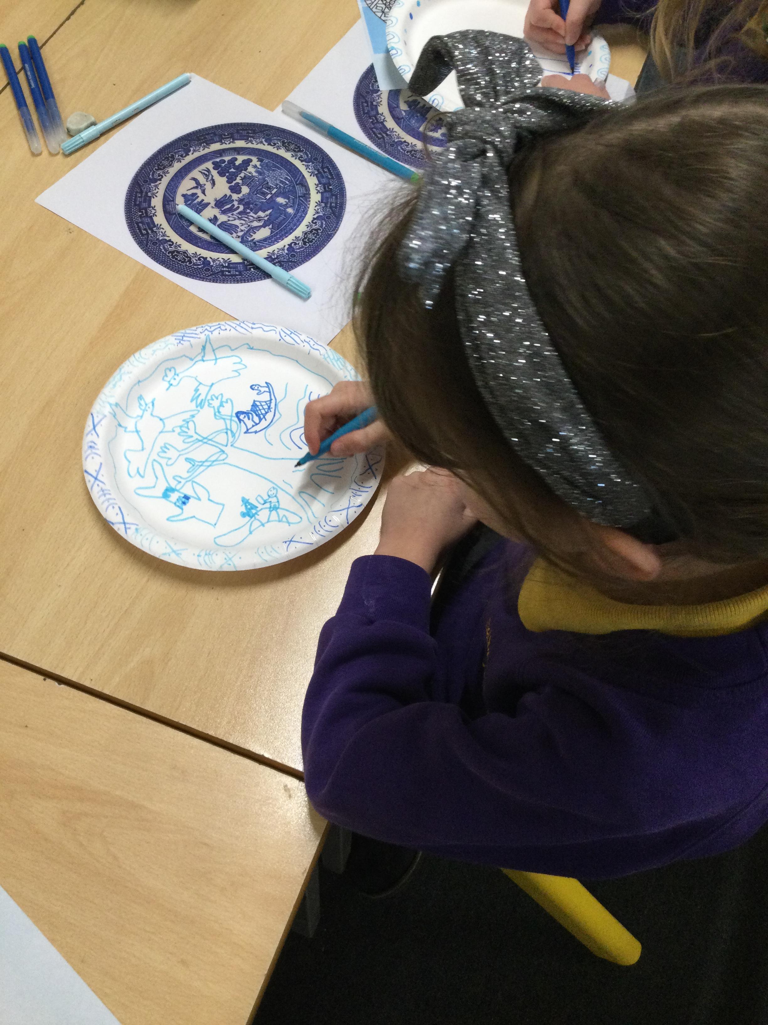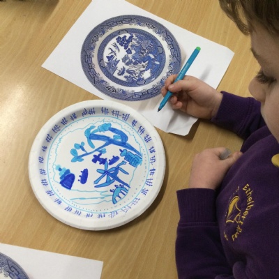 Year 2 created their own blue and white art inspired by the story of The Willow Pattern Plate.