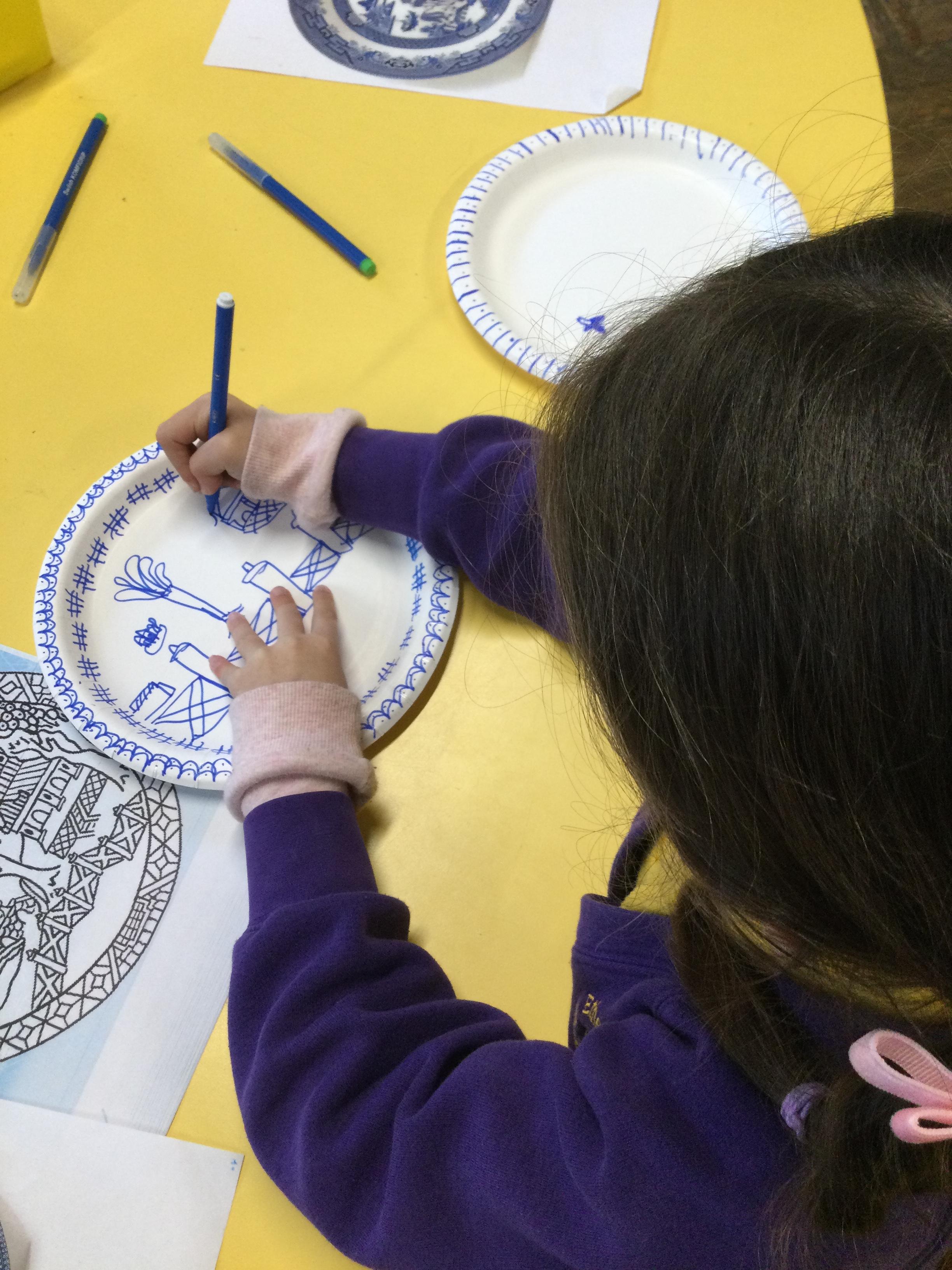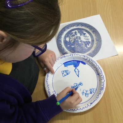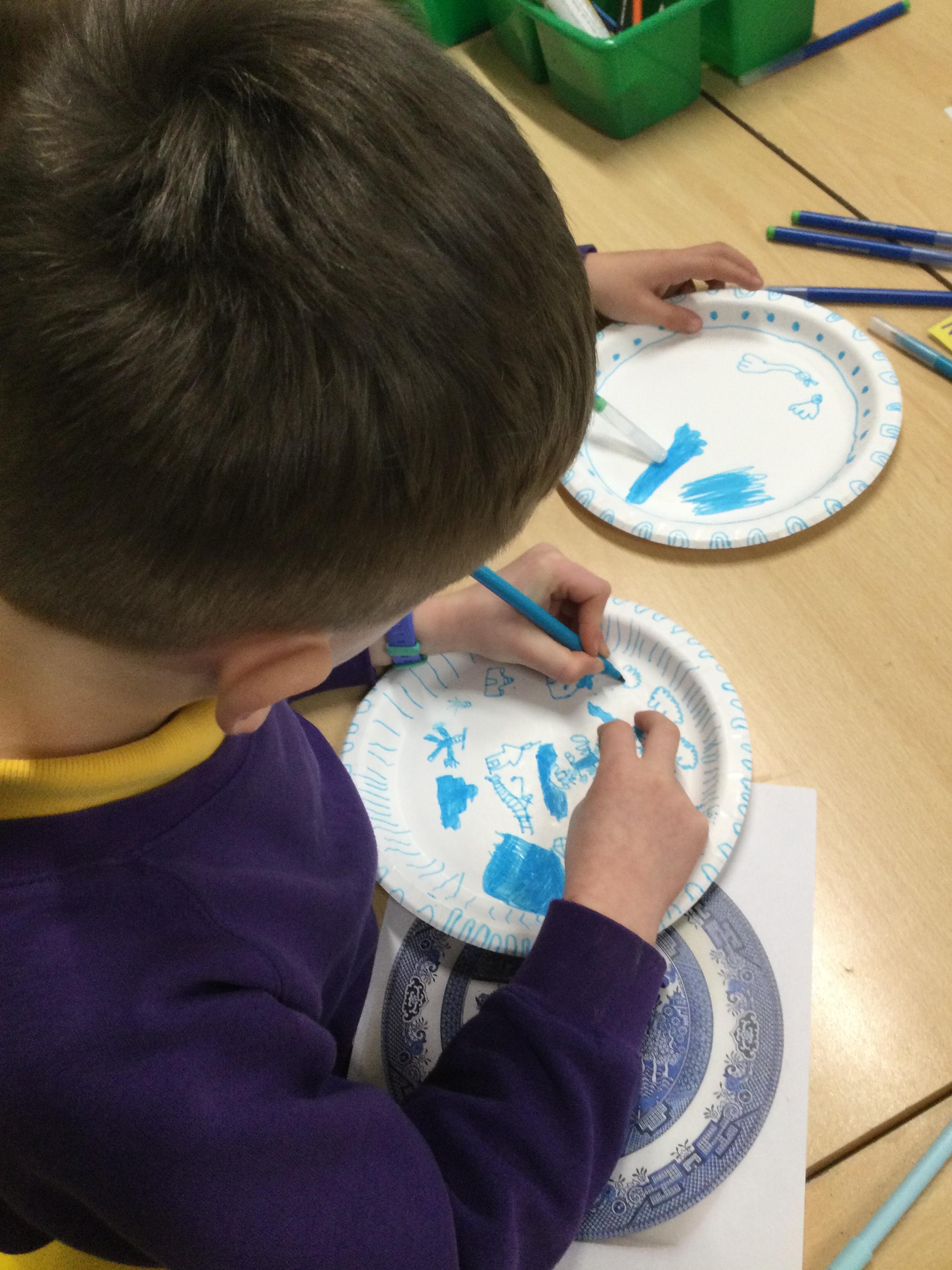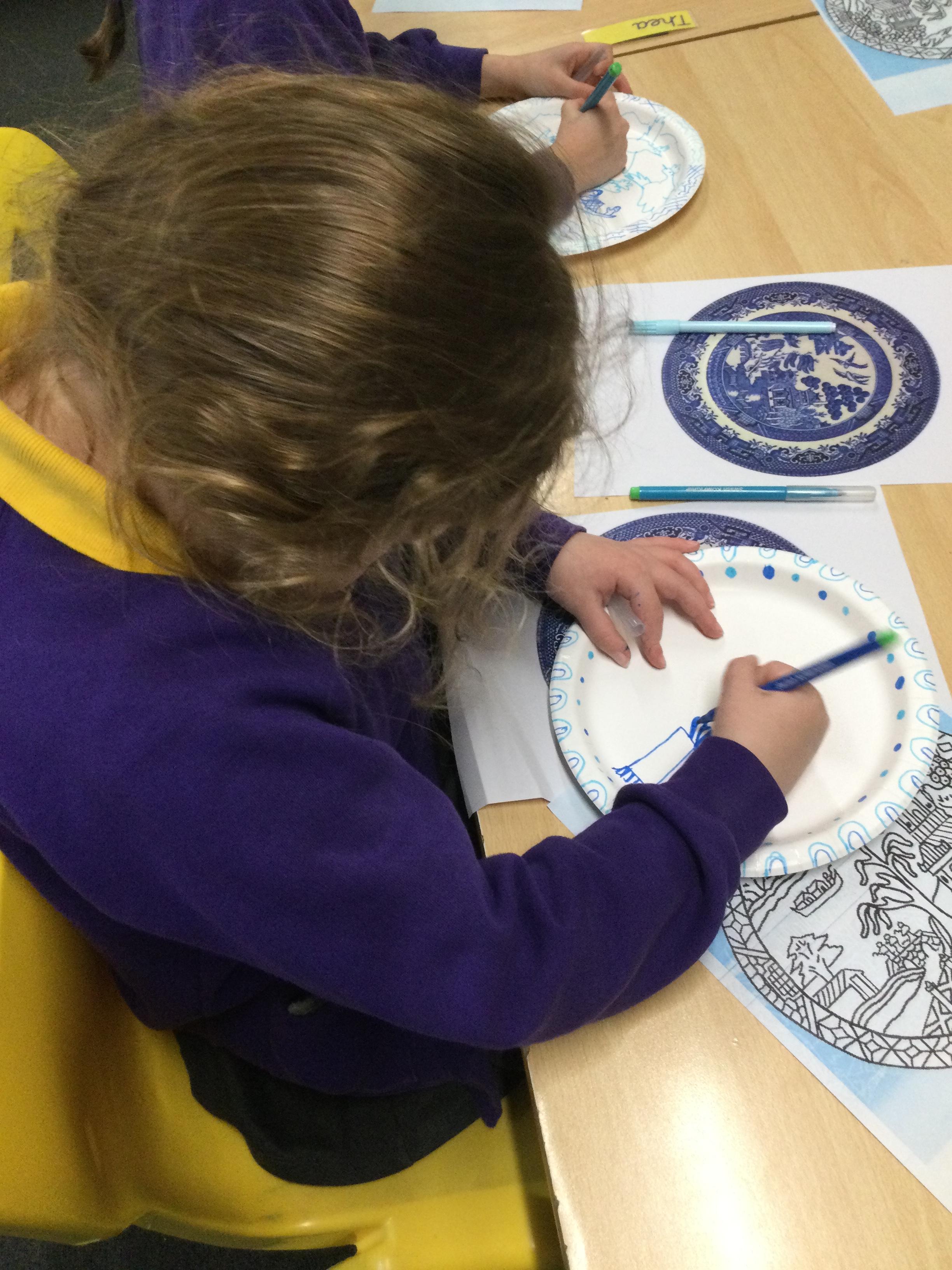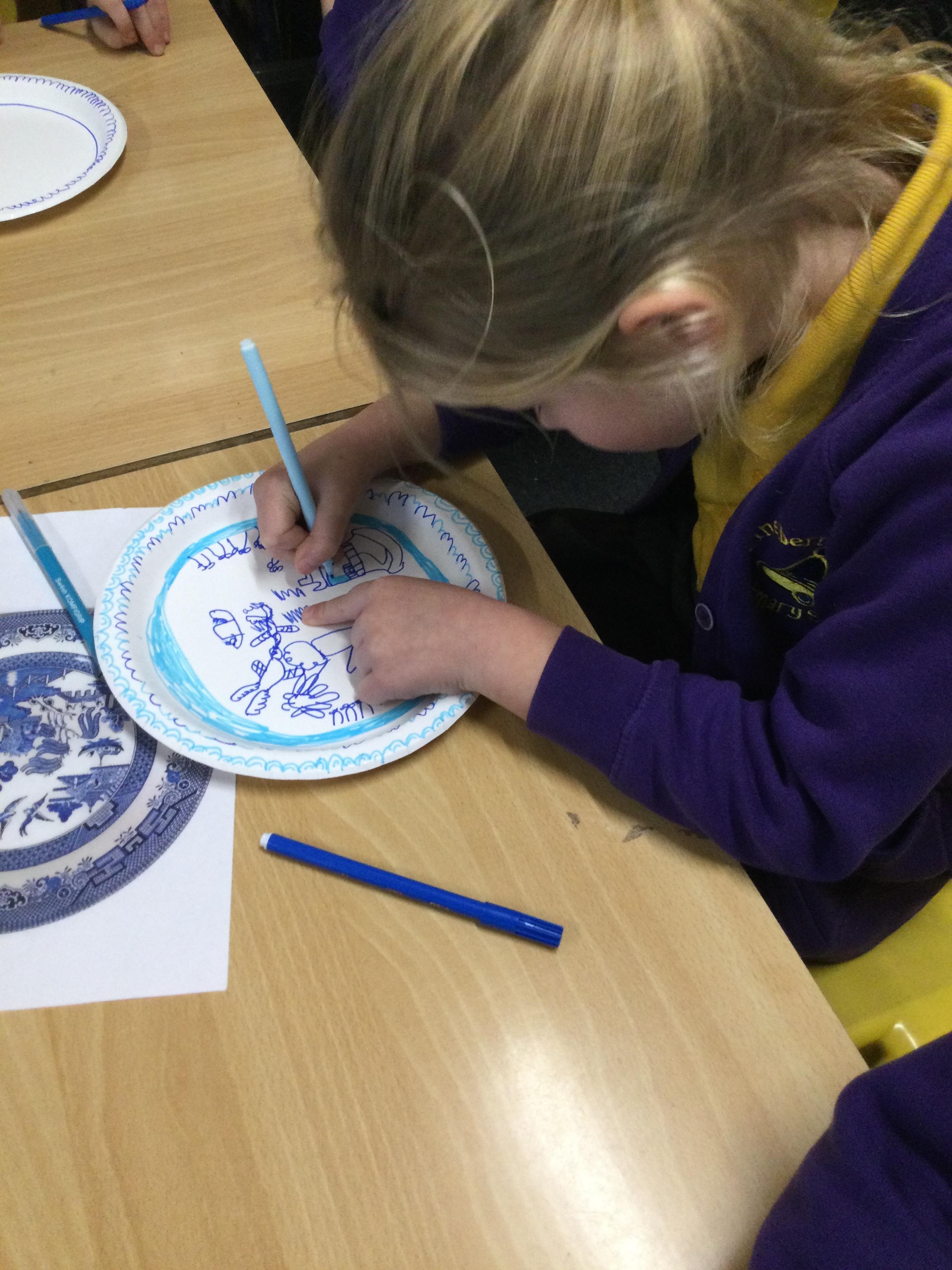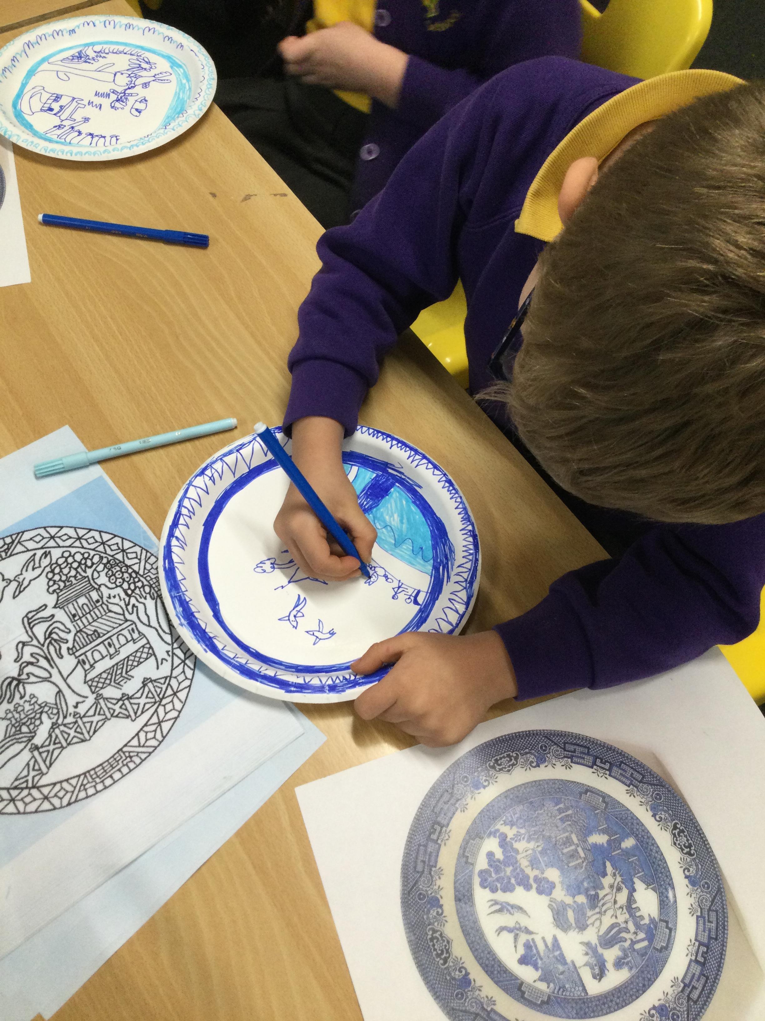 Year 2 created their own blue and white art inspired by the story of The Willow Pattern Plate.