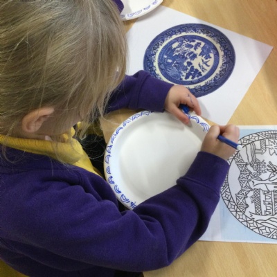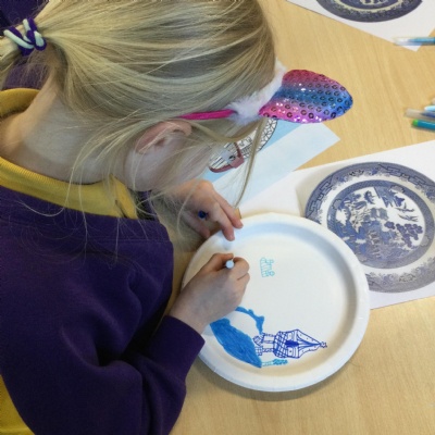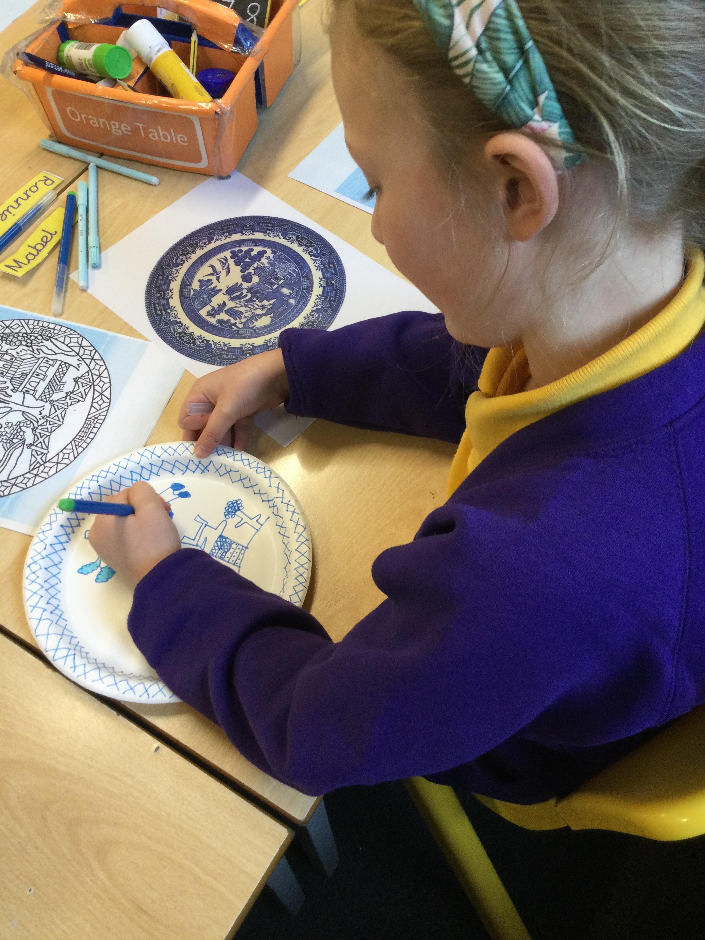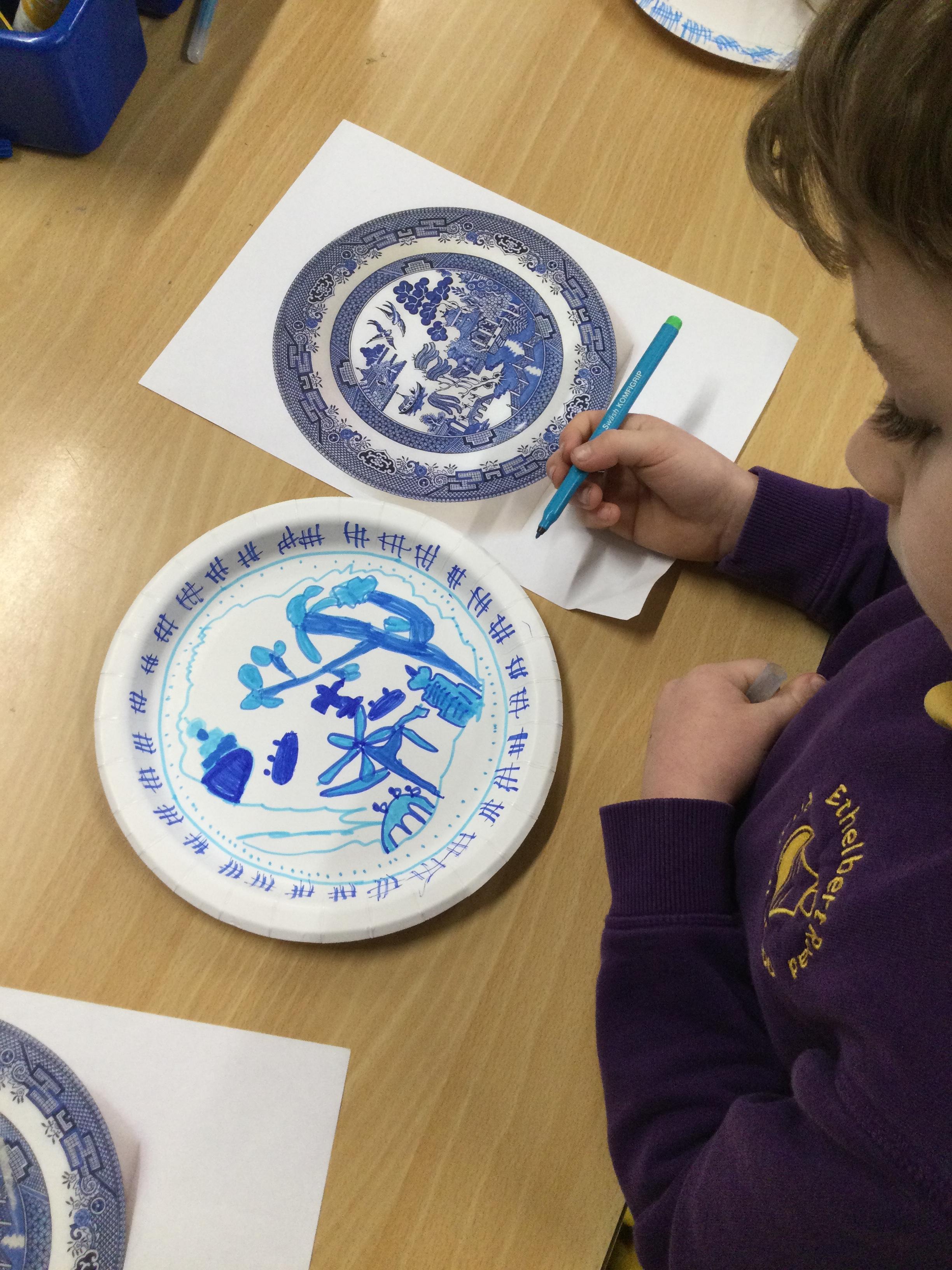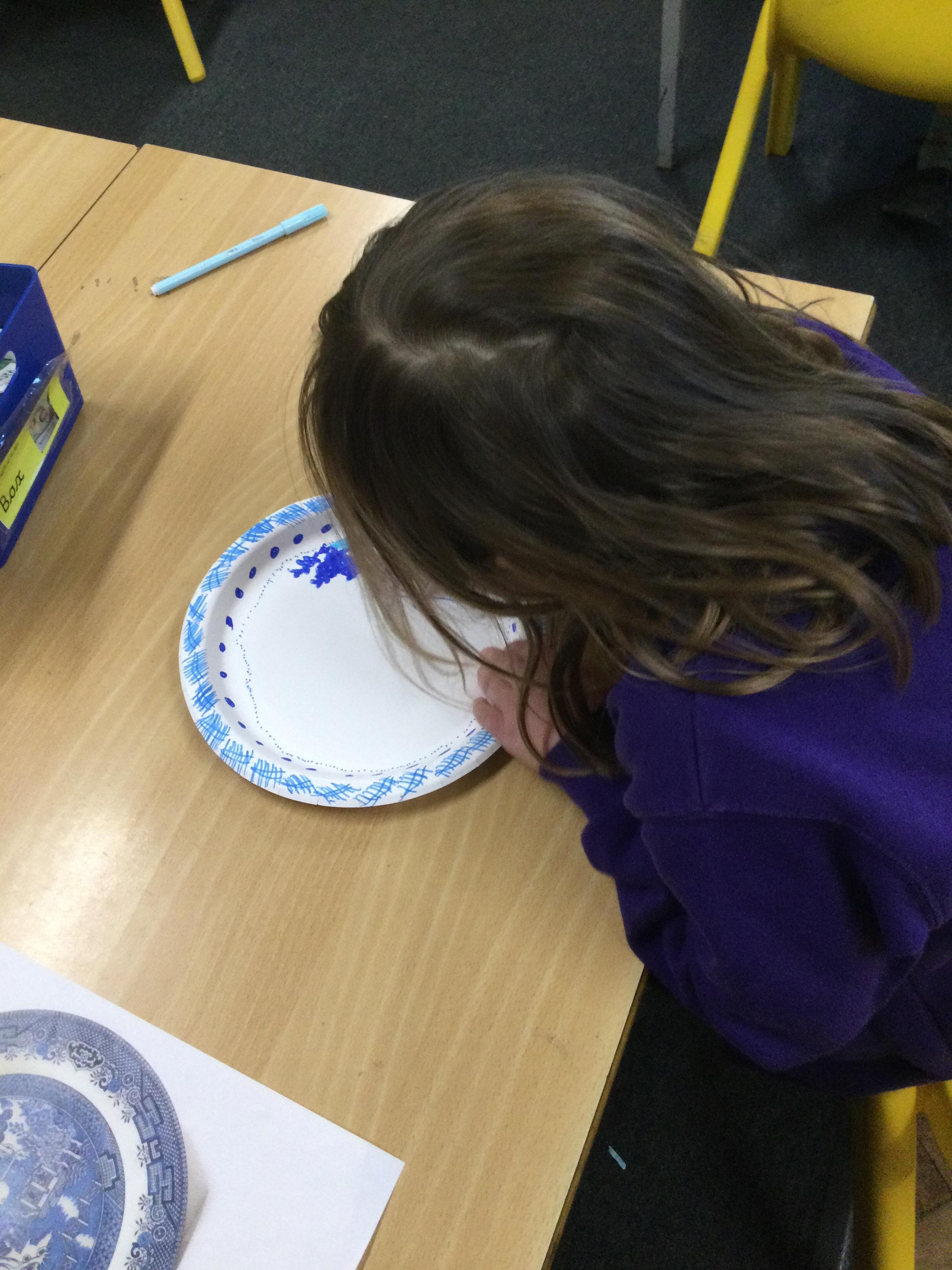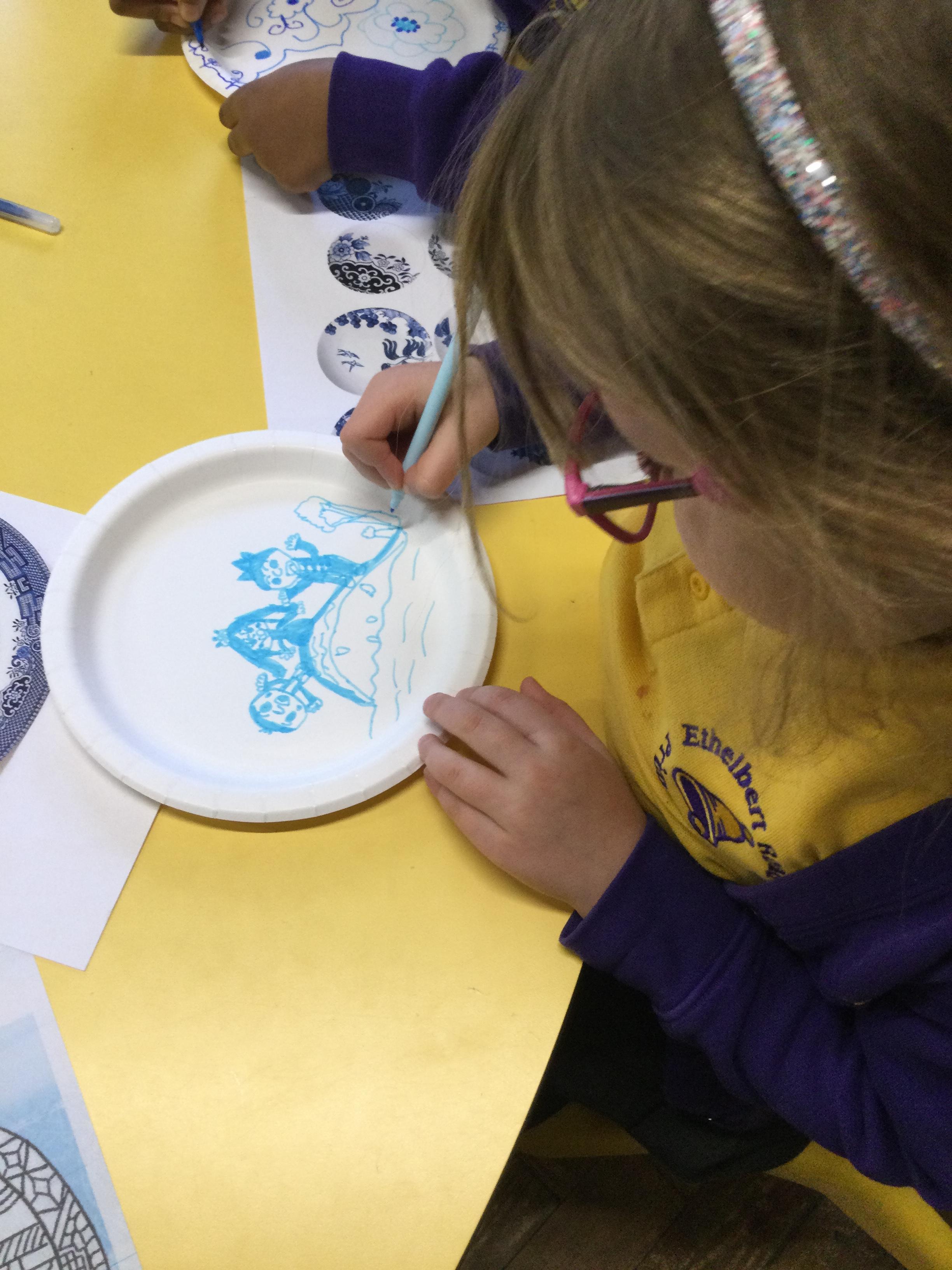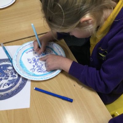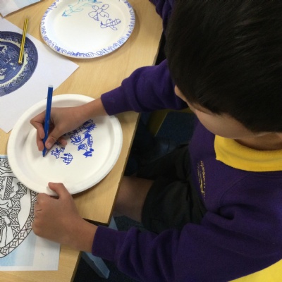Year 2 created their own blue and white art inspired by the story of The Willow Pattern Plate.