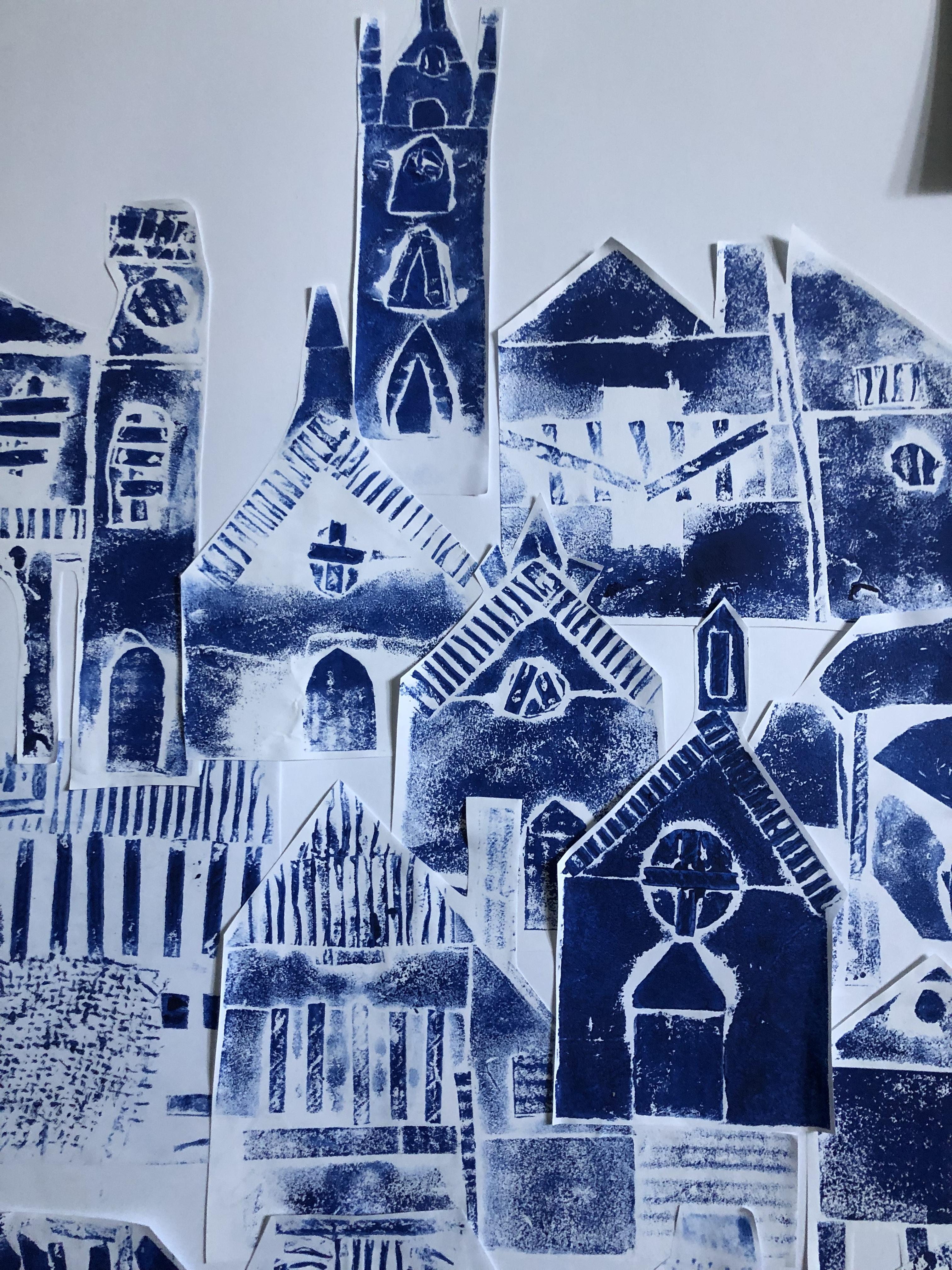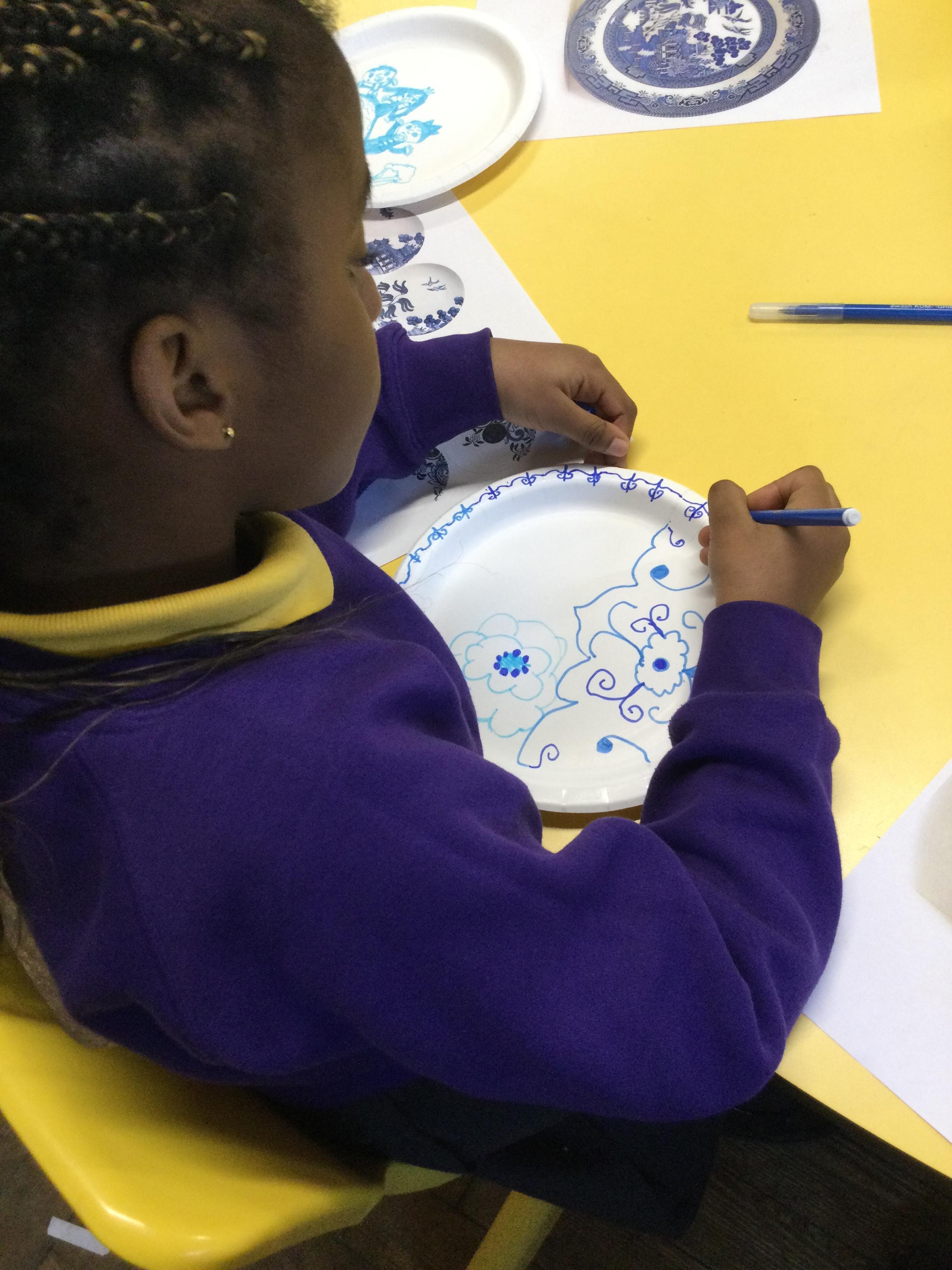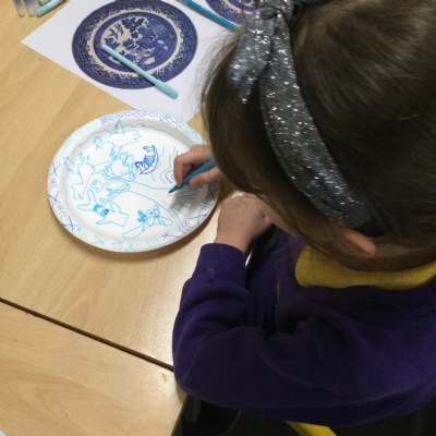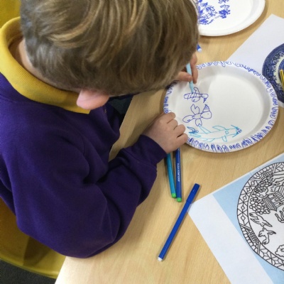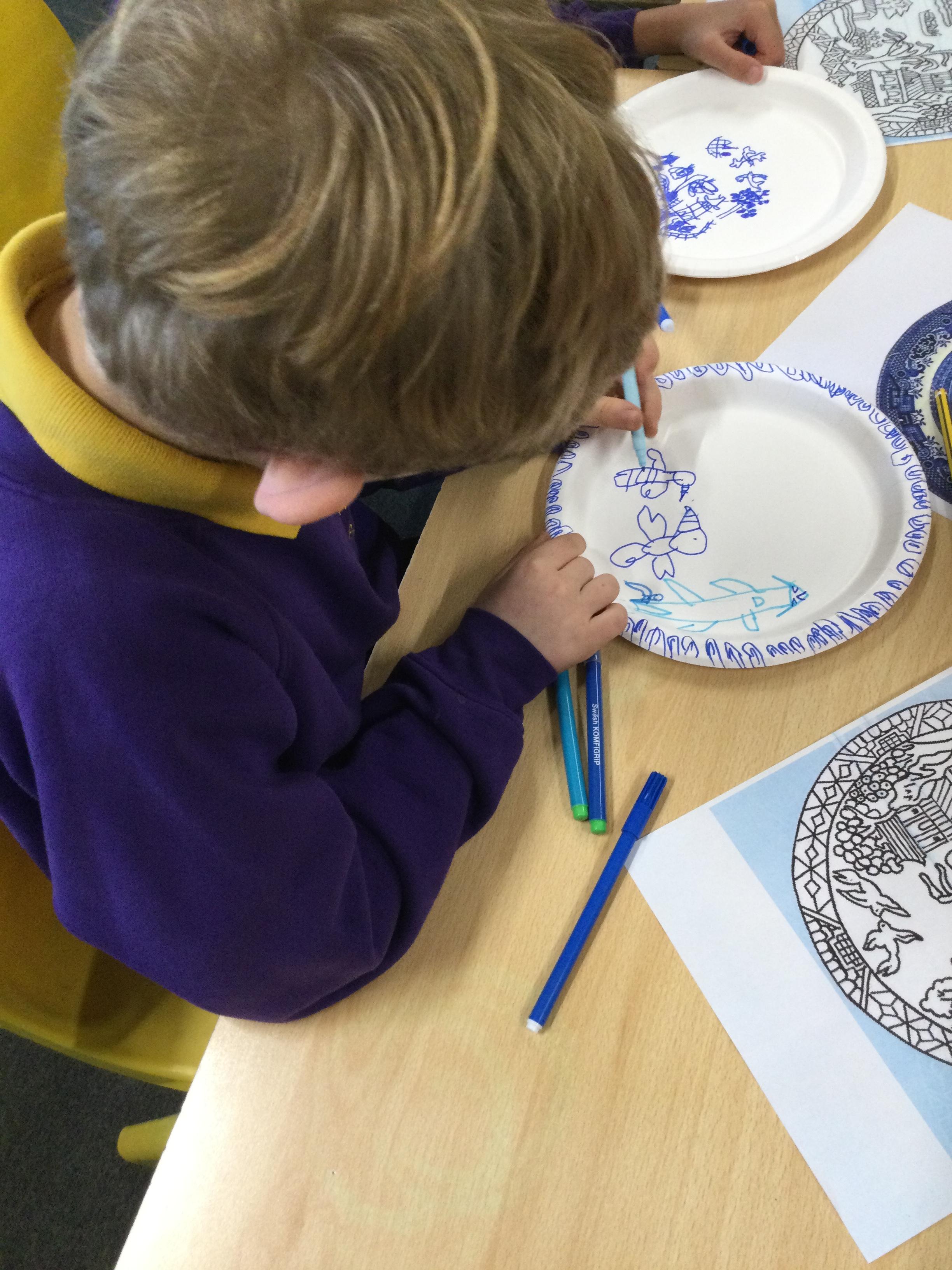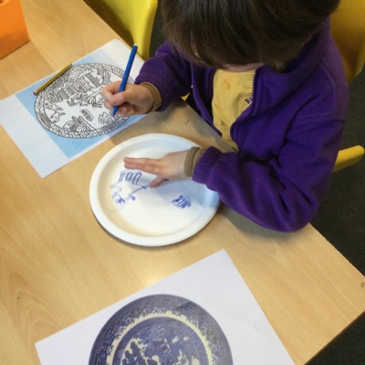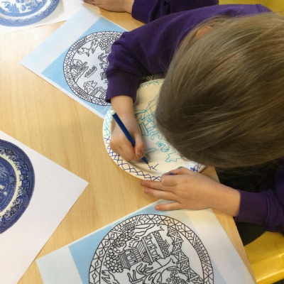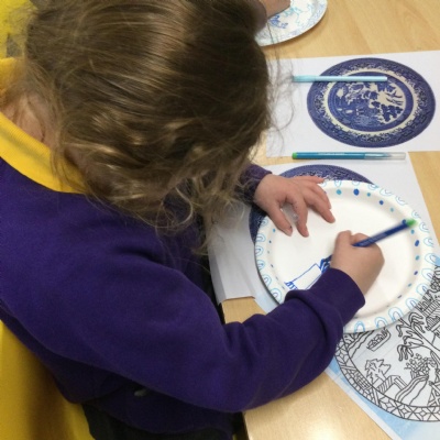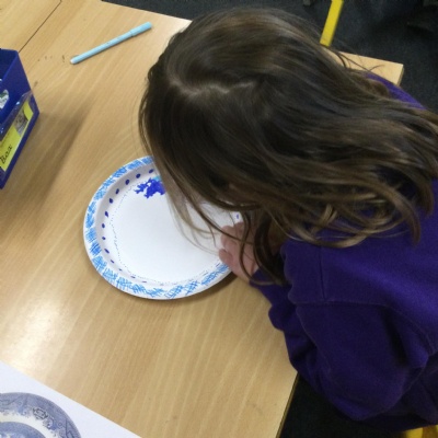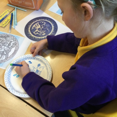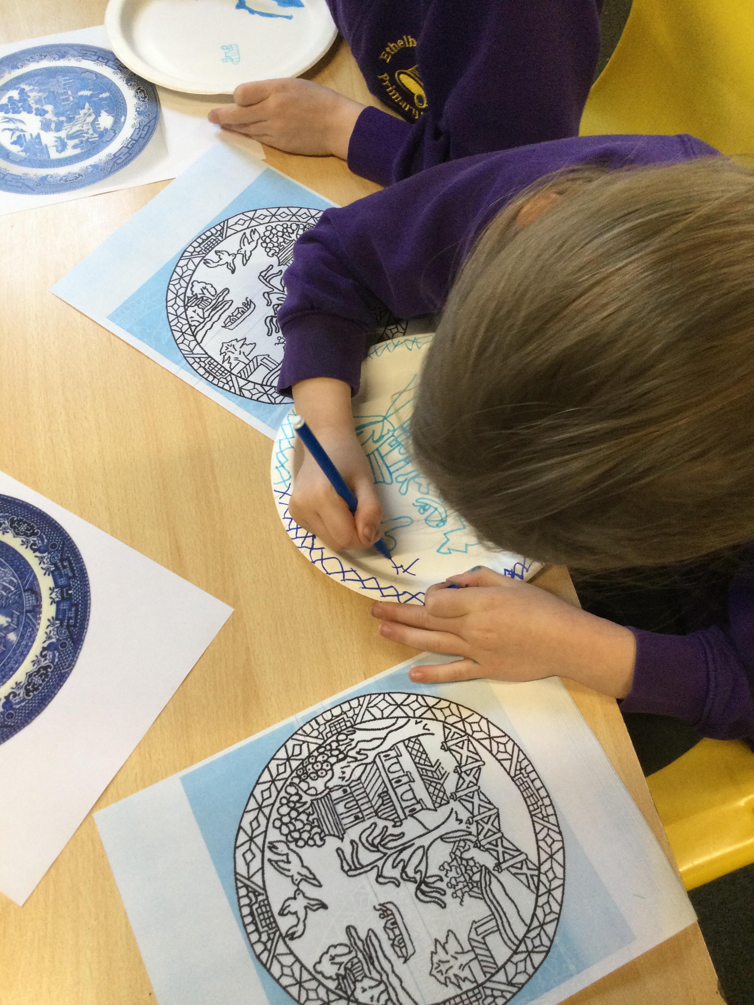 Year 2 created their own blue and white art inspired by the story of The Willow Pattern Plate.