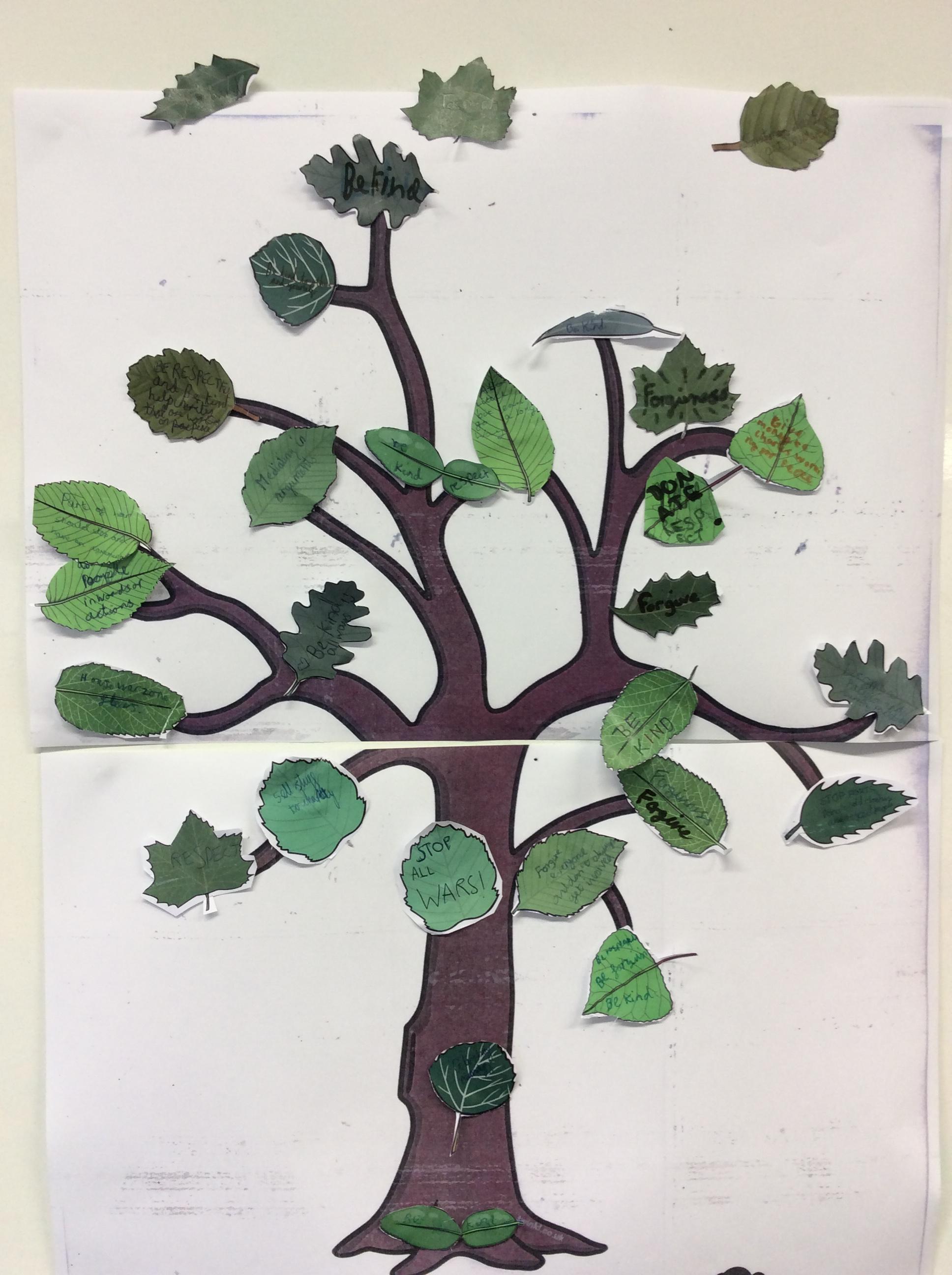 Year 6 made a peace tree, writing things we can do to bring peace on each leaf and combining them into a whole class peace tree.