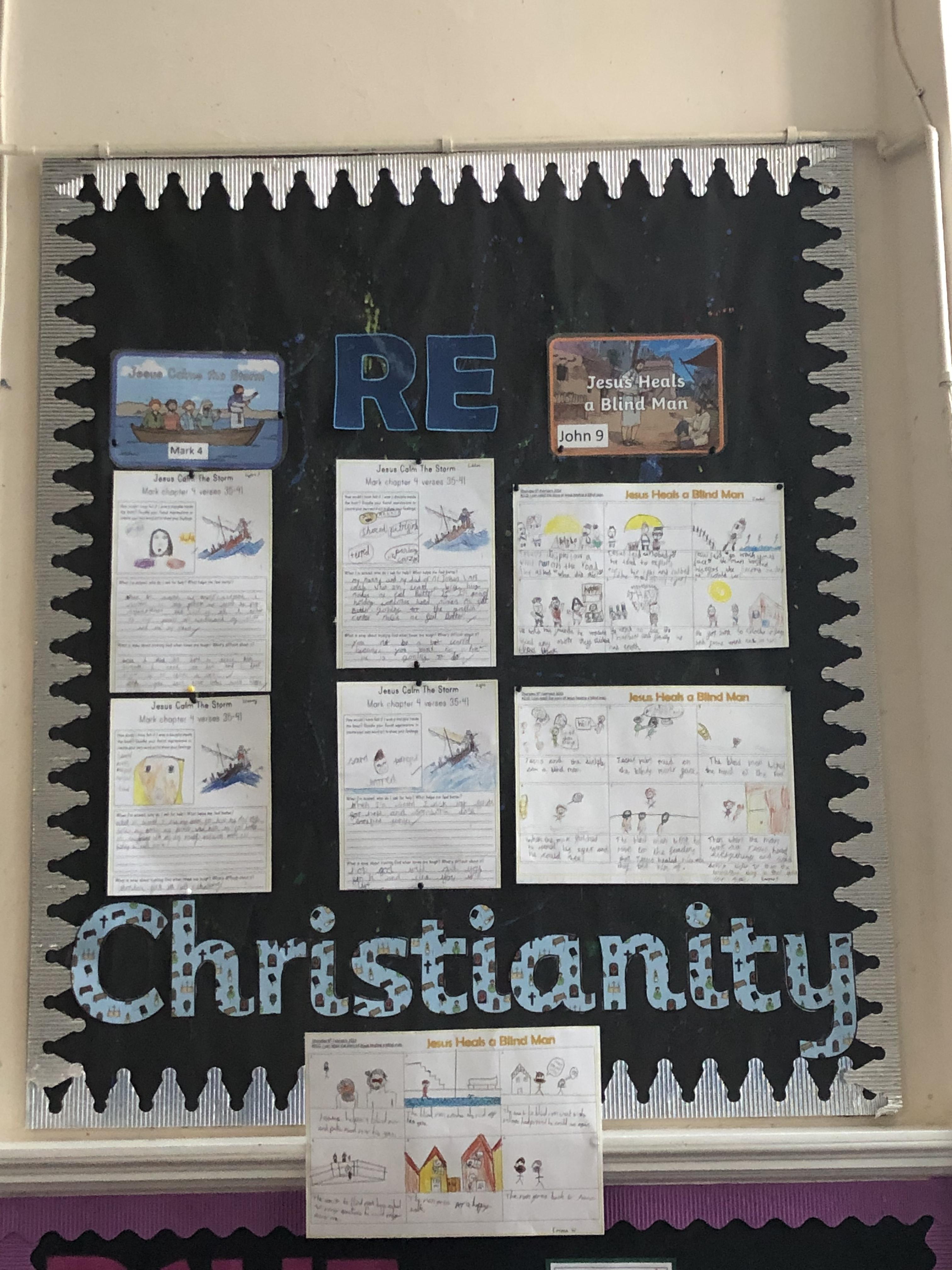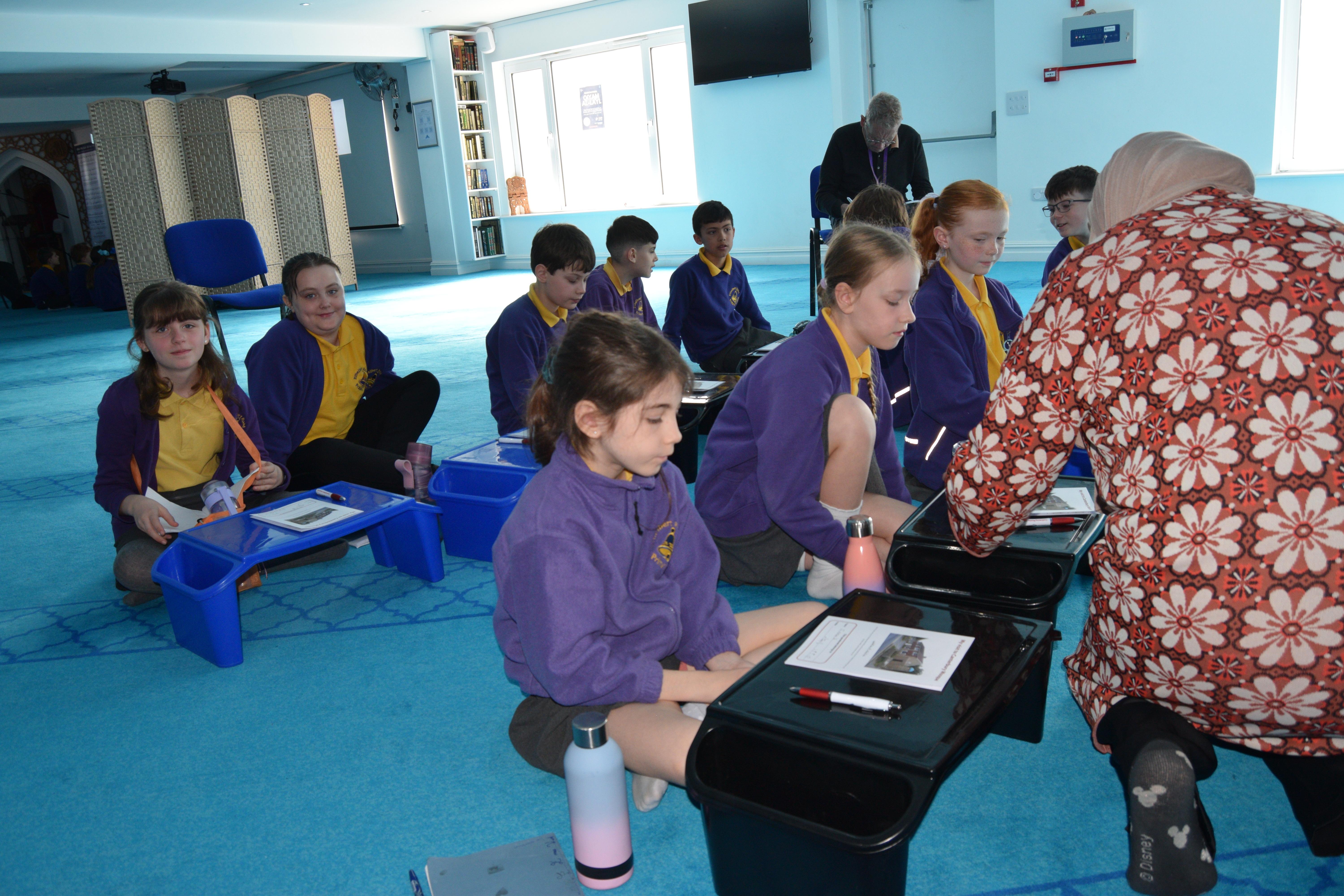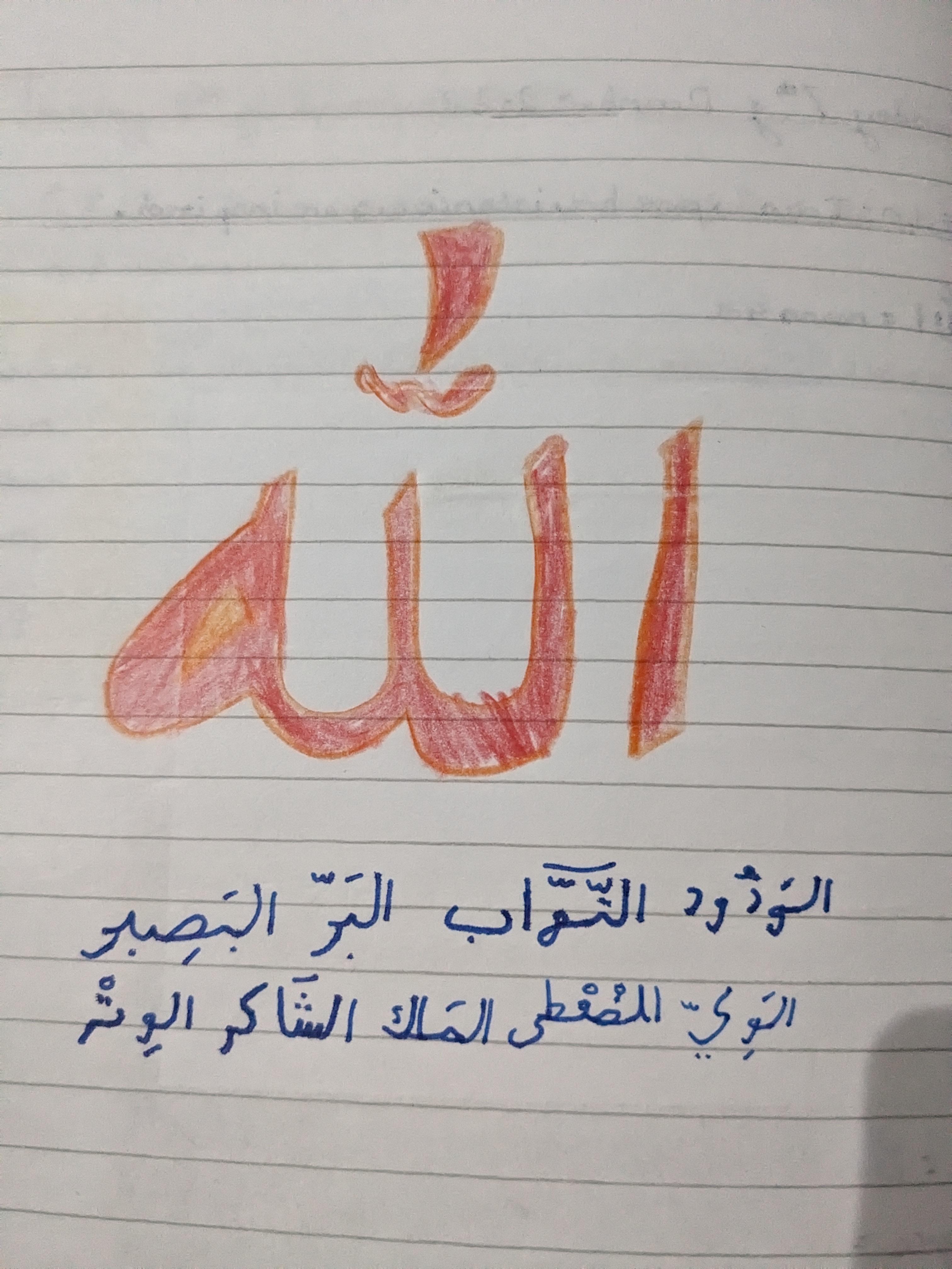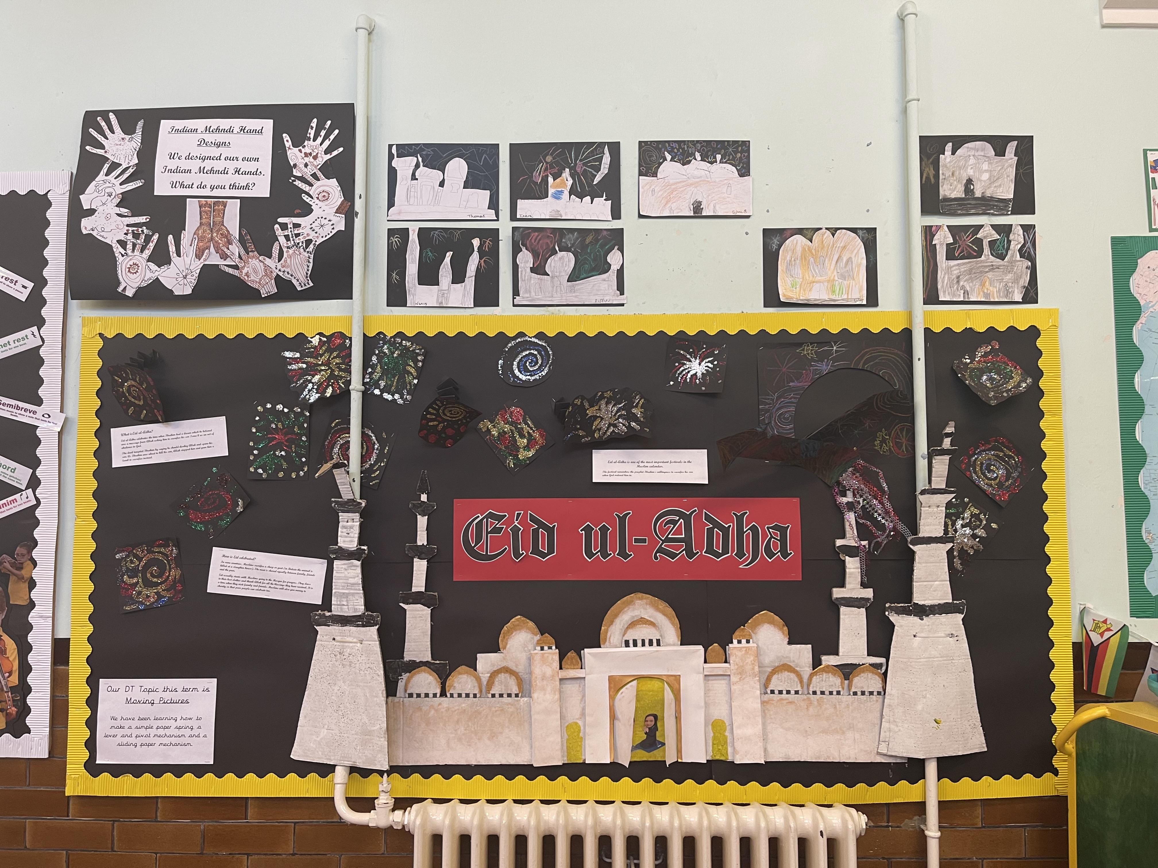 Last term years 5 and 6 explored Christian and Islamic art. As part of this learning we learned that most Islamic art is made with calligraphy and does not include pictures of people. The children then used the 99 names of Allah to make their own Islamic art.