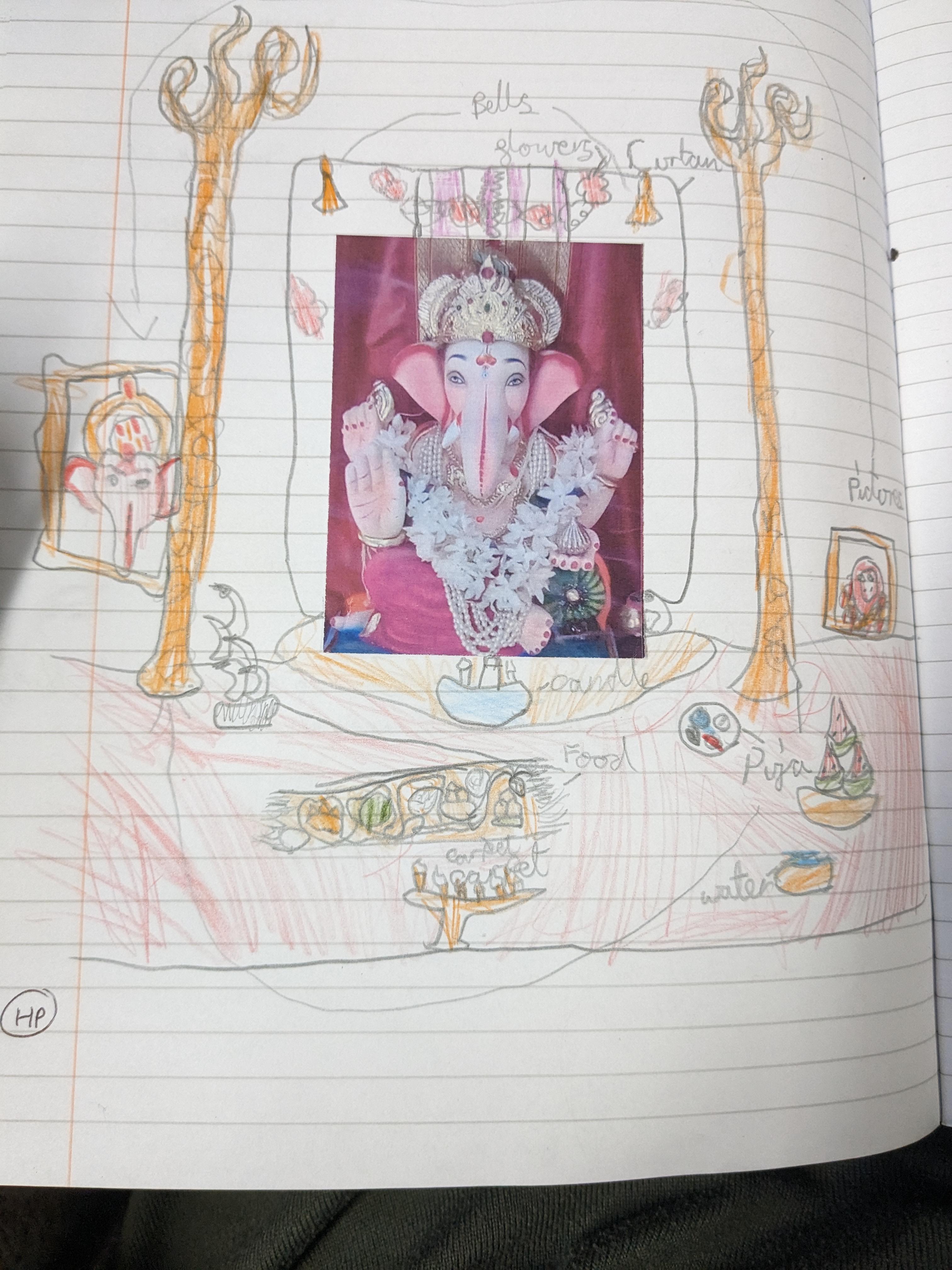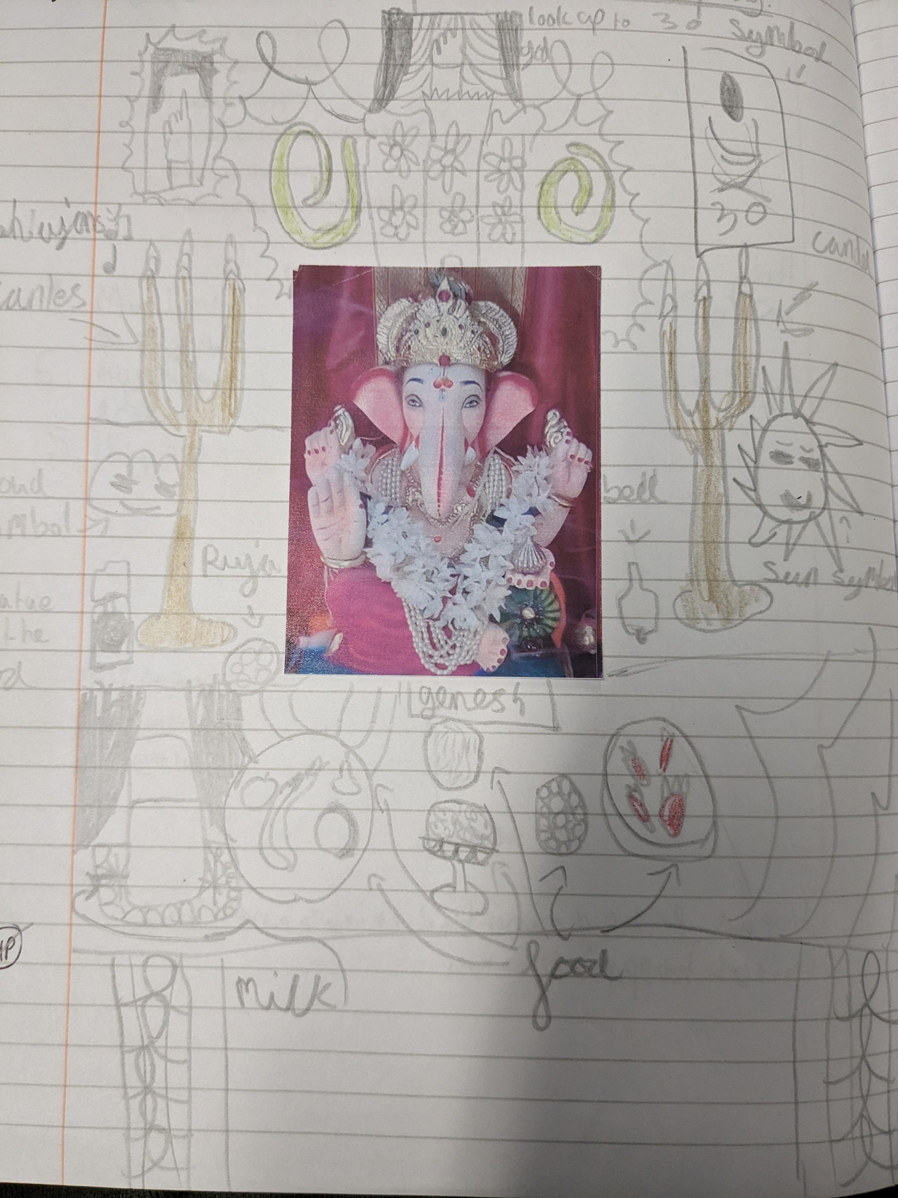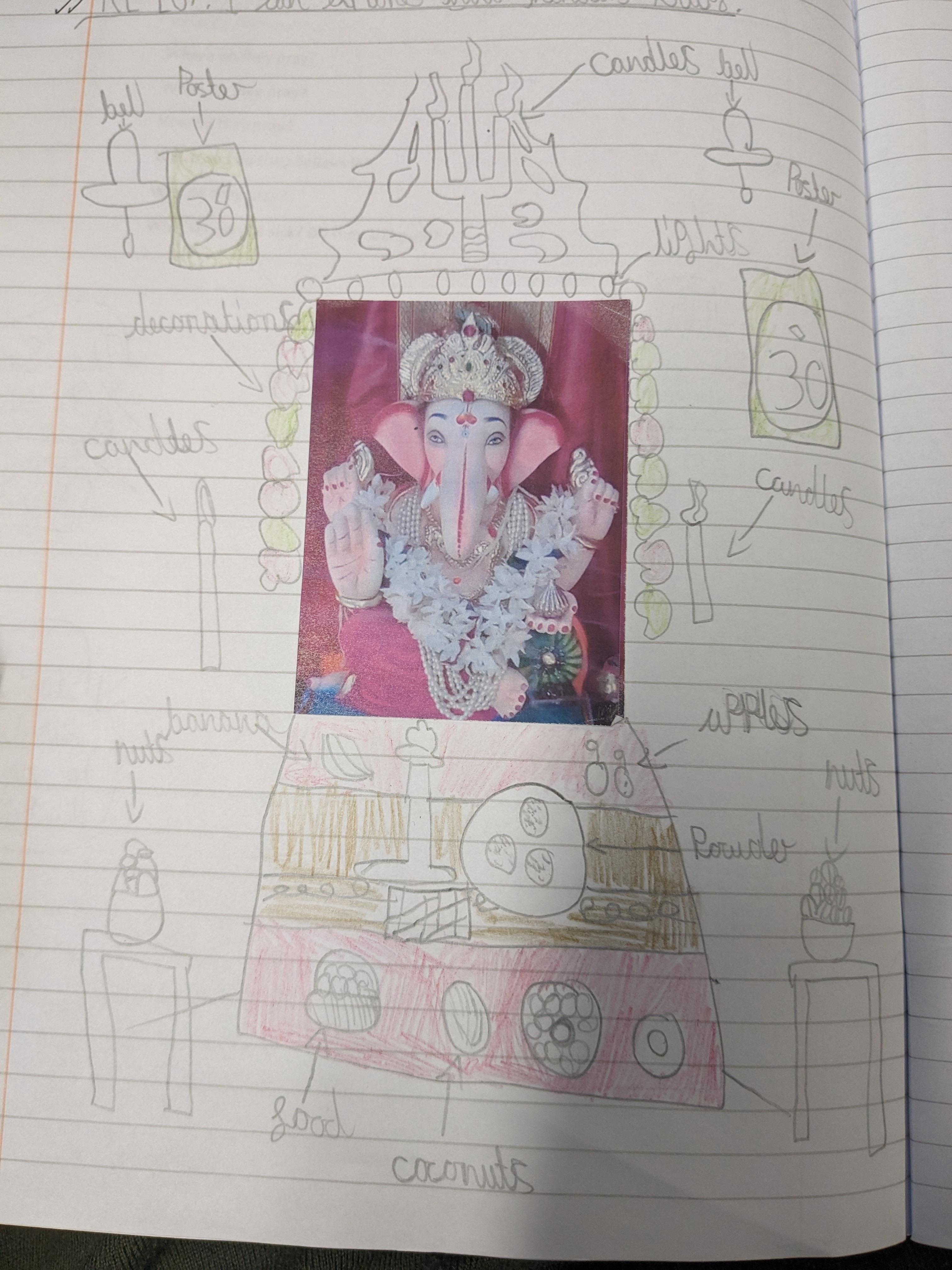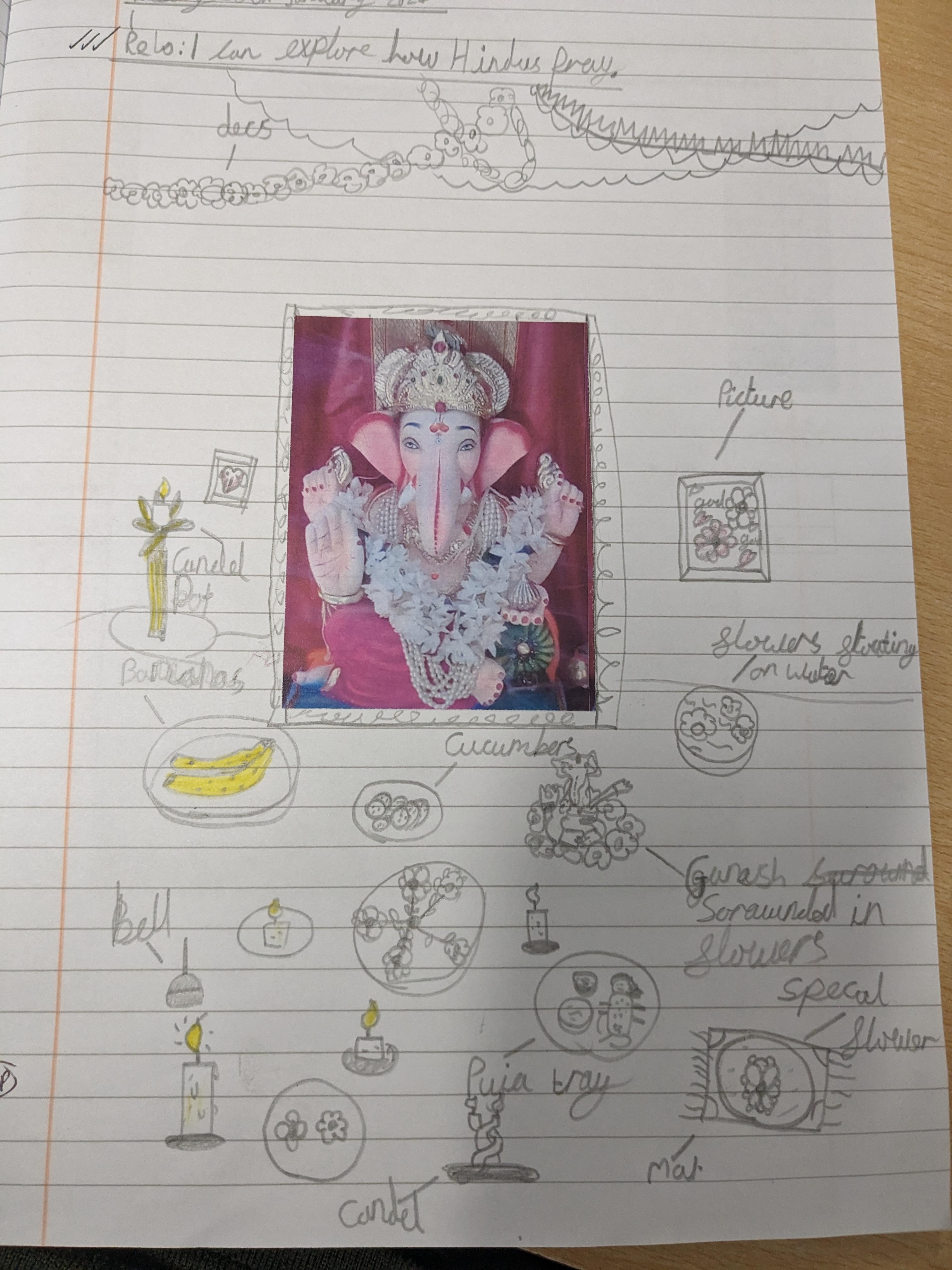 This term Year 3 have been looking at the question, 'Why do we pray?' We have looked at how Christians, Muslims and Hindus pray, as well as thinking about our own thoughts and feelings surrounding prayer and what we think it is. When learning about how Hindus pray we learned about Hindu shrines and the children drew around a murti (statue) of the god Ganesh to show their learning about the variety of items that may be found in a Hindo shrine.