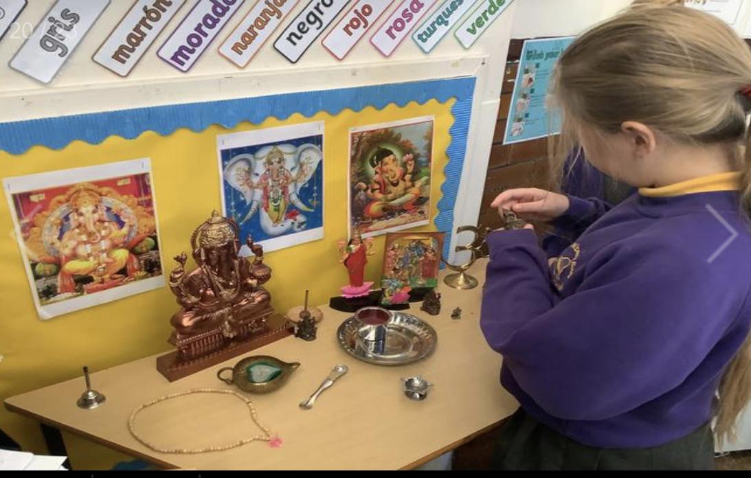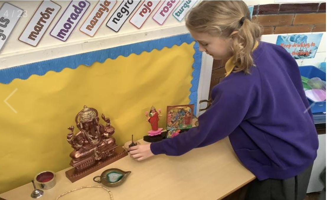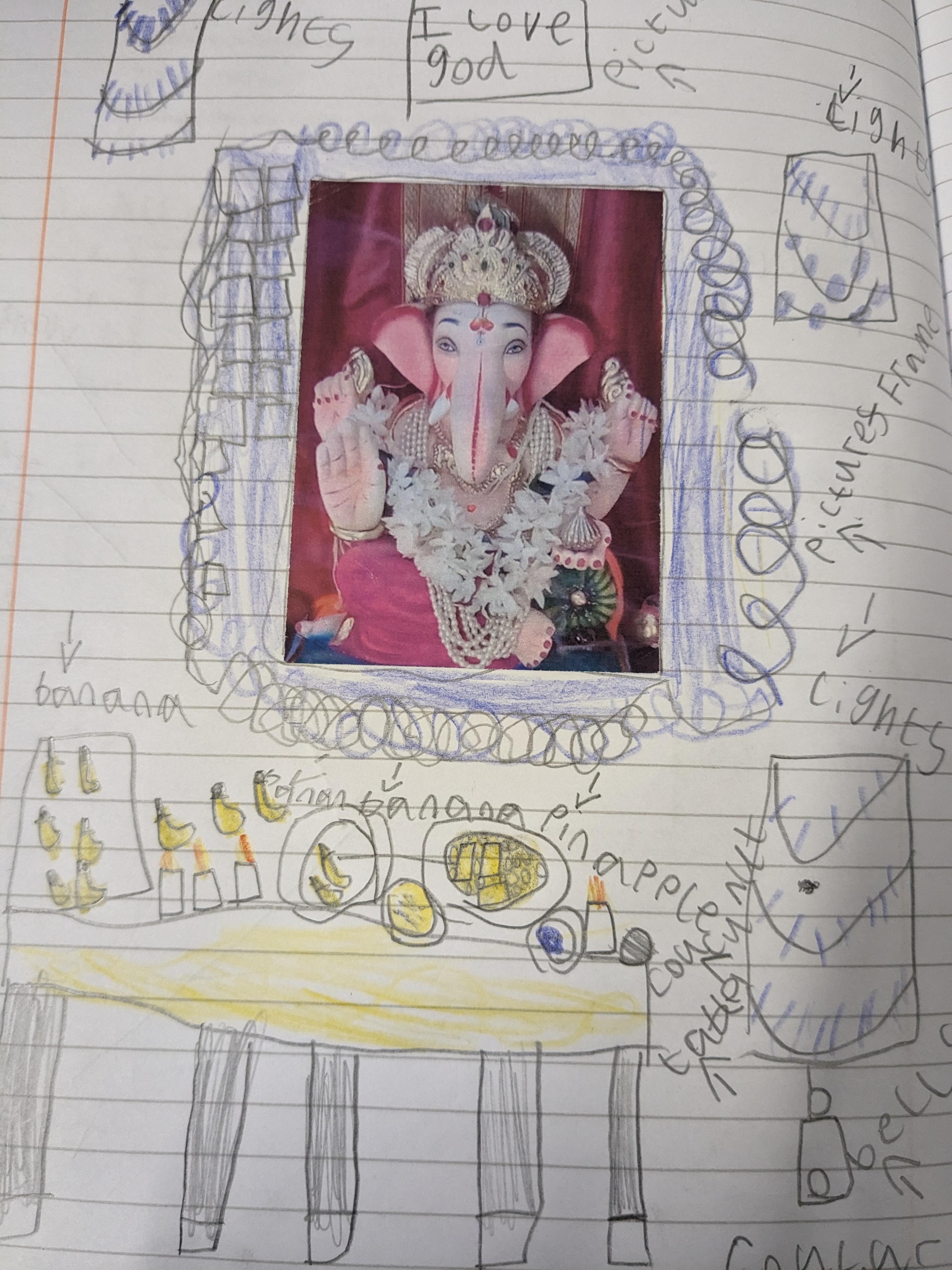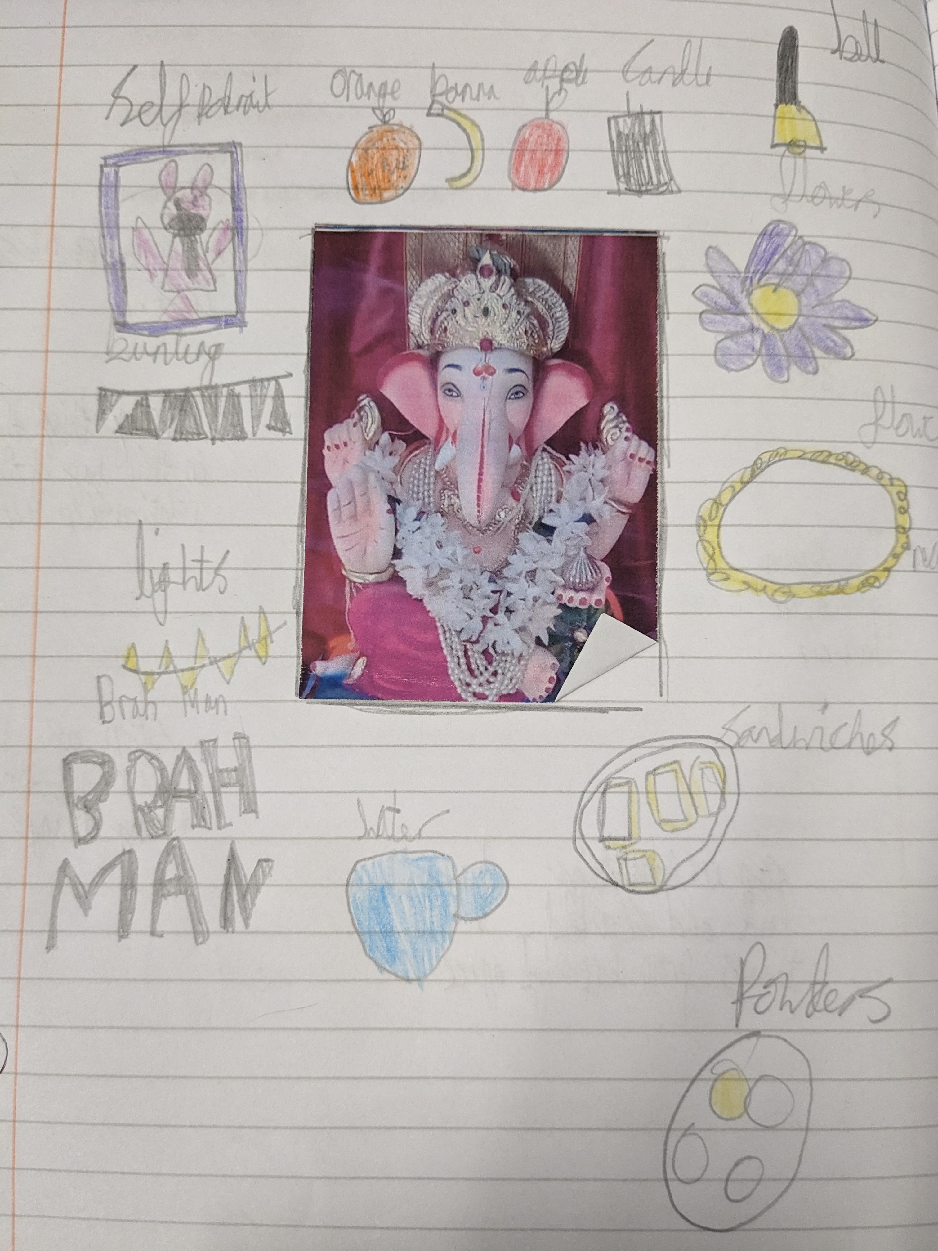 This term Year 3 have been looking at the question, 'Why do we pray?' We have looked at how Christians, Muslims and Hindus pray, as well as thinking about our own thoughts and feelings surrounding prayer and what we think it is. When learning about how Hindus pray we learned about Hindu shrines and the children drew around a murti (statue) of the god Ganesh to show their learning about the variety of items that may be found in a Hindo shrine.